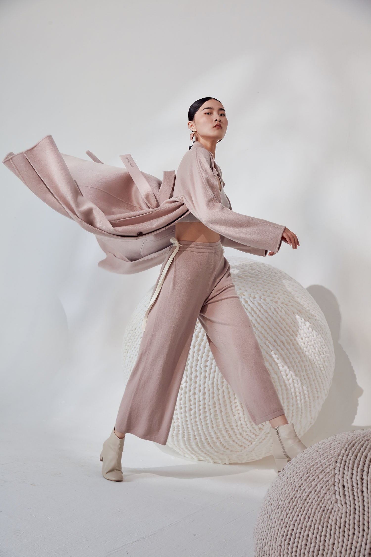 Below knee length reversible double-breasted coat with lapel collar, crafted from 100% cashmere, featuring a belt and hand-sewn hem. The resulting coat is unlined, enveloping and very light, impeccably finished inside and out.