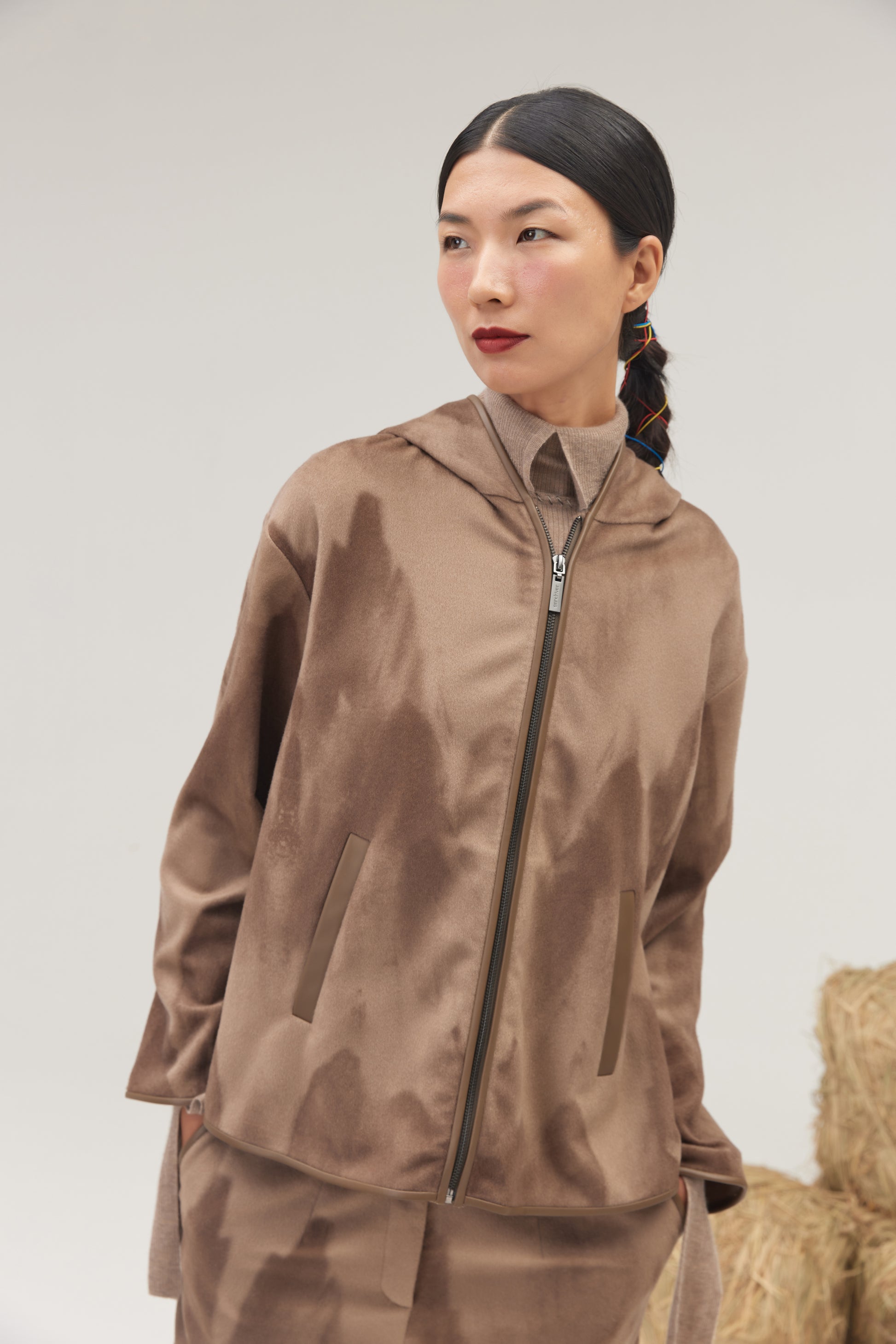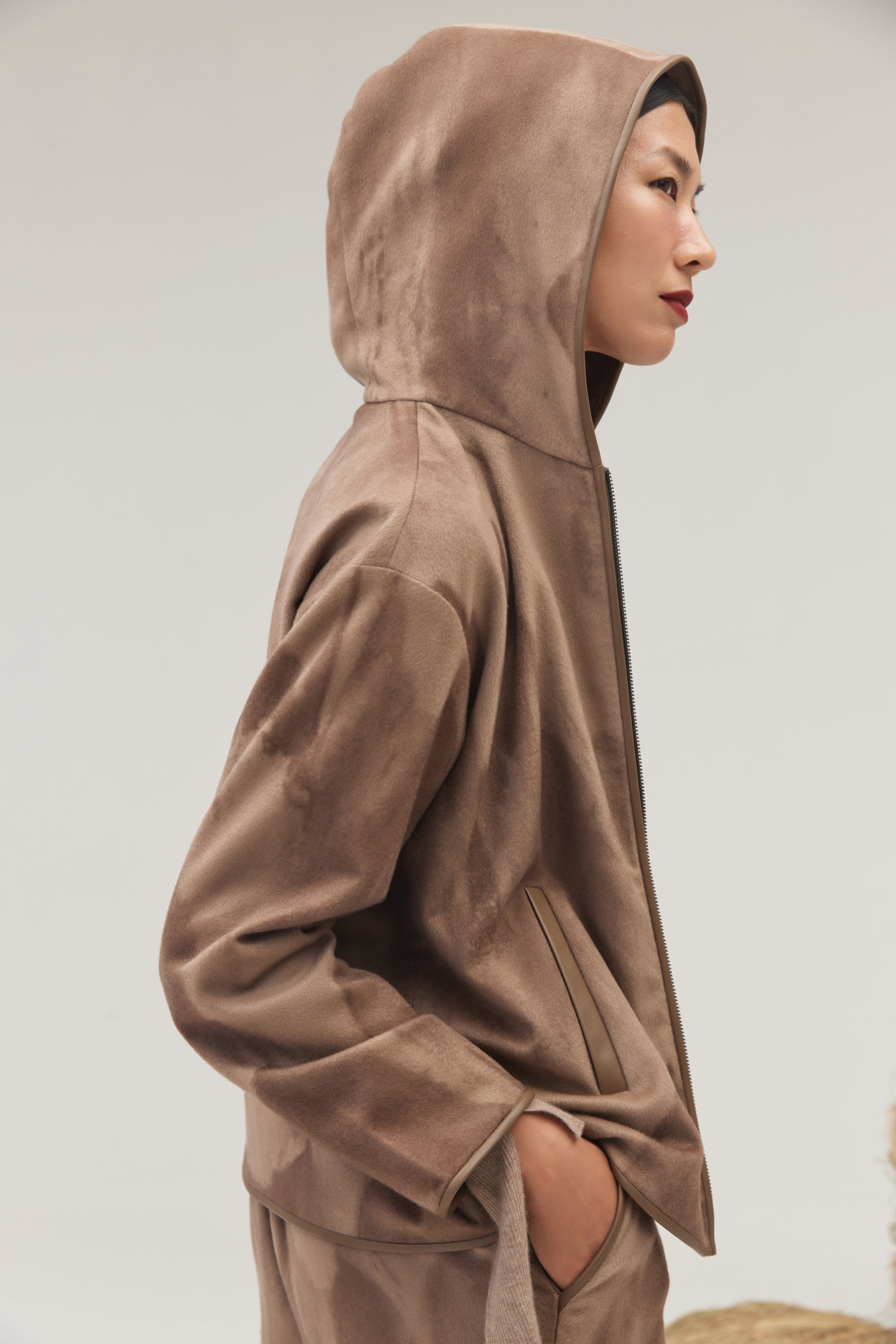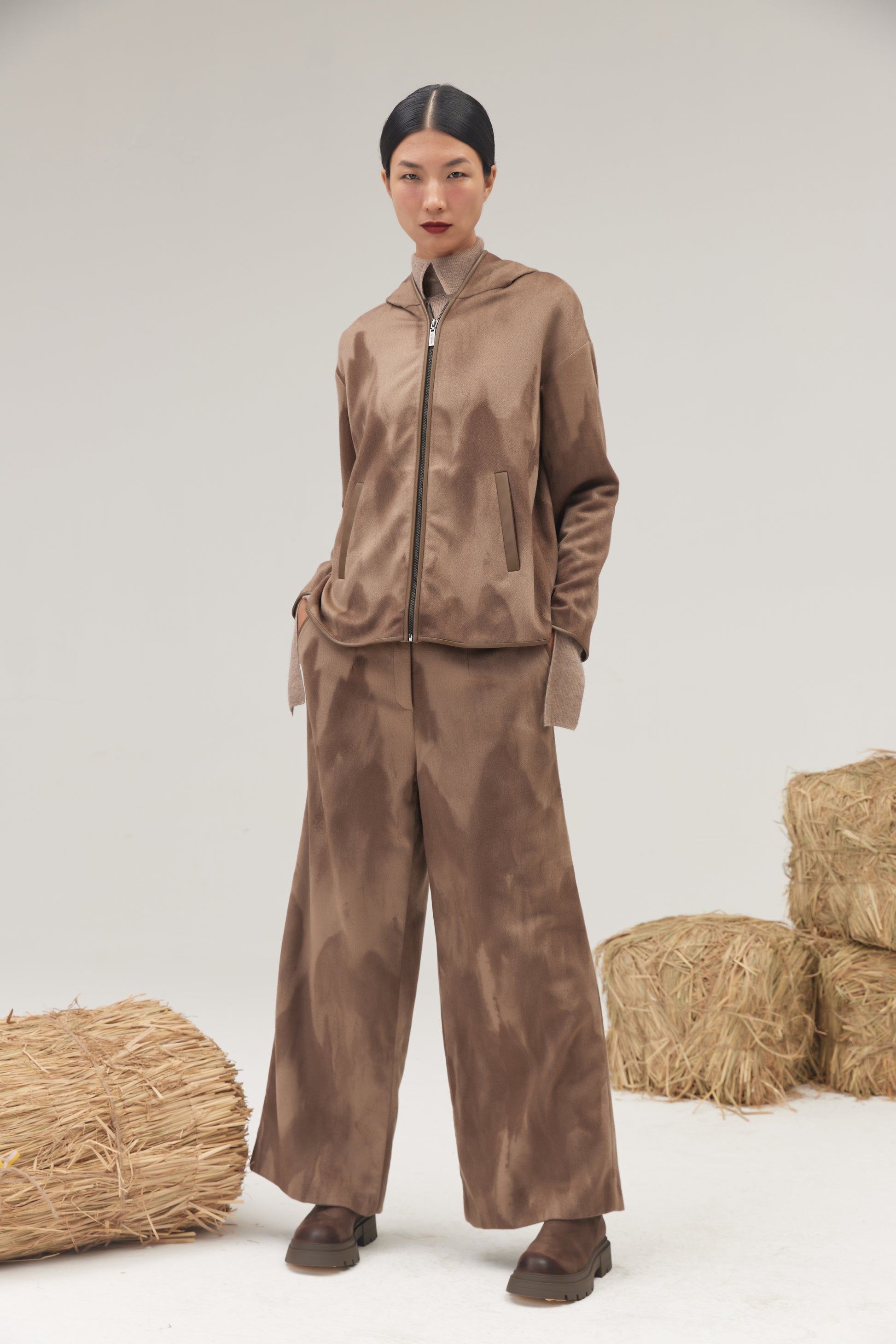 Indulge in the luxury of our 100% pure cashmere burnoose. Featuring a striking mountain print, this wild and elegant piece exudes a bohemian spirit. The same captivating pattern is also available in coordinating wide-leg pants. Our cashmere is sourced from our own natural grazing lands in Mongolia, ensuring the highest quality and sustainability.