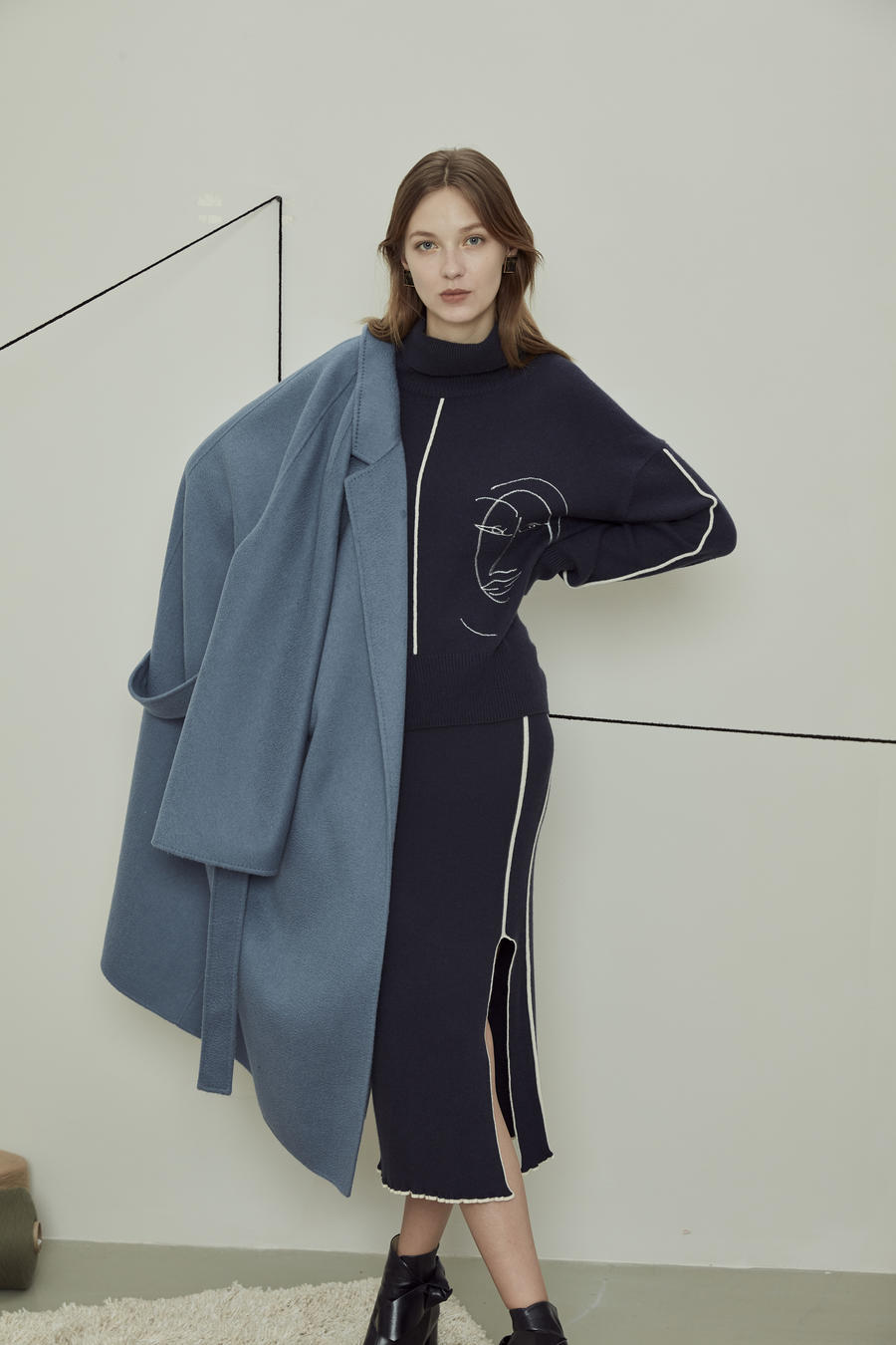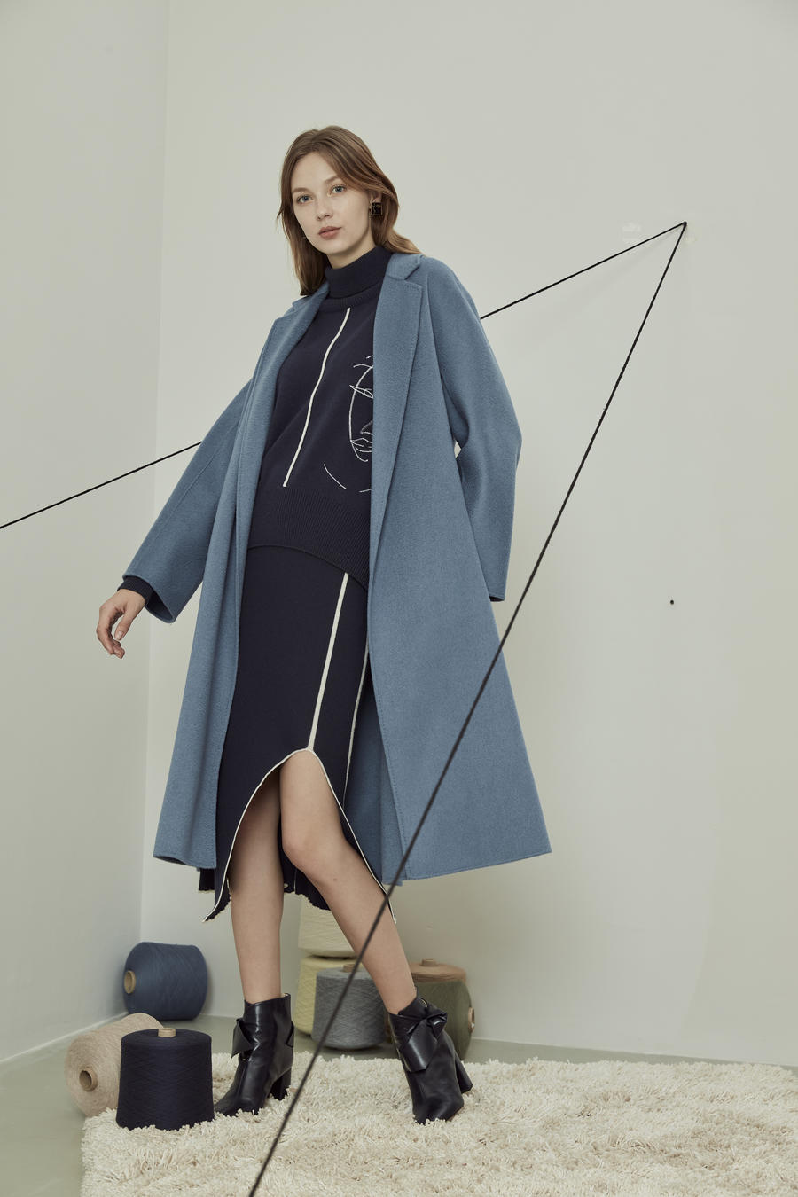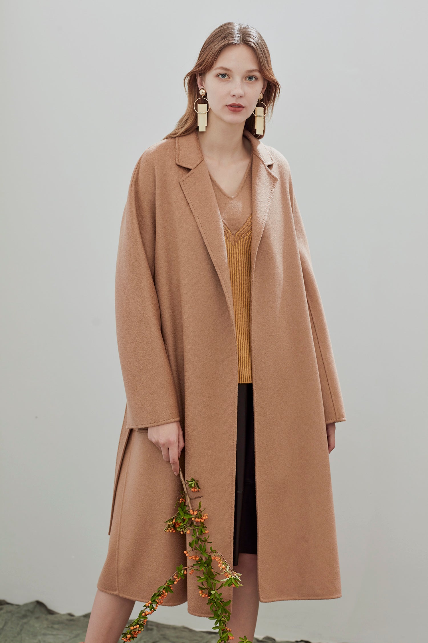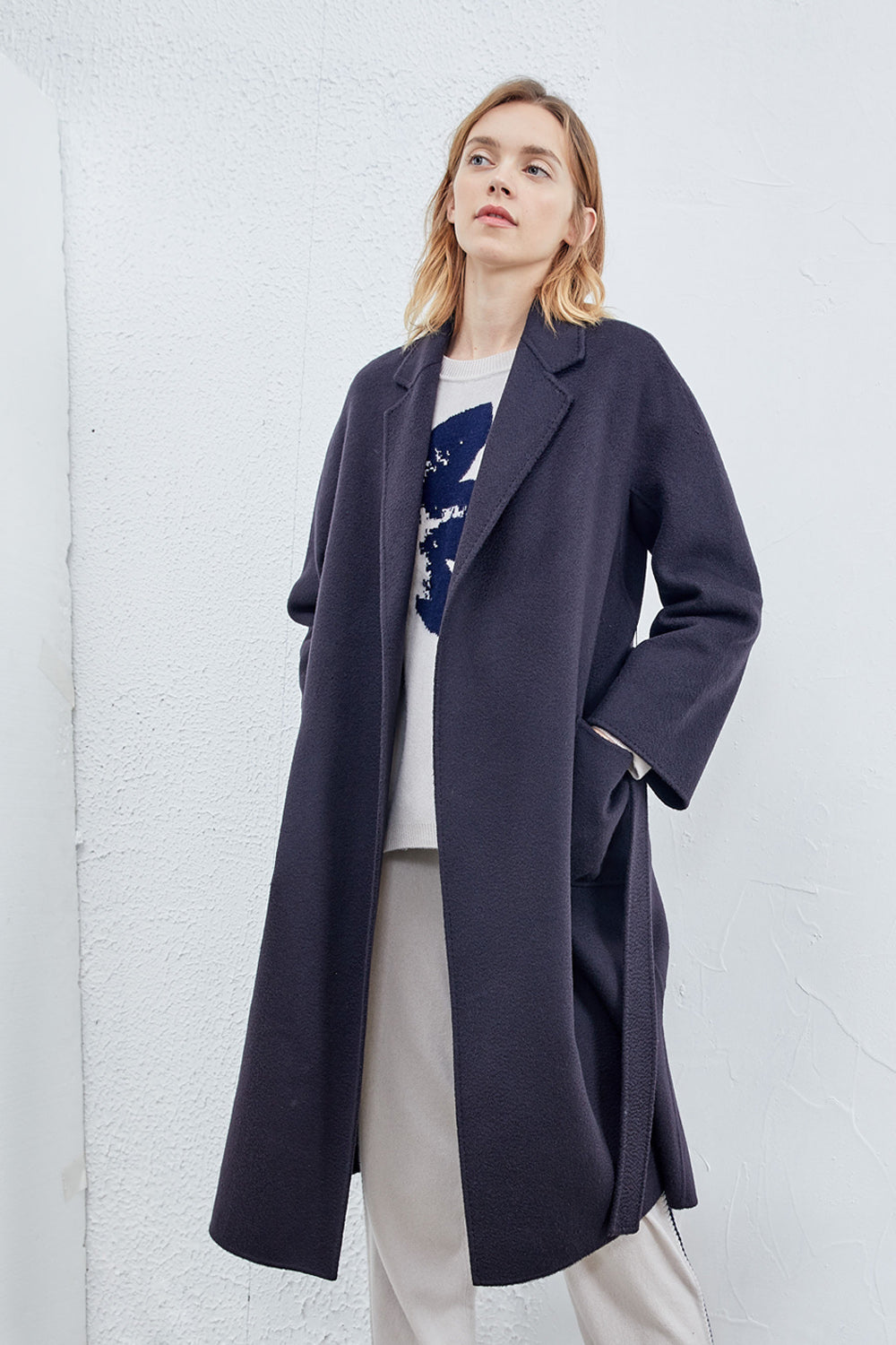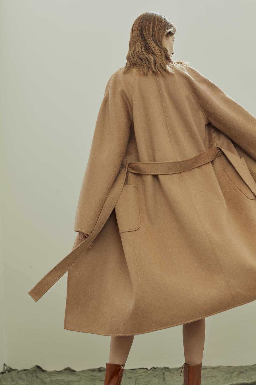 Long wraparound coat in hand-sewn, double pure cashmere fabric with lapels and patch pockets. This item is slightly flared, with kimono-style sleeves at the front and raglan at the back. Unlined. Fastens with matching belt.