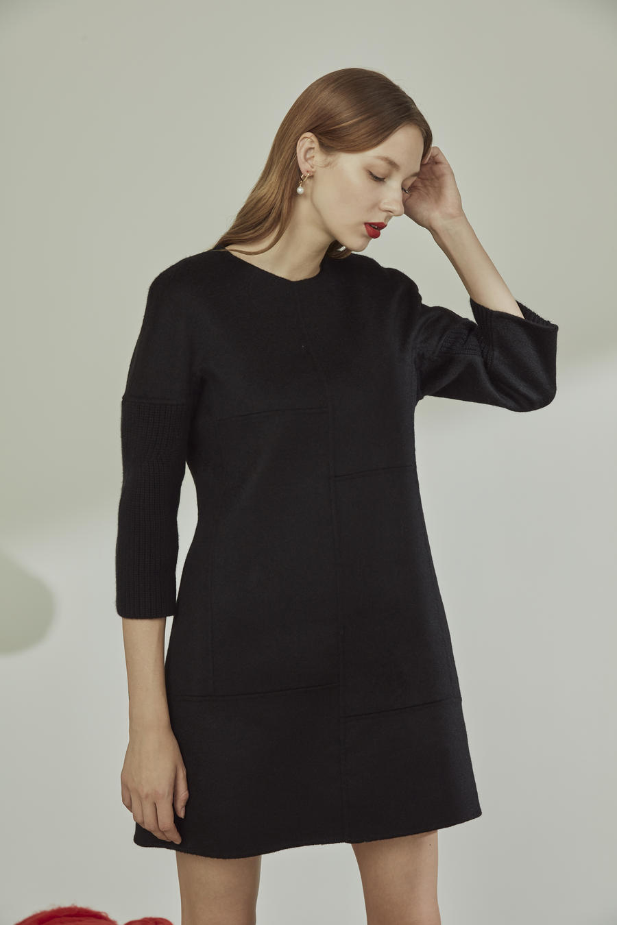 Pure cashmere woven dress, over knee length with a sleek, clean line featuring chunky knit sleeves.
