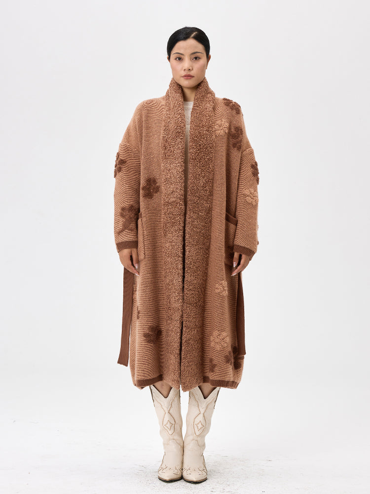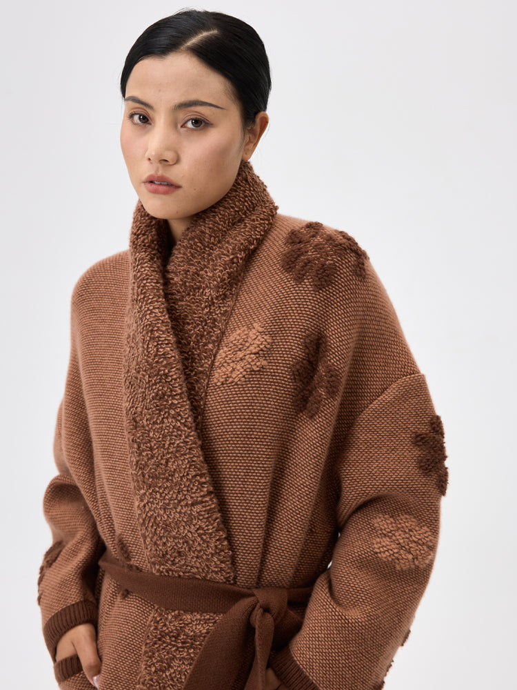 Selected cashmere knitted fabric, with a terry exposed jacquard technique featuring a Gesang flower pattern, presenting a three-dimensional texture with distinct raised petal patterns, and the underlying terry is faintly visible. The placket is designed with thick terry, which is thick and full