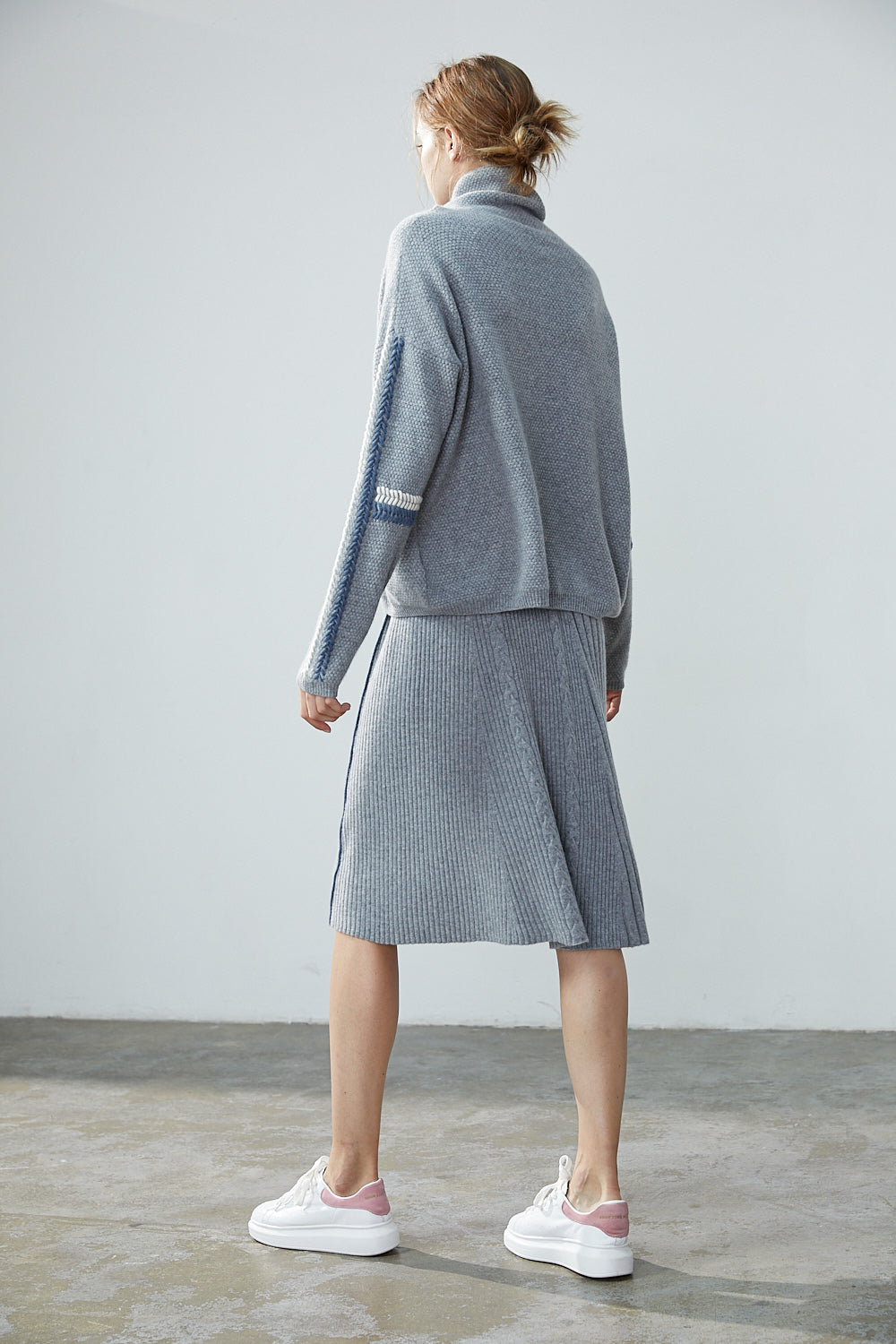 Skirt: A-shaped cashmere skirt with simple line on one side.