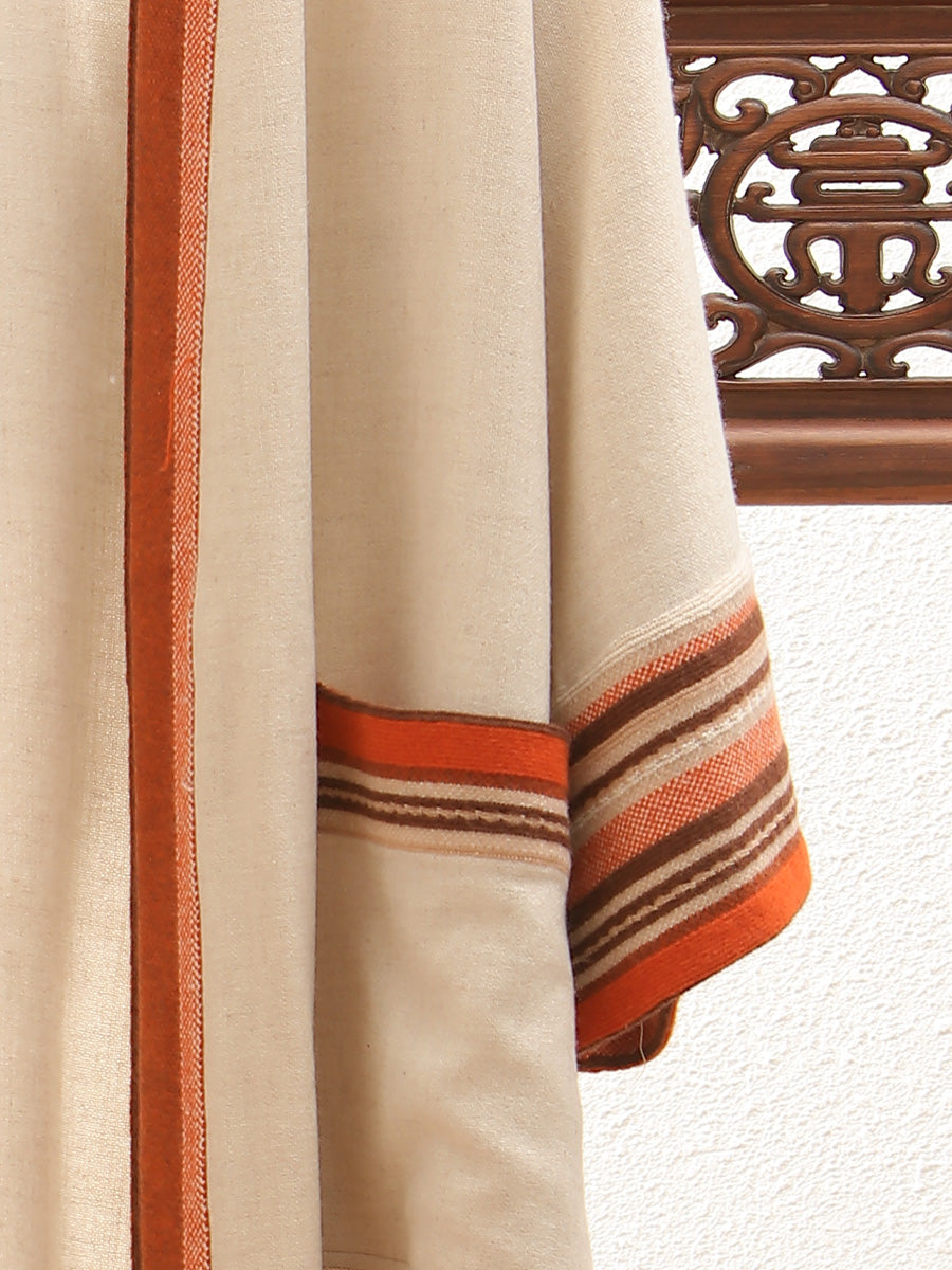 Wrap yourself in comfort with this cozy cashmere robe, adorned with a soft hand-sewn trim in a cheerful orange color.