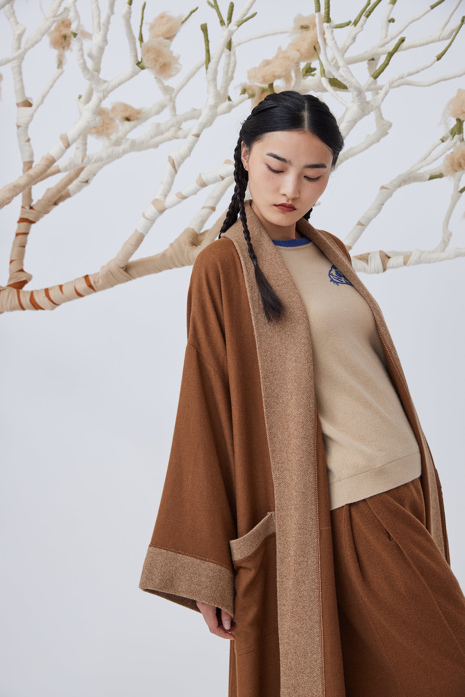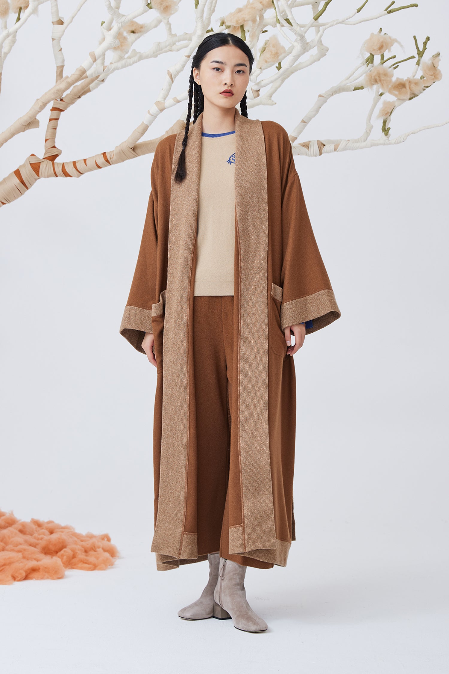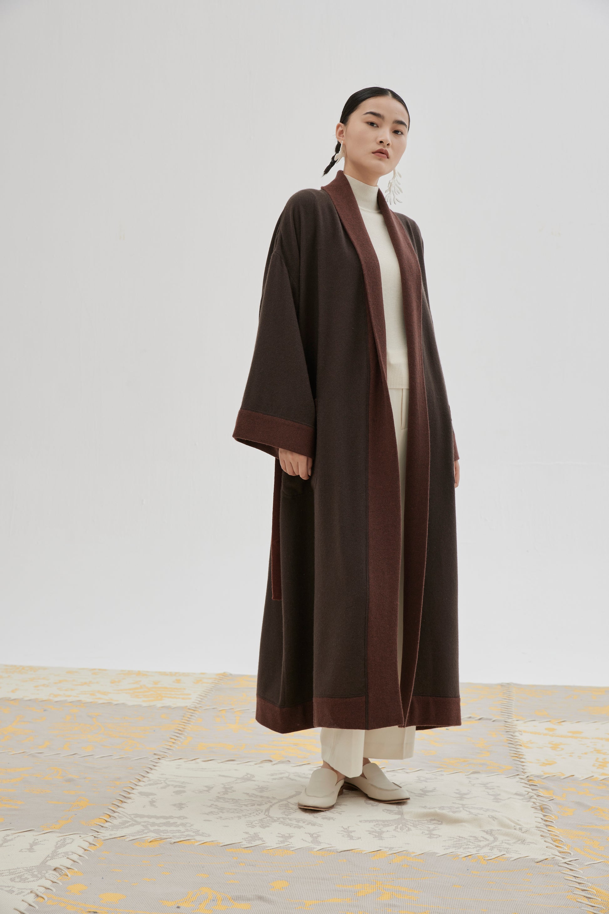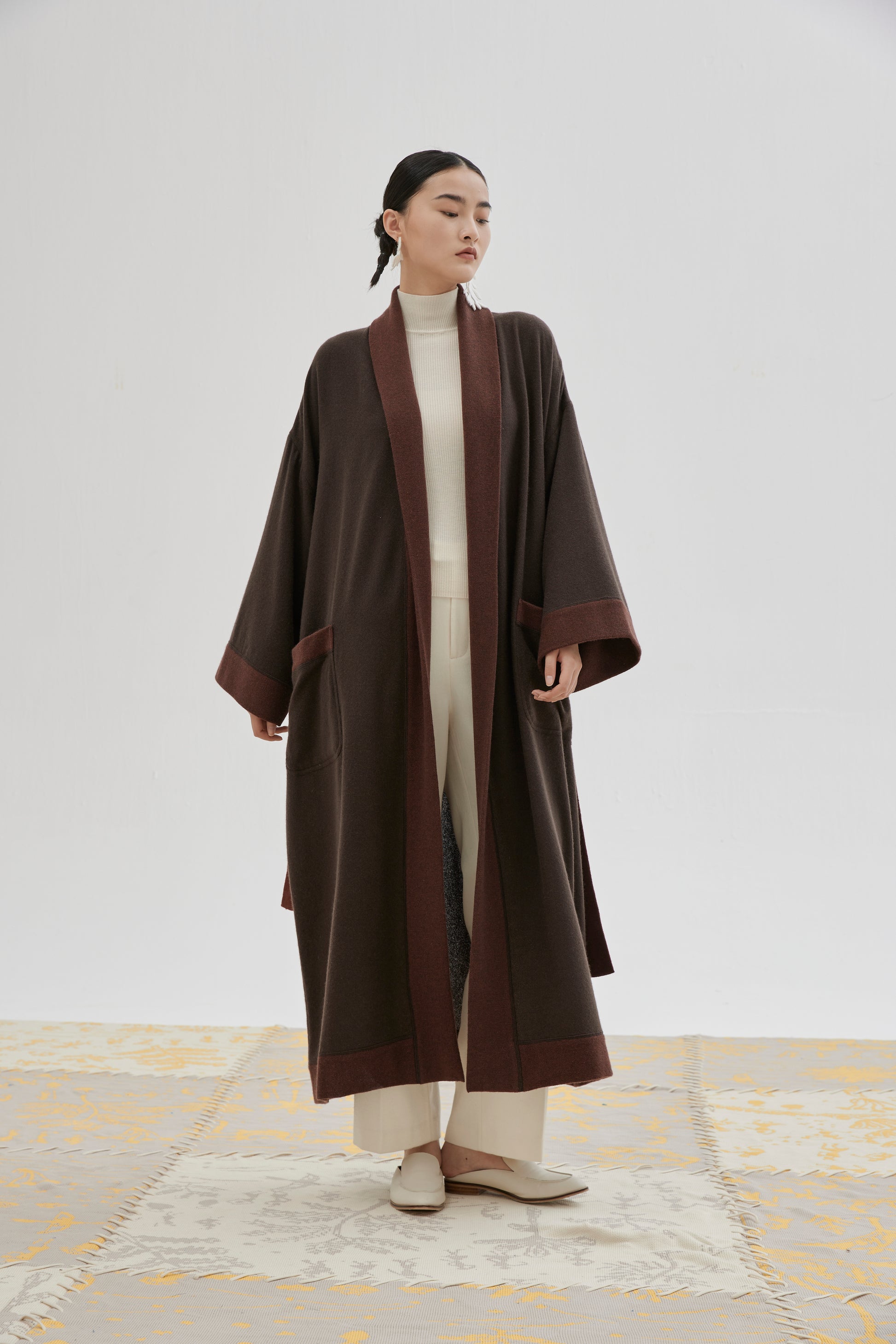 100% cashmere wrap coat with a shawl collar. Jersey body part and knitted trims. Matching belt fastening. Patch pockets.