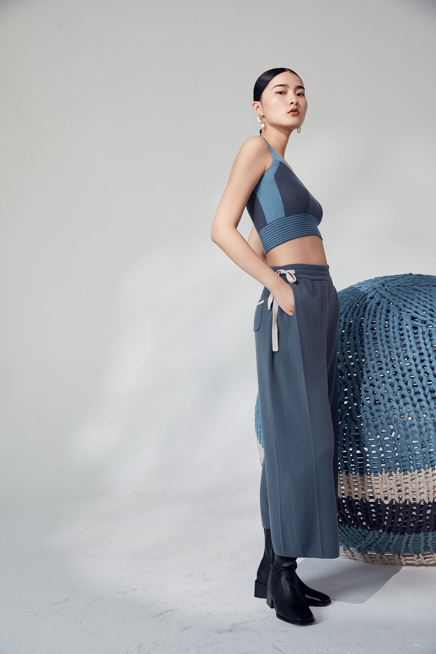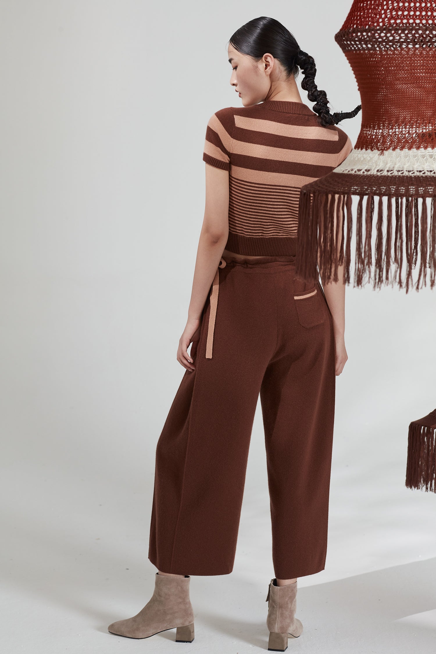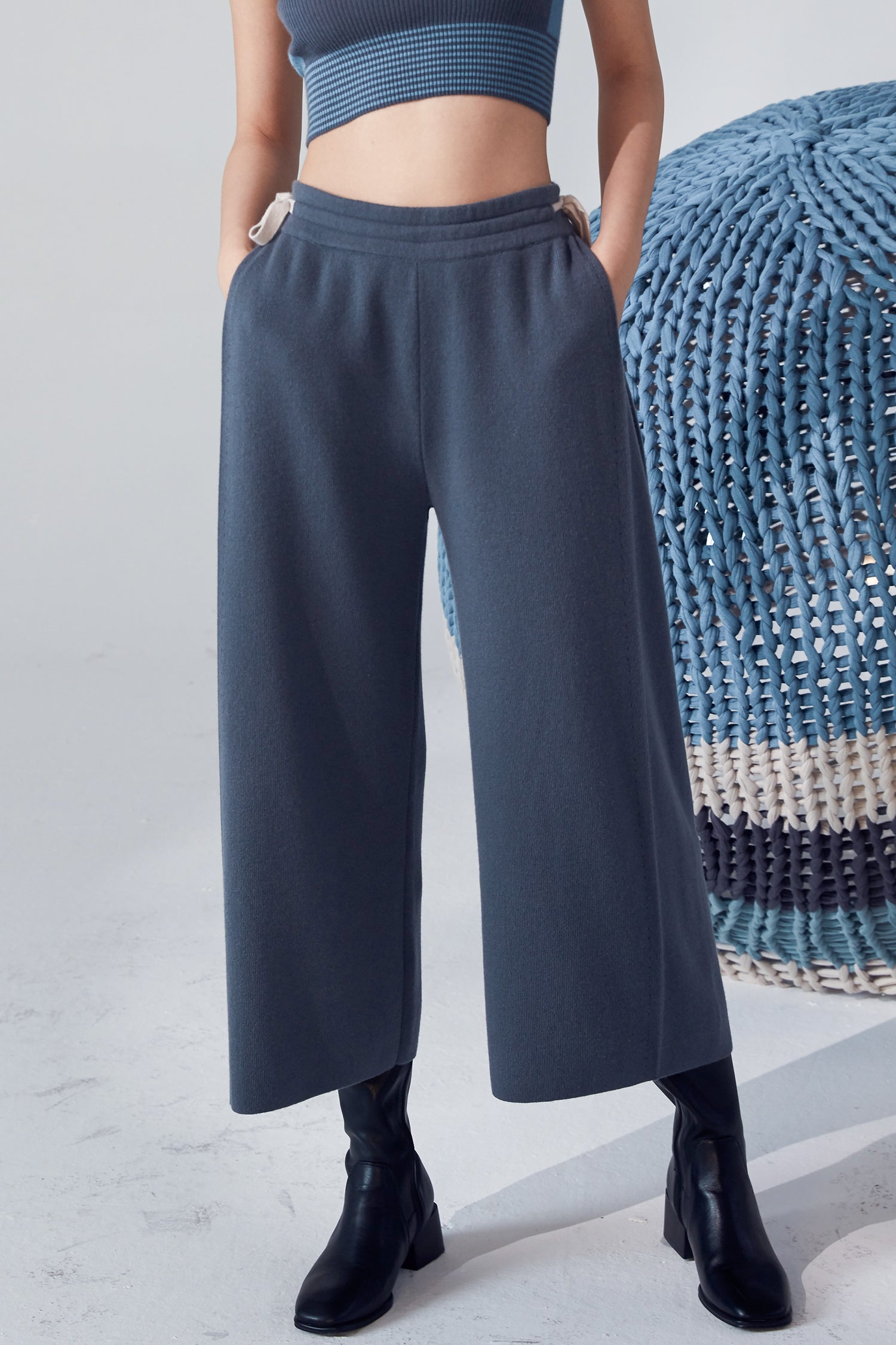 Extra thick straight cut cropped trouser in knitted 26S/2 baby cashmere. It features a drawstring with contrasting color stripes and fluid detail on the side. Perfect with refined casual ensembles, keeps you warm in winter.