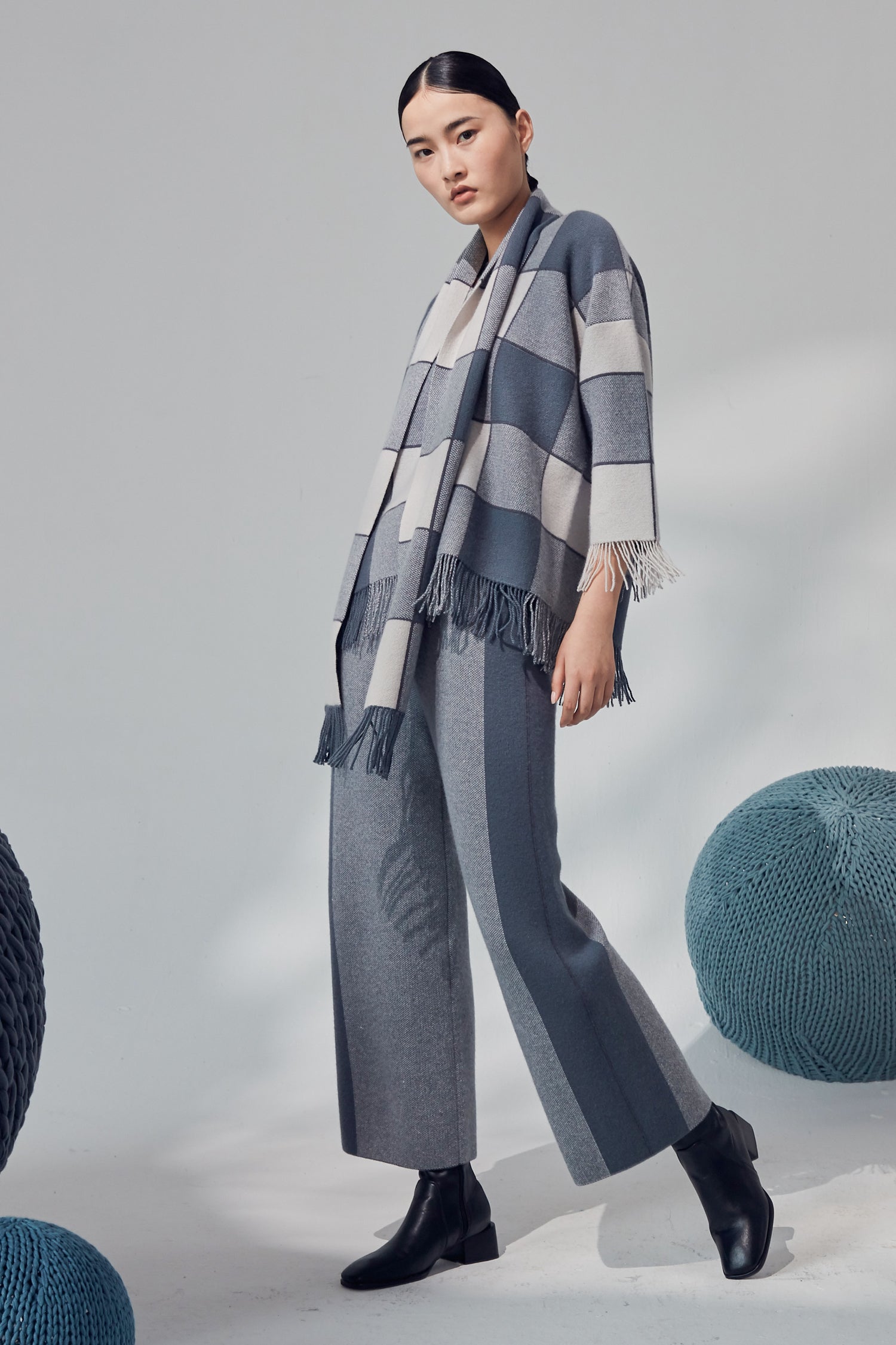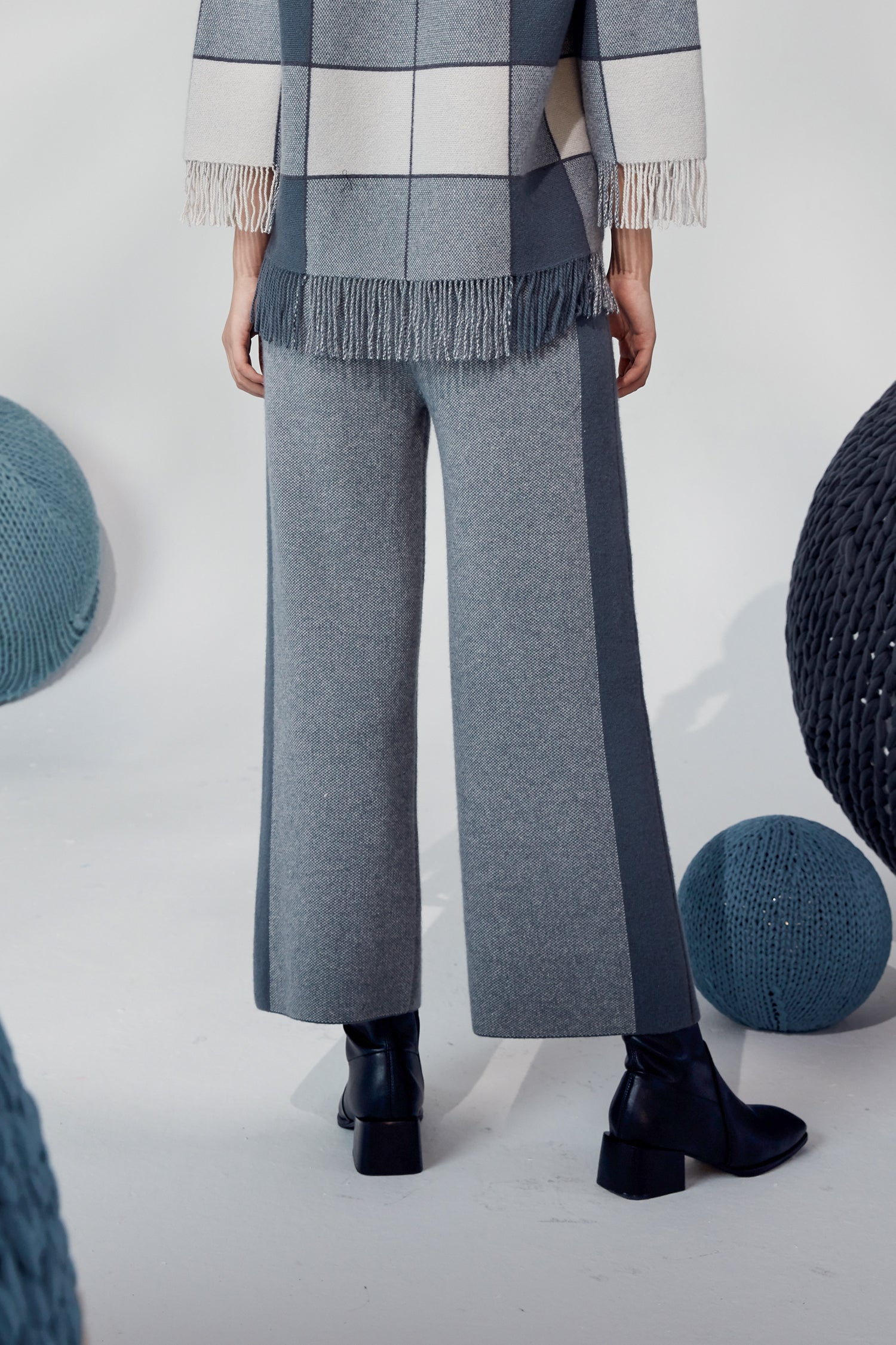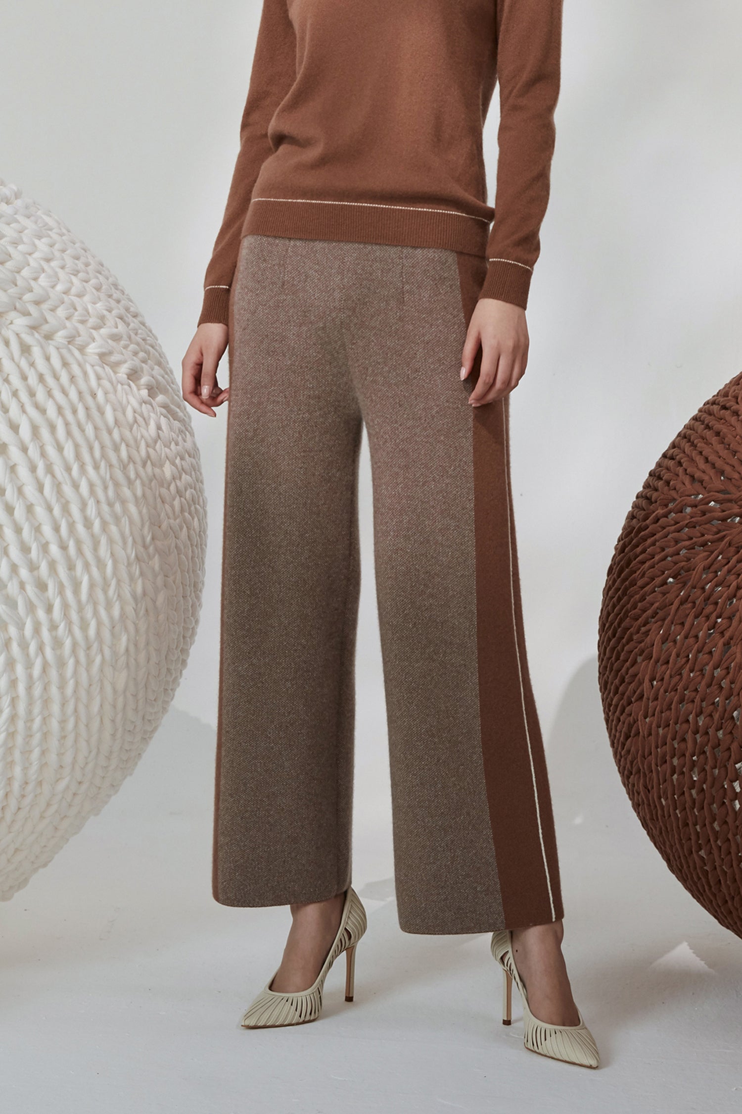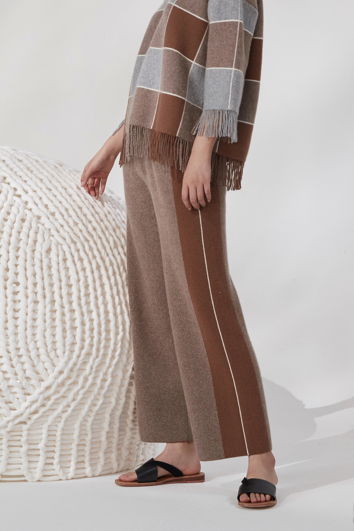Straight cut trousers in extra thick jacquard 26S/2 baby cashmere. It features an elastic waistband and contrasting color wide stripes. Perfect with refined casual ensembles.