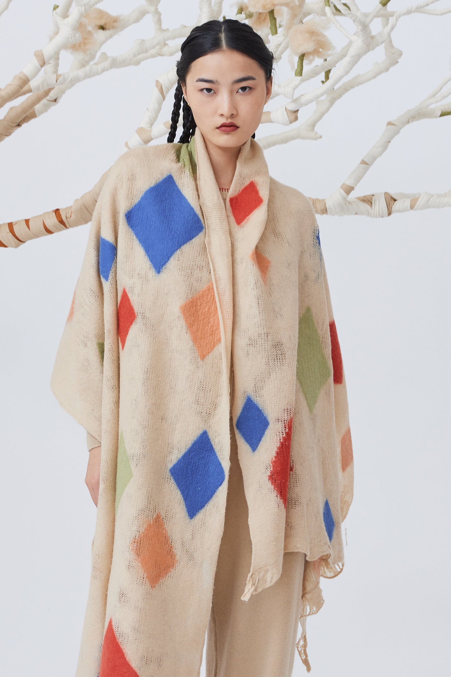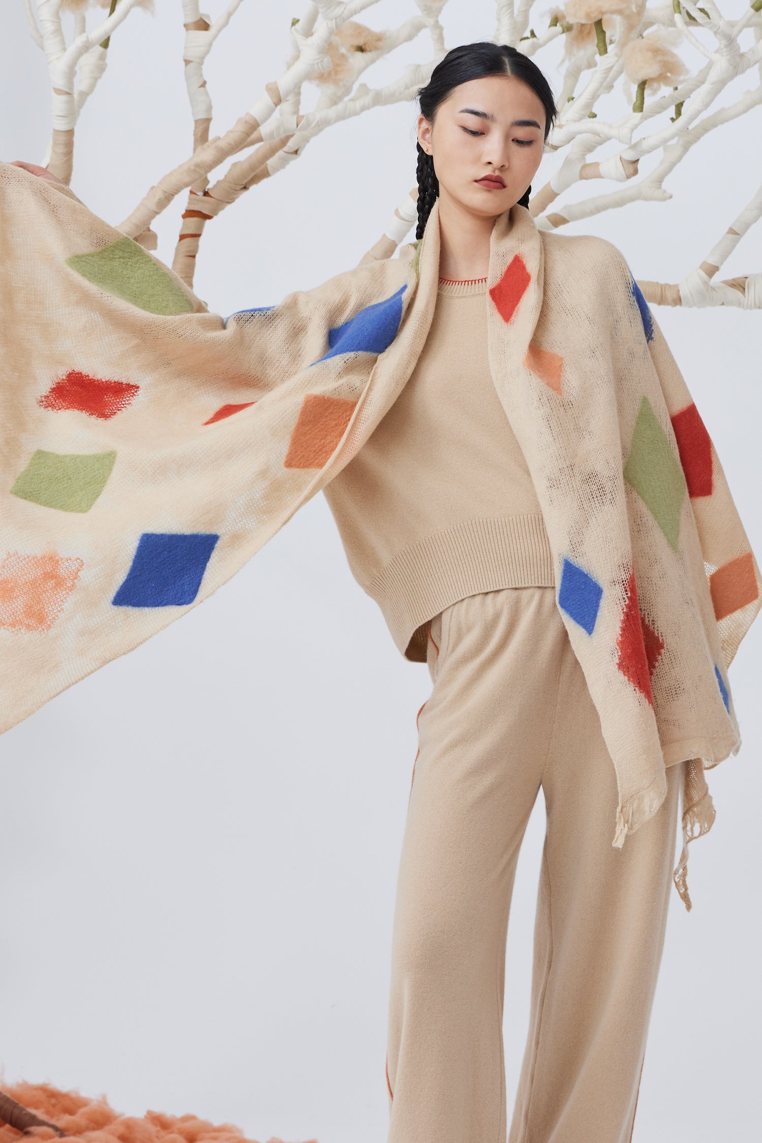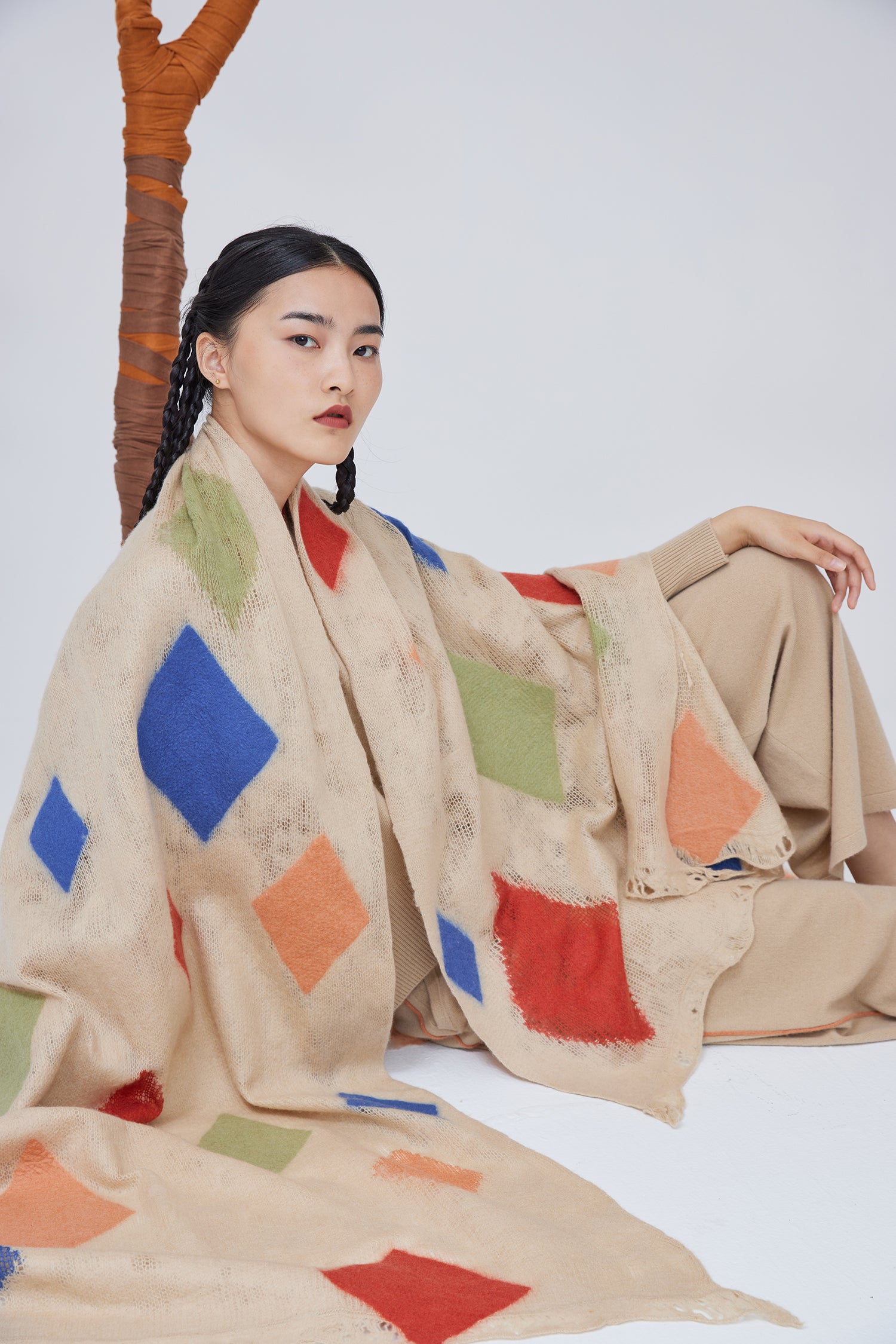 Unique traditional Mongolian handcrafted cashmere felt on top of knitted cashmere fabric. Decorated by multi-color blocks that come from the wasted materials during the production of the collection. An artistic handcraft with the idea of sustainable fashion.