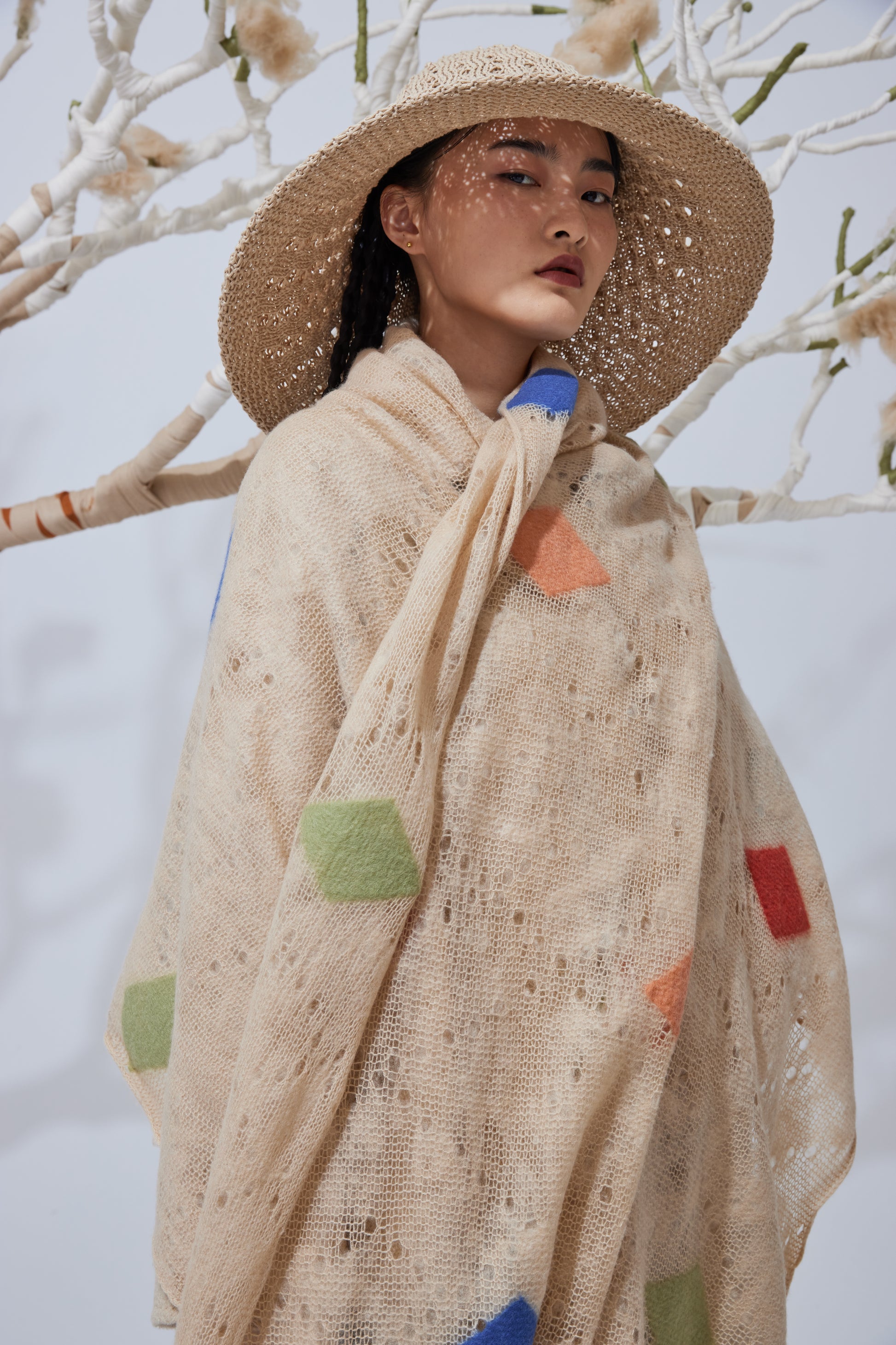 Unique traditional Mongolian handcrafted cashmere felt on top of knitted cashmere fabric. Decorated by multi-color blocks that come from the wasted materials during the production of the entire collection. An artistic handcraft with the idea of sustainable fashion.