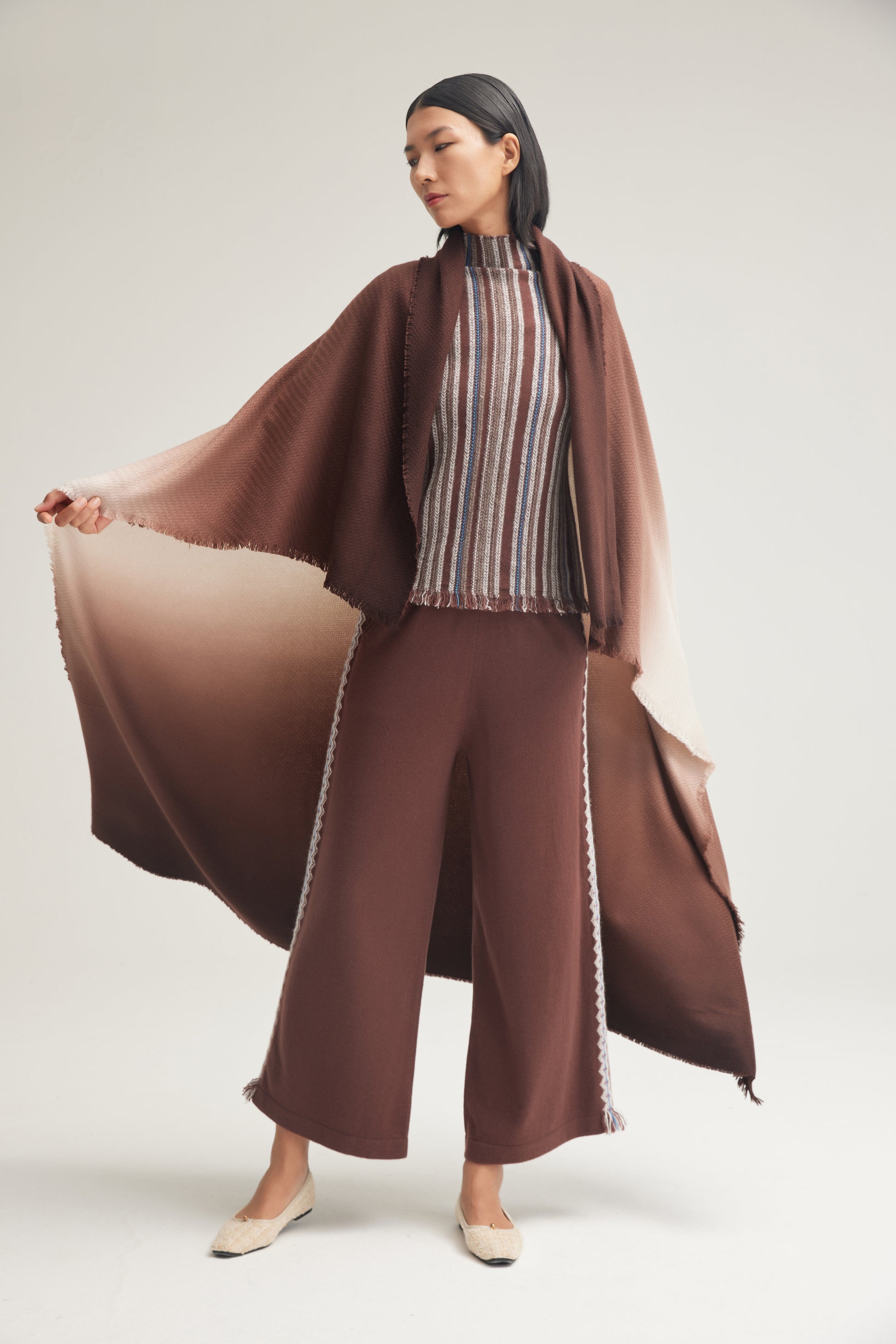 The hand-woven blanket, originating from an ancient tibet handcraft technique, 100% cashmere, two-tone dip dye design.