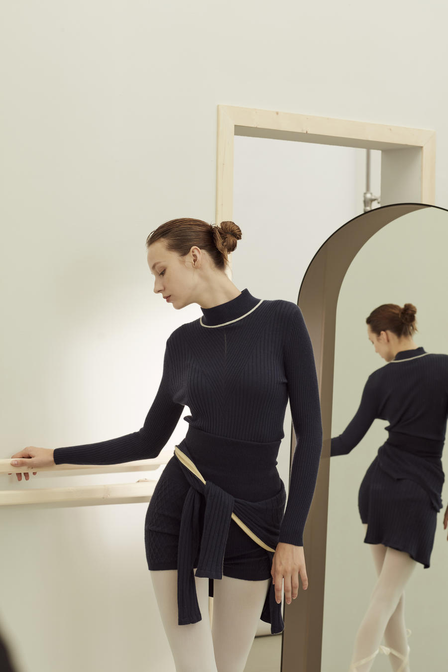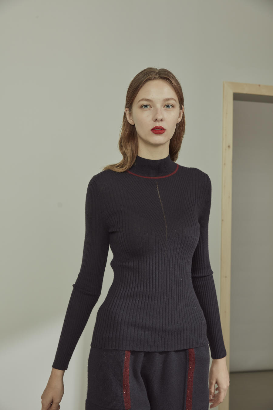 Stocking-stitch polo neck jumper featuring a mix of structures. Fitted silhouette decorated with a contrasting stripe around the neck.