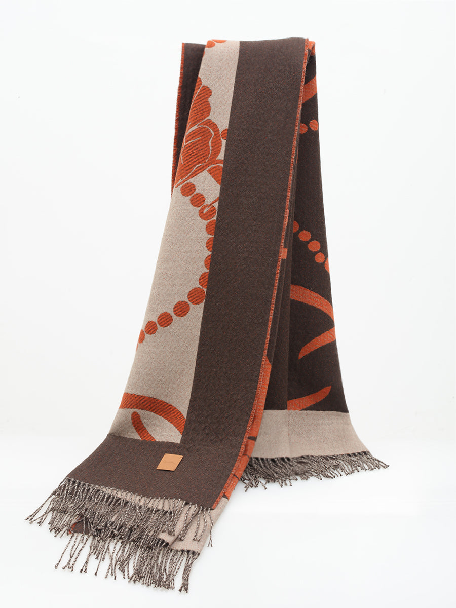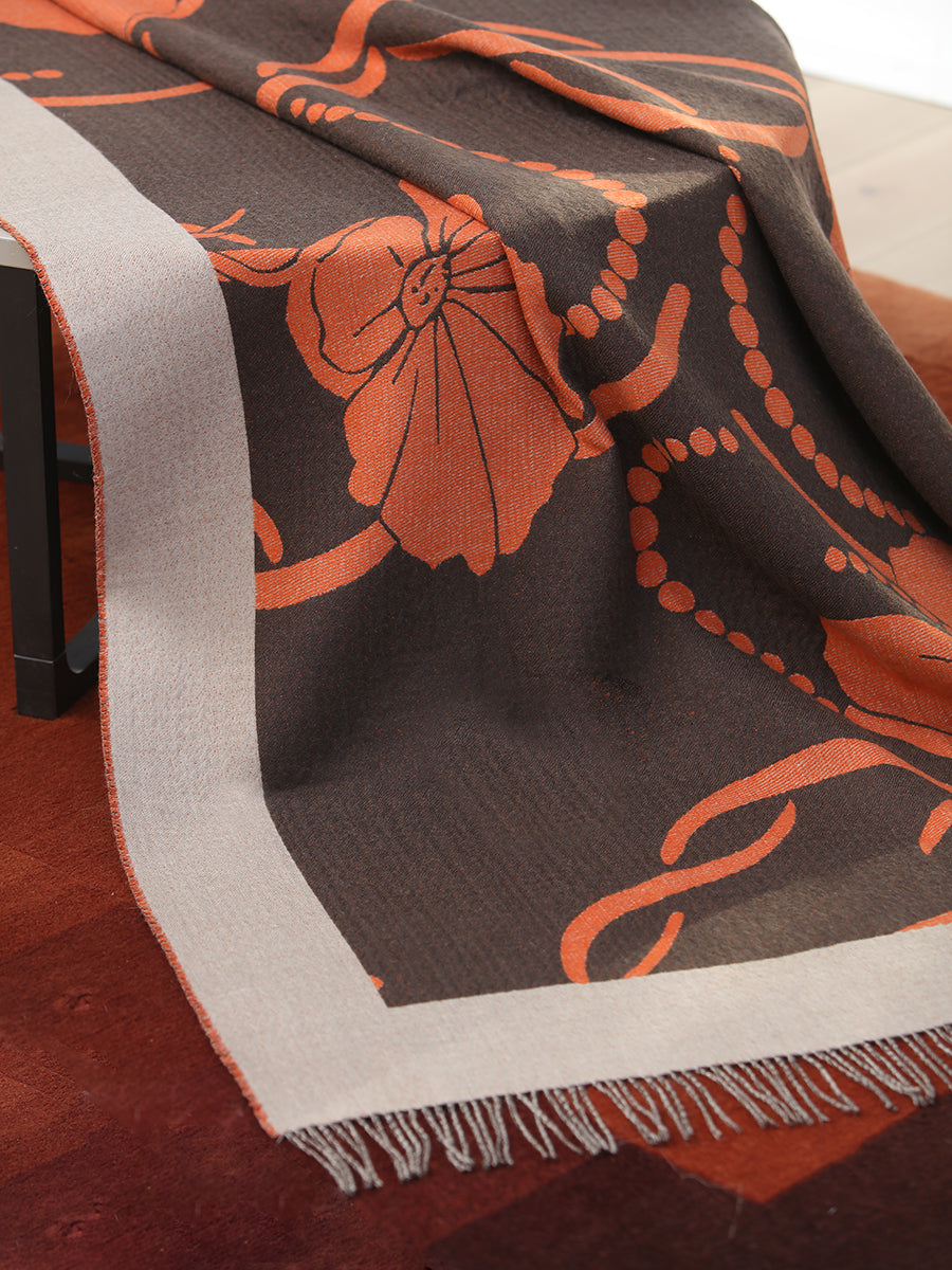 Inspired by Tibetan culture, this luxurious, double-sided shawl/throw is crafted from a blend of cashmere and yak wool, featuring an intricate Kusan flower jacquard design. Perfect for staying warm in style.