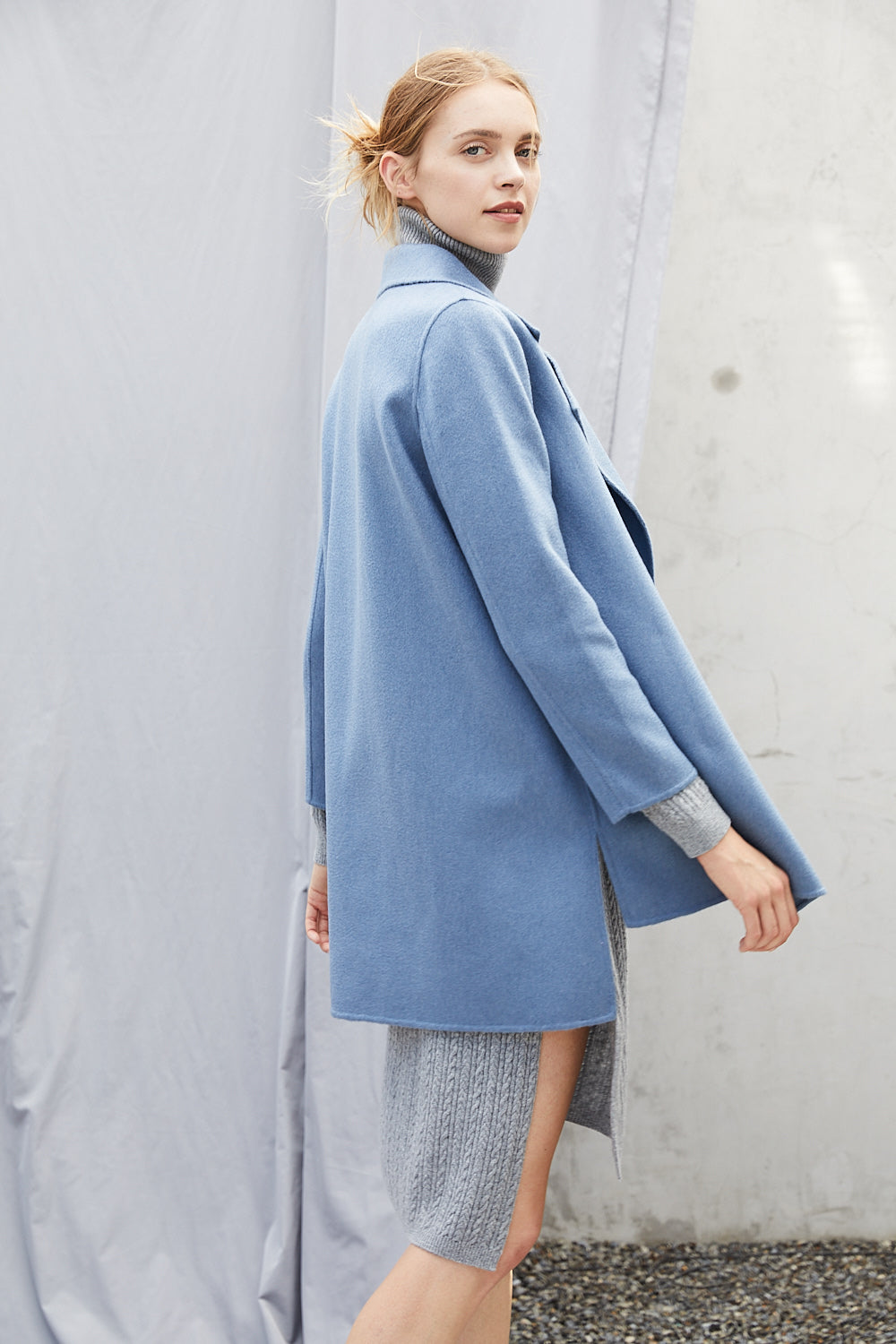 Single-breasted coat crafted from pure cashmere, featuring hand sewn seams, styled with asymmetry hem and side slits.
