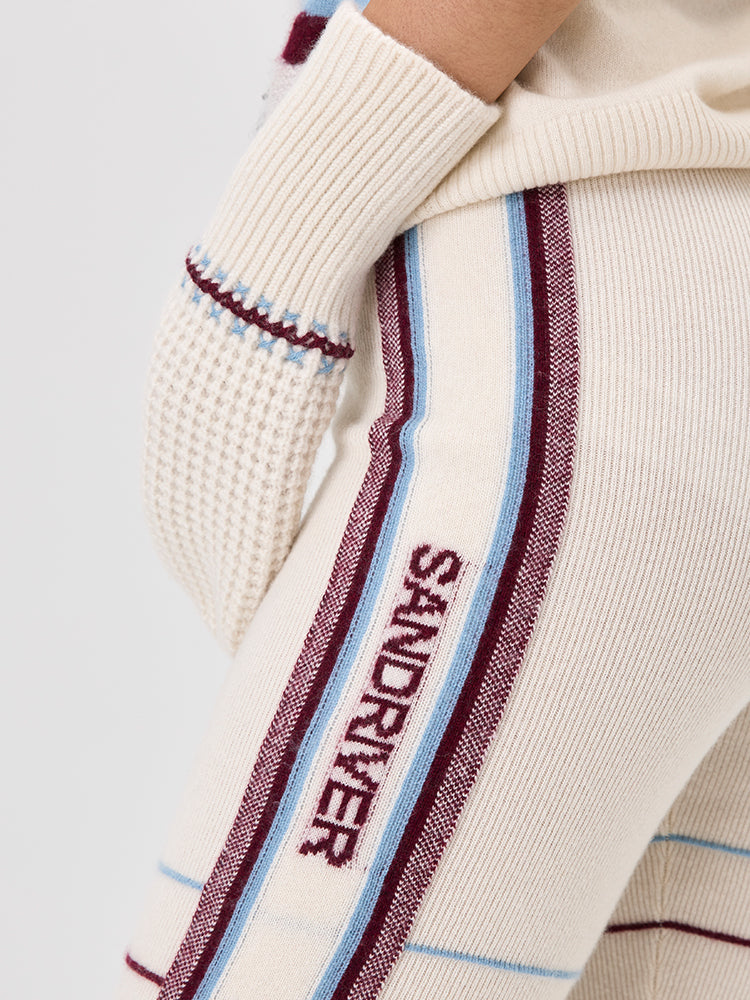 Craft: The contrast side-stripe, woven from fine cashmere tape, is precision-stitched into the seam, running ruler-straight from waist to hem, elongating the leg and flattering the figure.