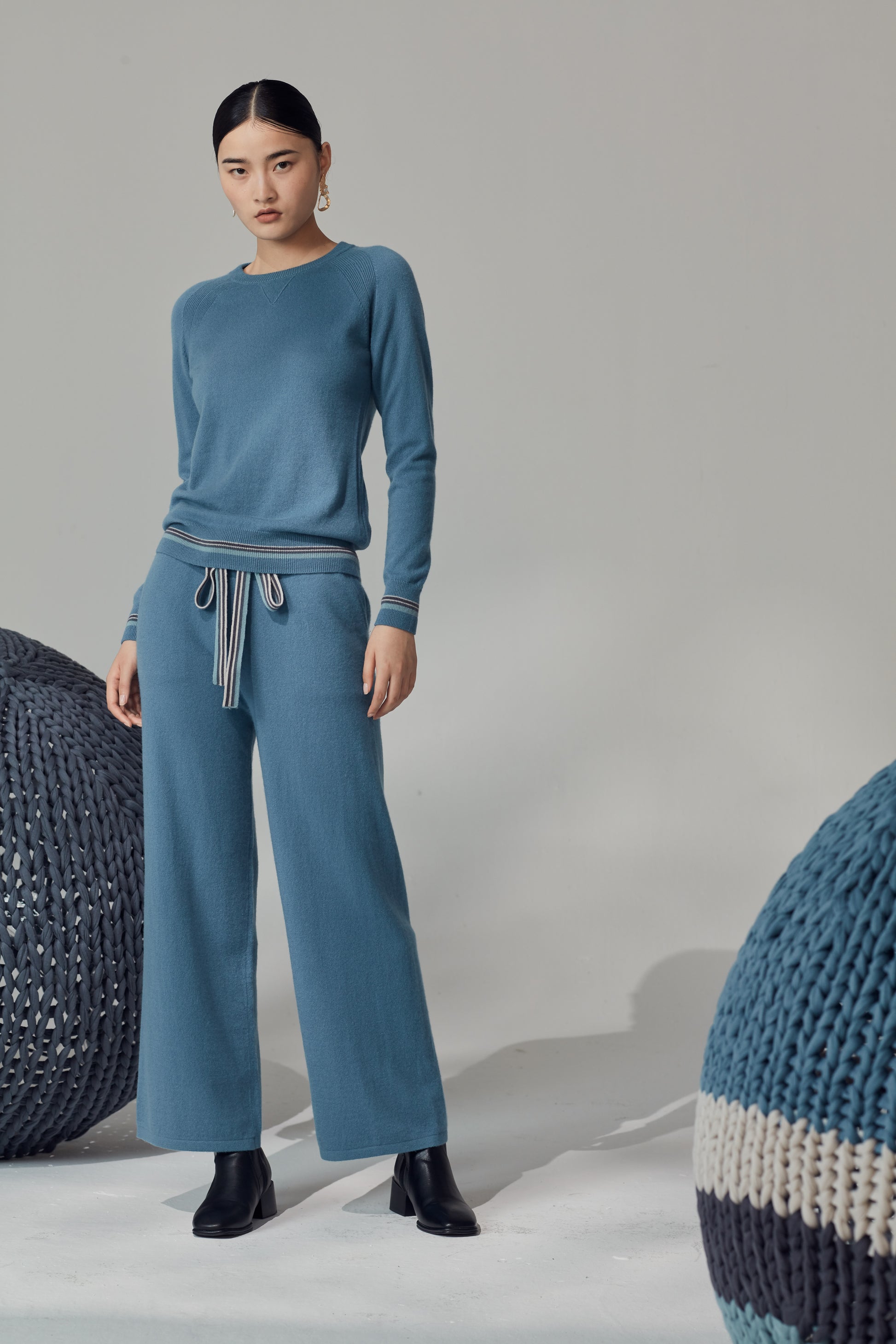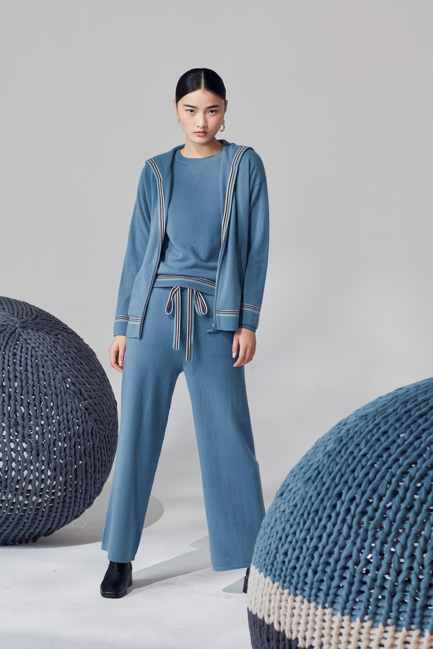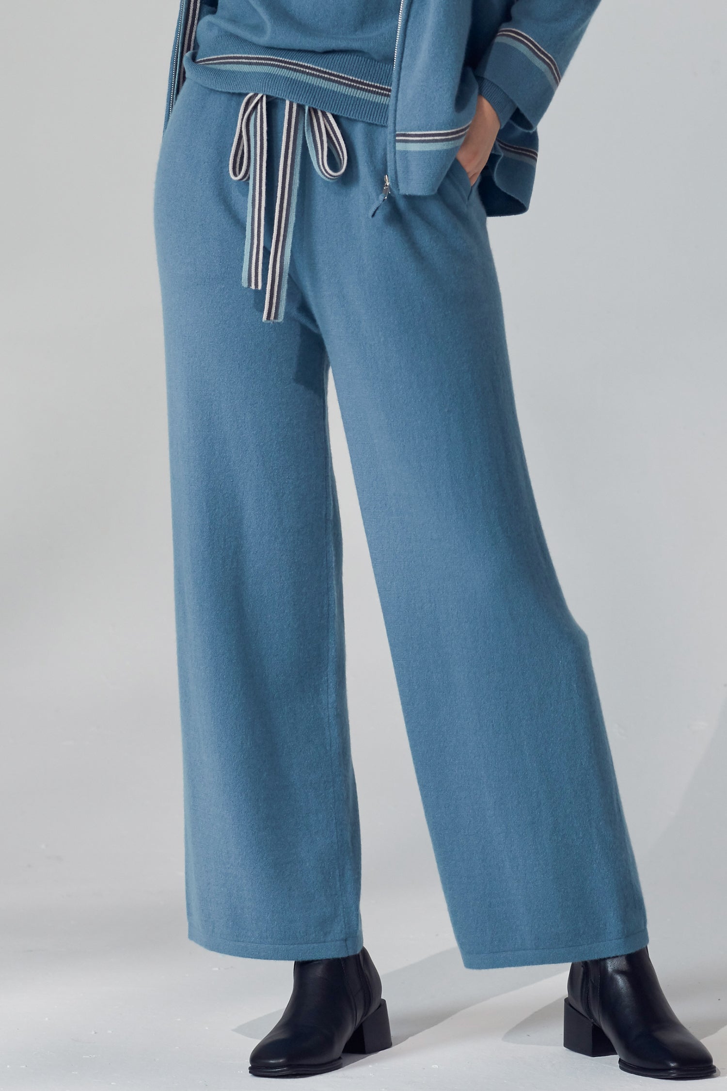 Relaxed cut trouser in knitted 26S/2 baby cashmere. It features a drawstring with contrasting color stripes and elastic waistband, detailed with patched pockets at the back. Perfect with refined casual ensembles.