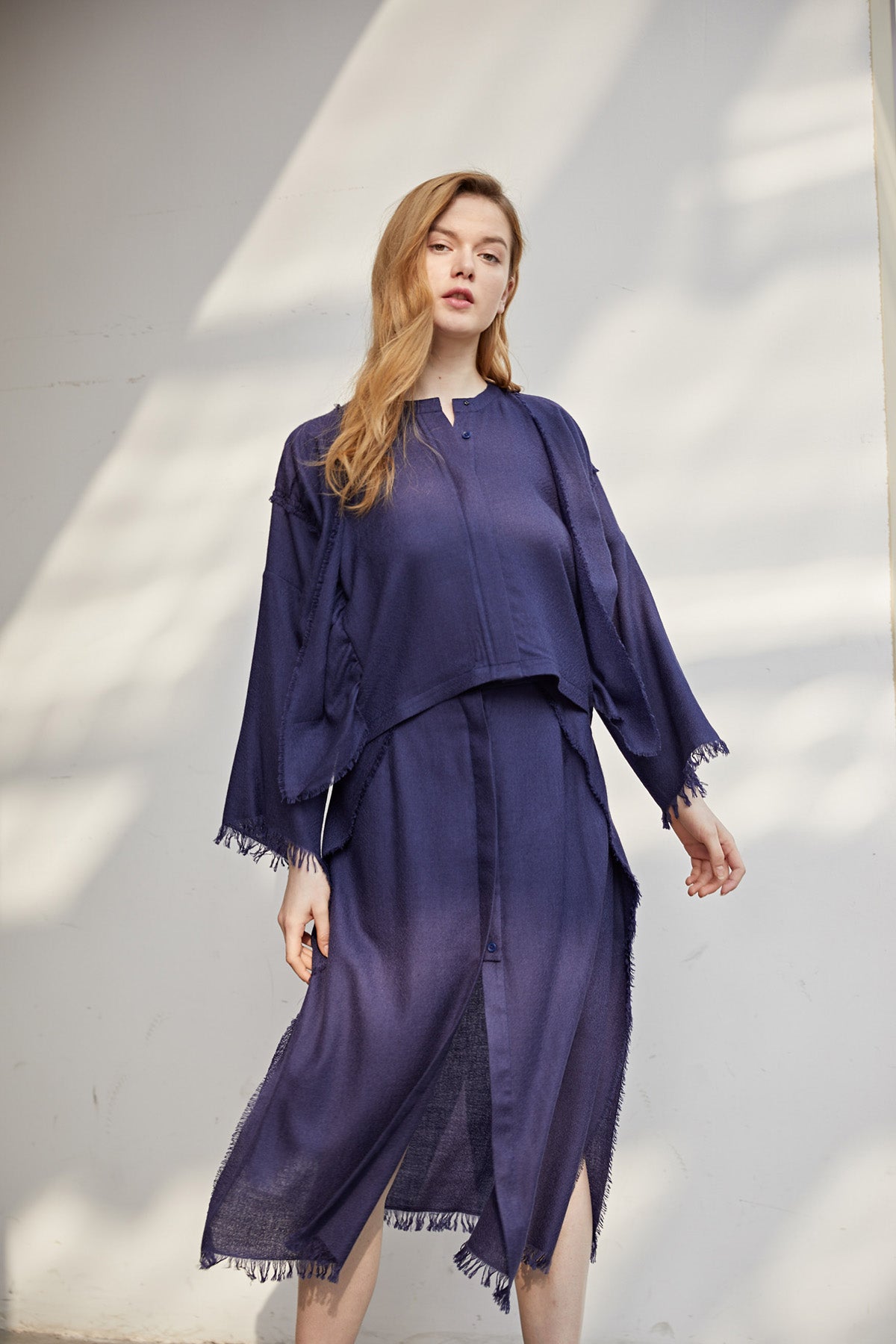 Pants: Super fine cashmere maxi skirt with hand-made fringed edge.