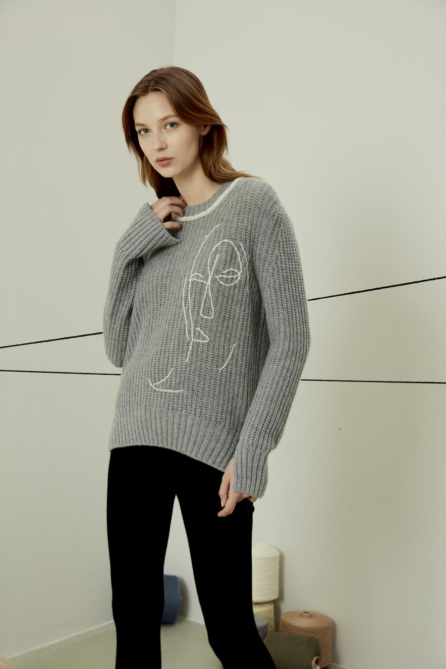 Pure cashmere crew neck jumper with plenty of character. Half cardigan stitch and ribbed hems, decorated with a hand-sewn stick figure designed by artist Francesca Mitterrand.