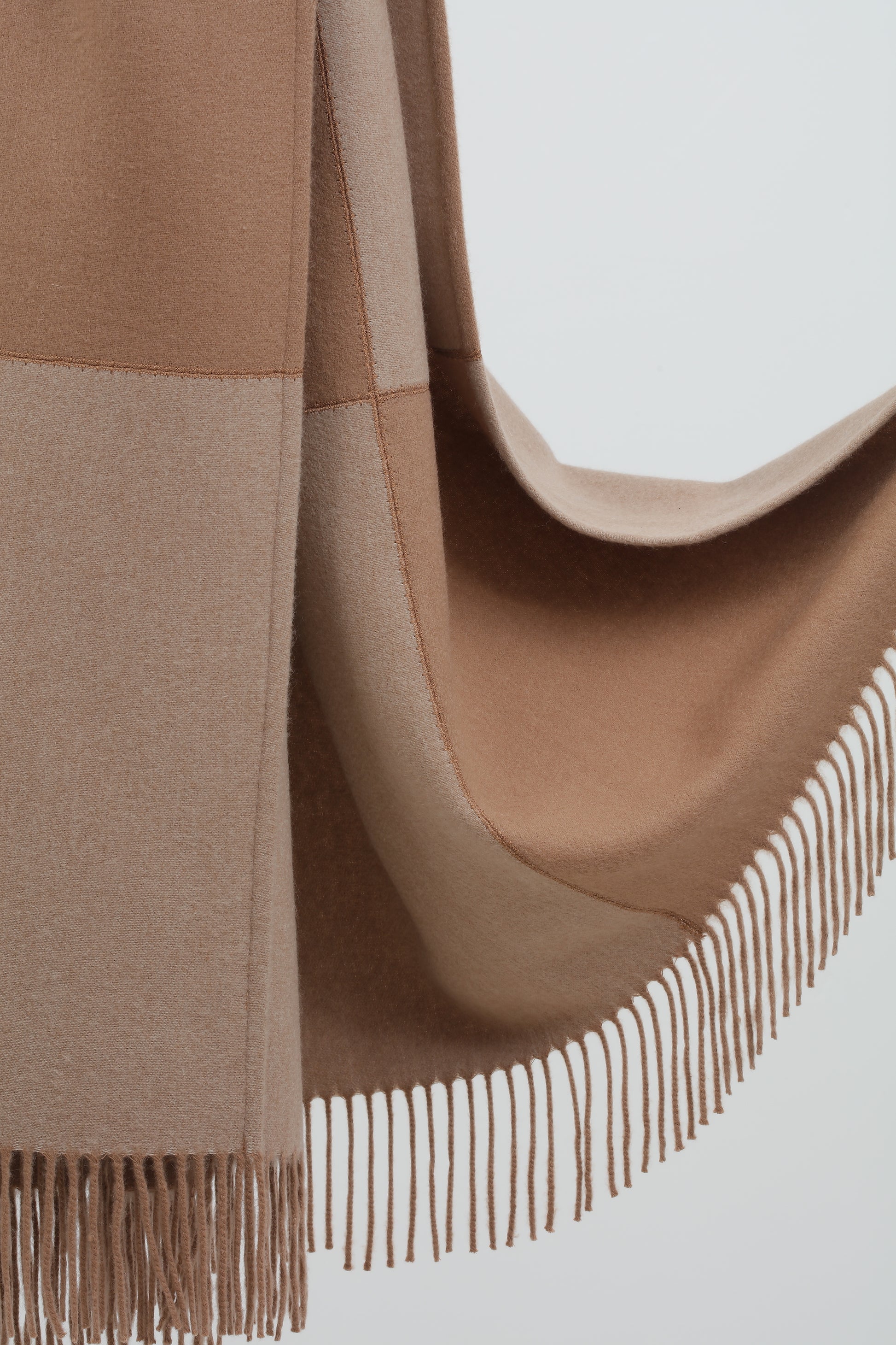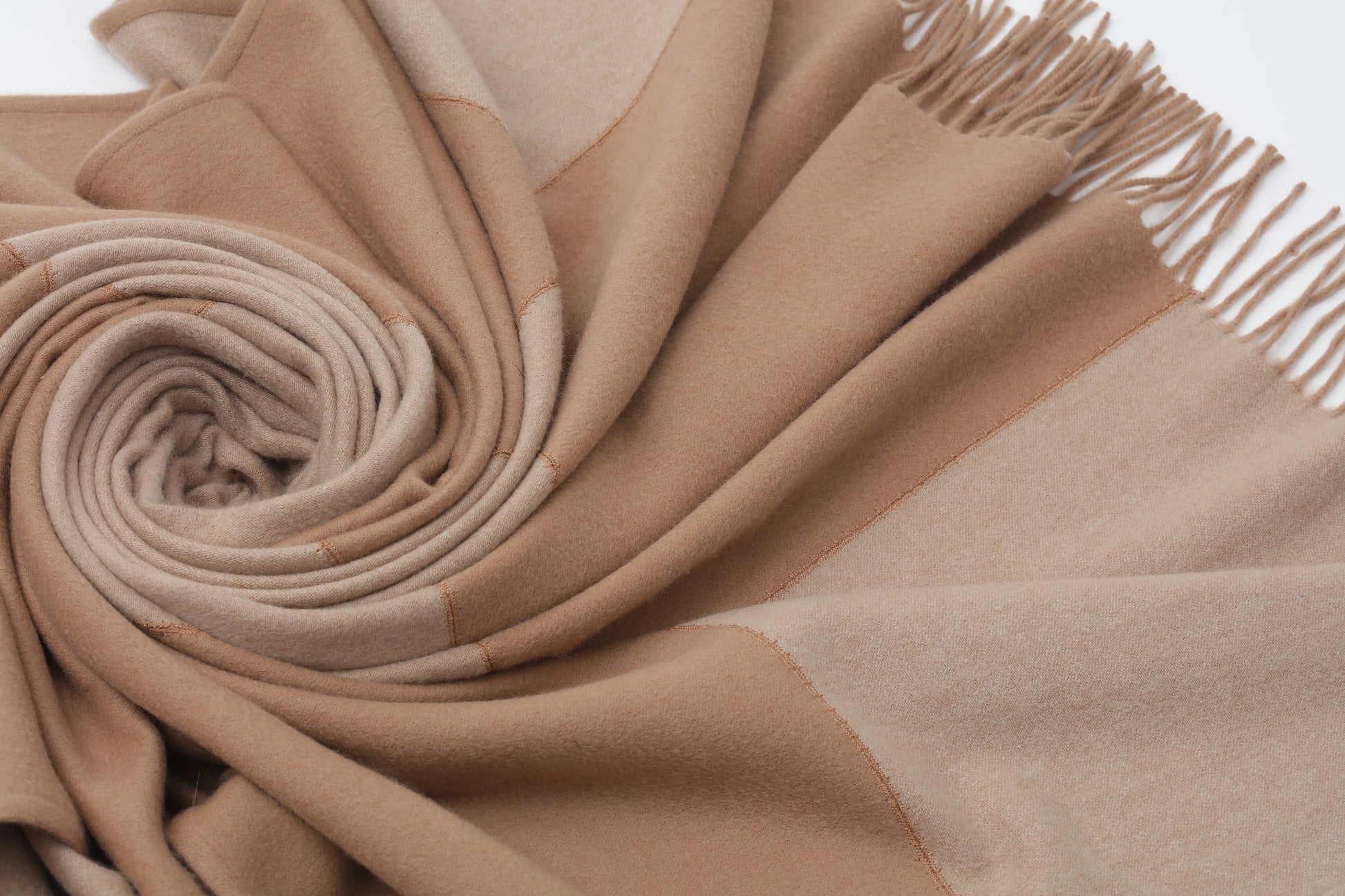Pure cashmere throw with two-tone color joint together. Fringed edge. Serging techniques makes the seams tighter and last longer. Adhere to using natural, environmentally friendly cashmere that is free of additives. ensuring that the cashmere fibers retain their original color and glow.