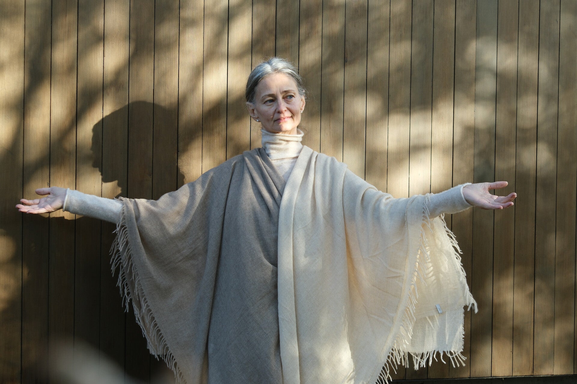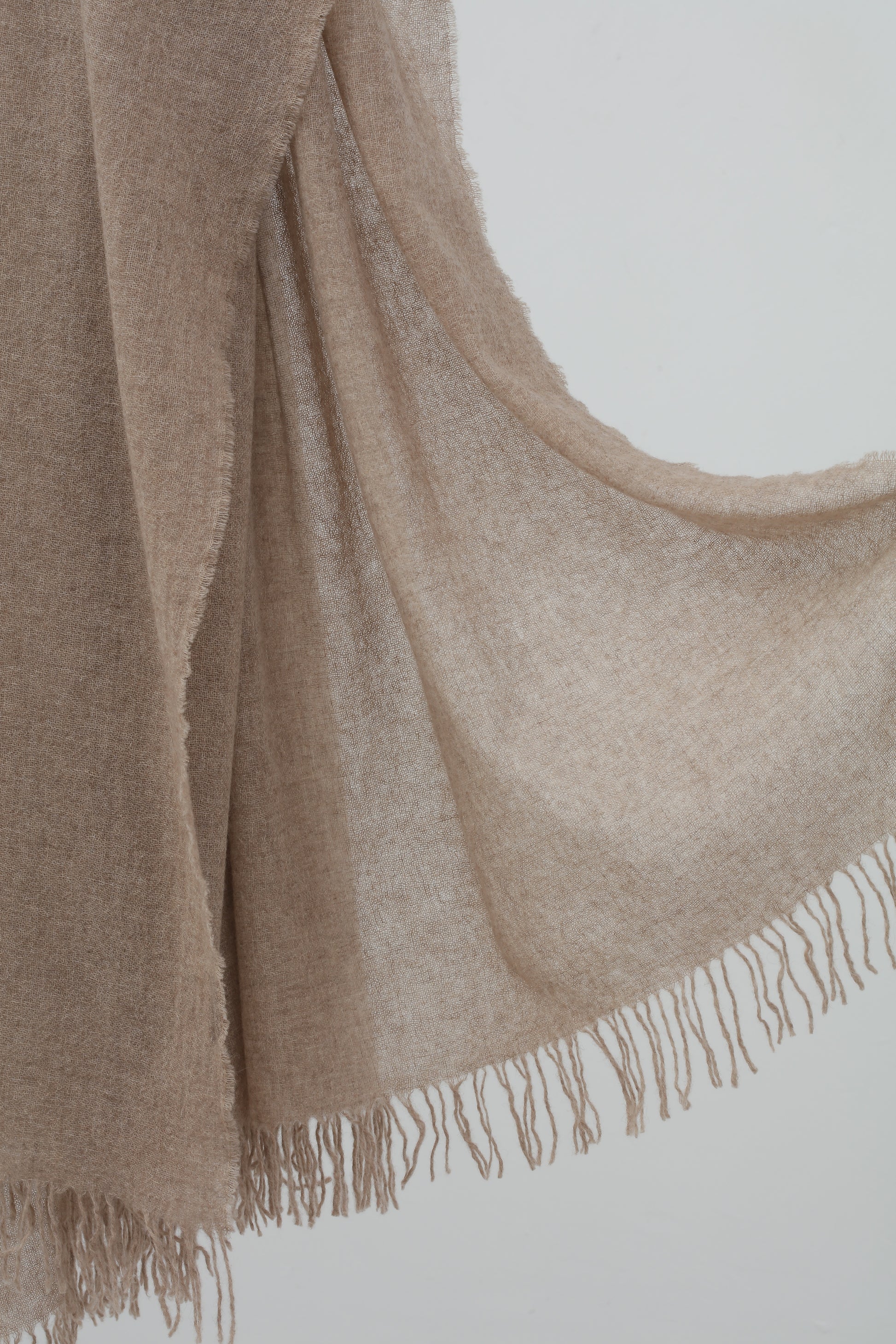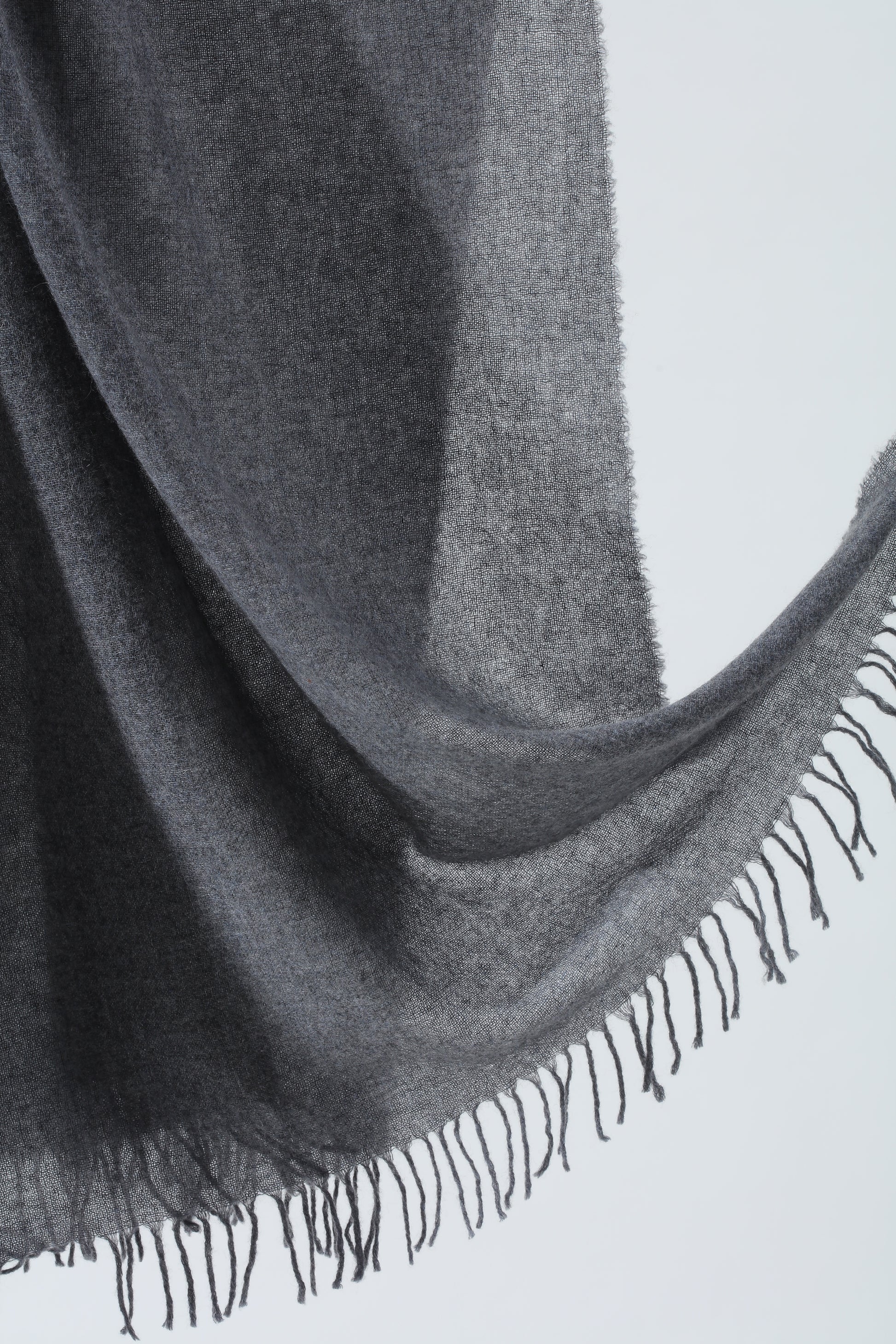 Indulge in the subtle luxury of our baby cashmere shawl. Part of our healing series, this exceptionally light shawl, adorned with delicate eyelash fringes, provides surprising warmth and breathability, enveloping you in a comforting embrace that feels like nothing at all.