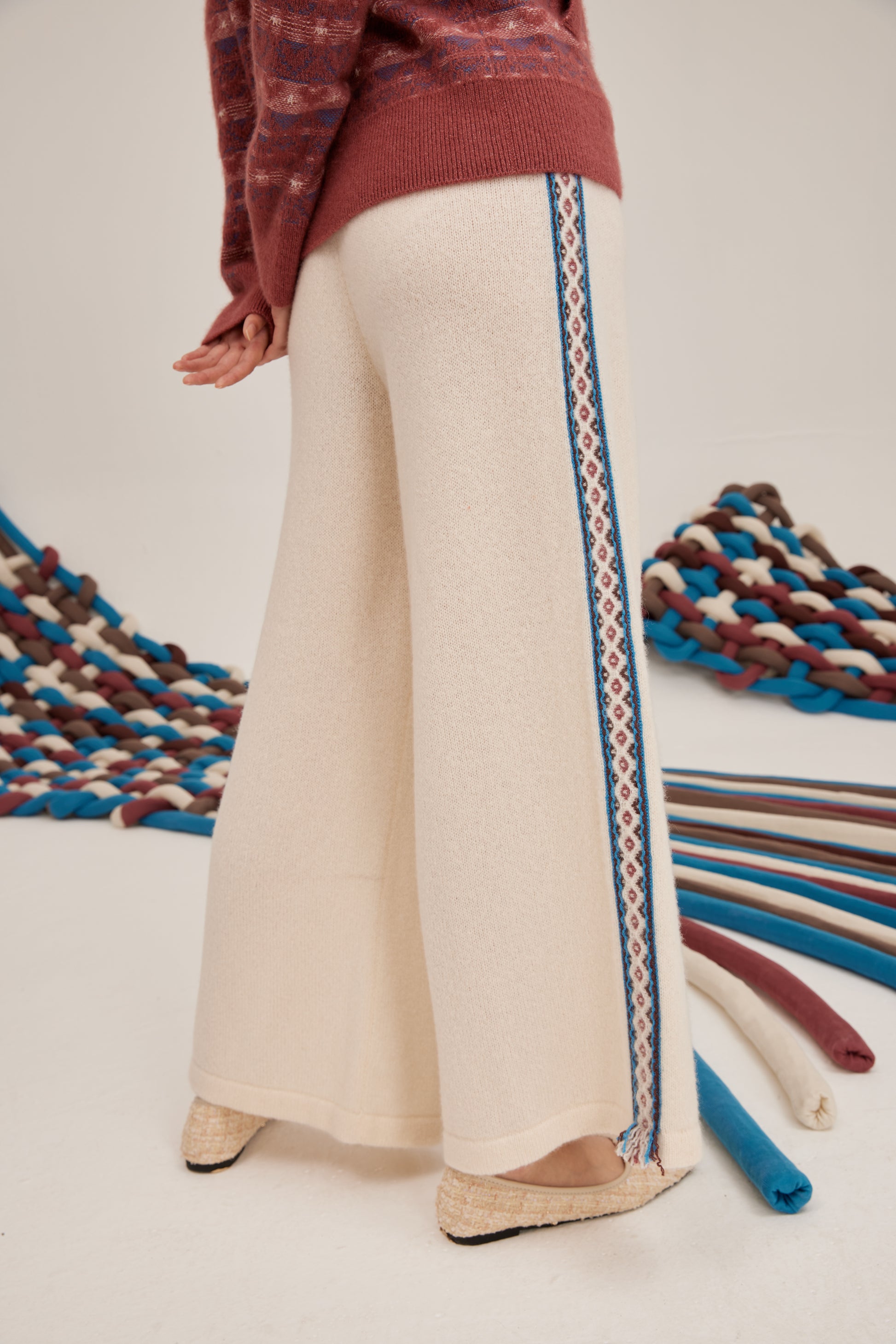 Silk-cashmere ribbed-knit trousers with elastic waist and colored side strips.