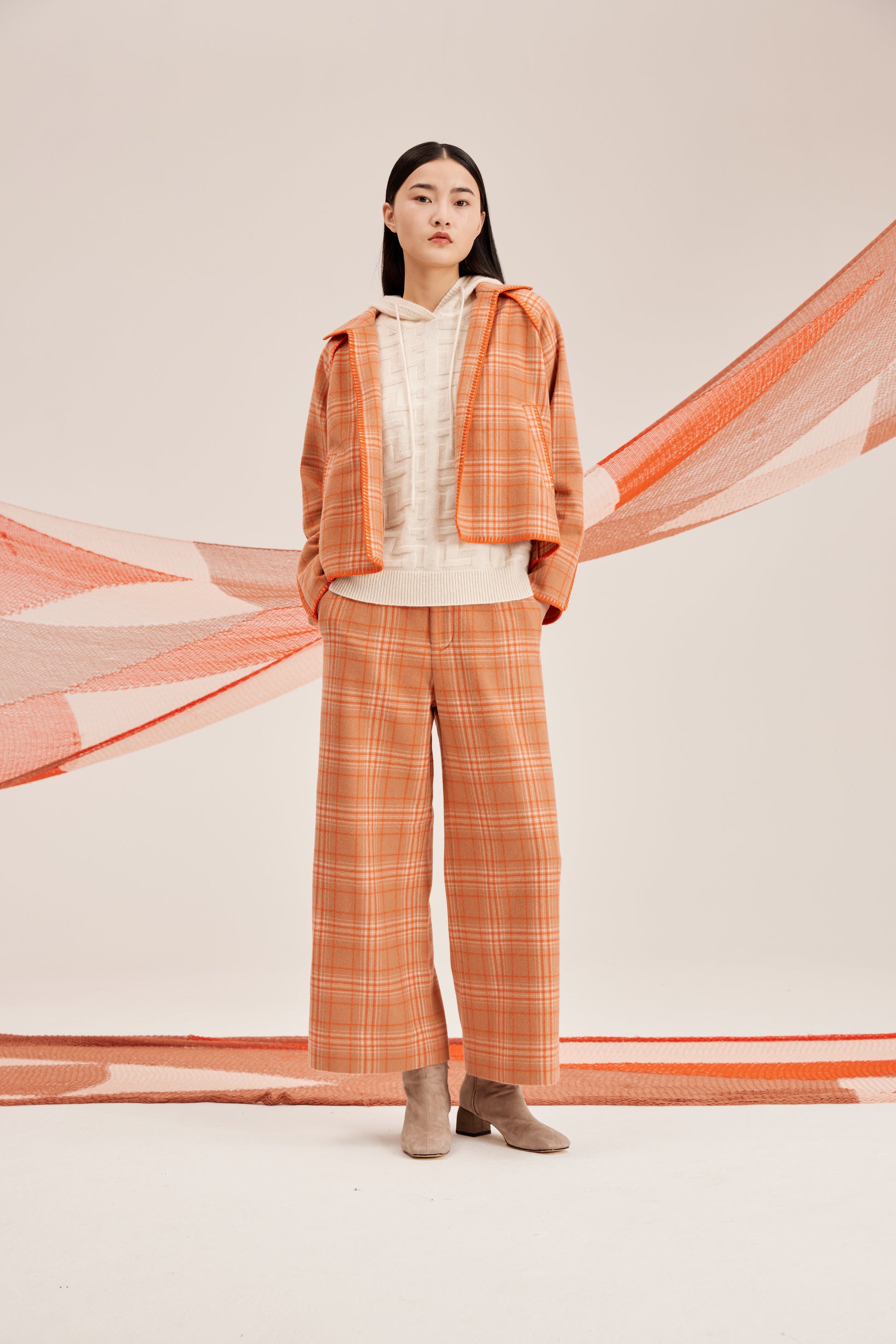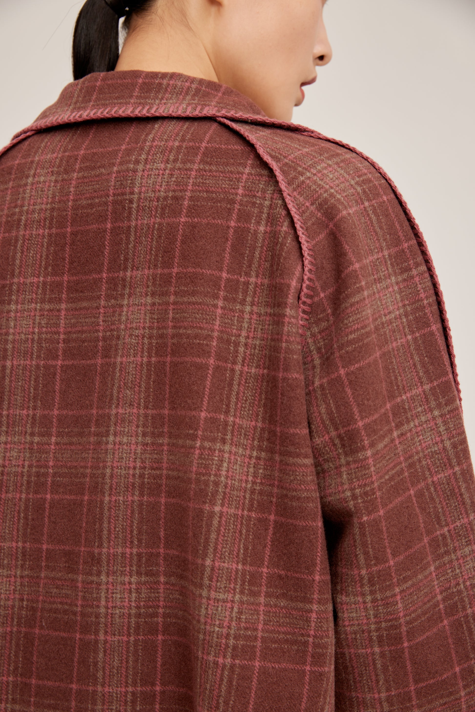 Pure cashmere check pattern coat, turn-down collar, loose fit.