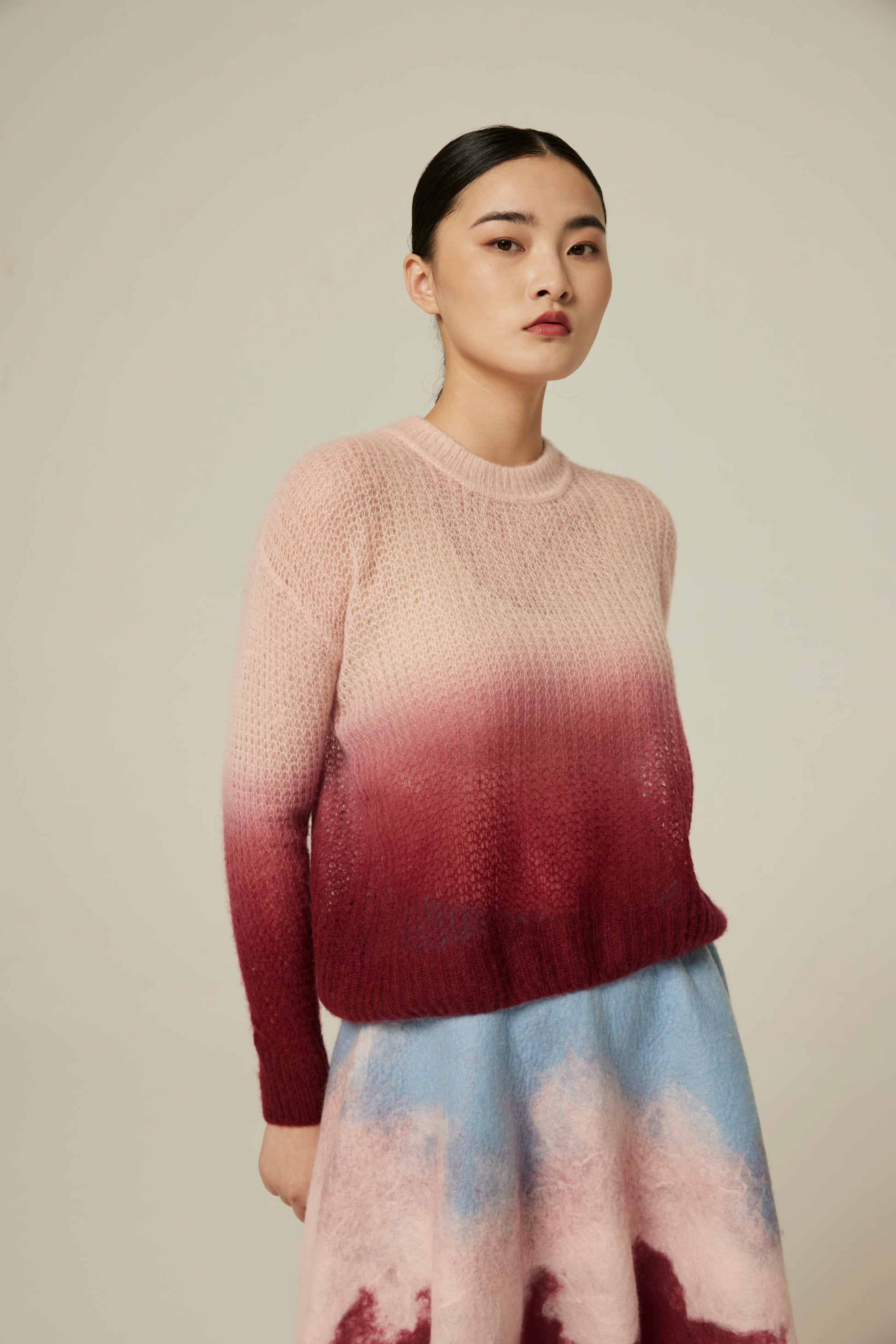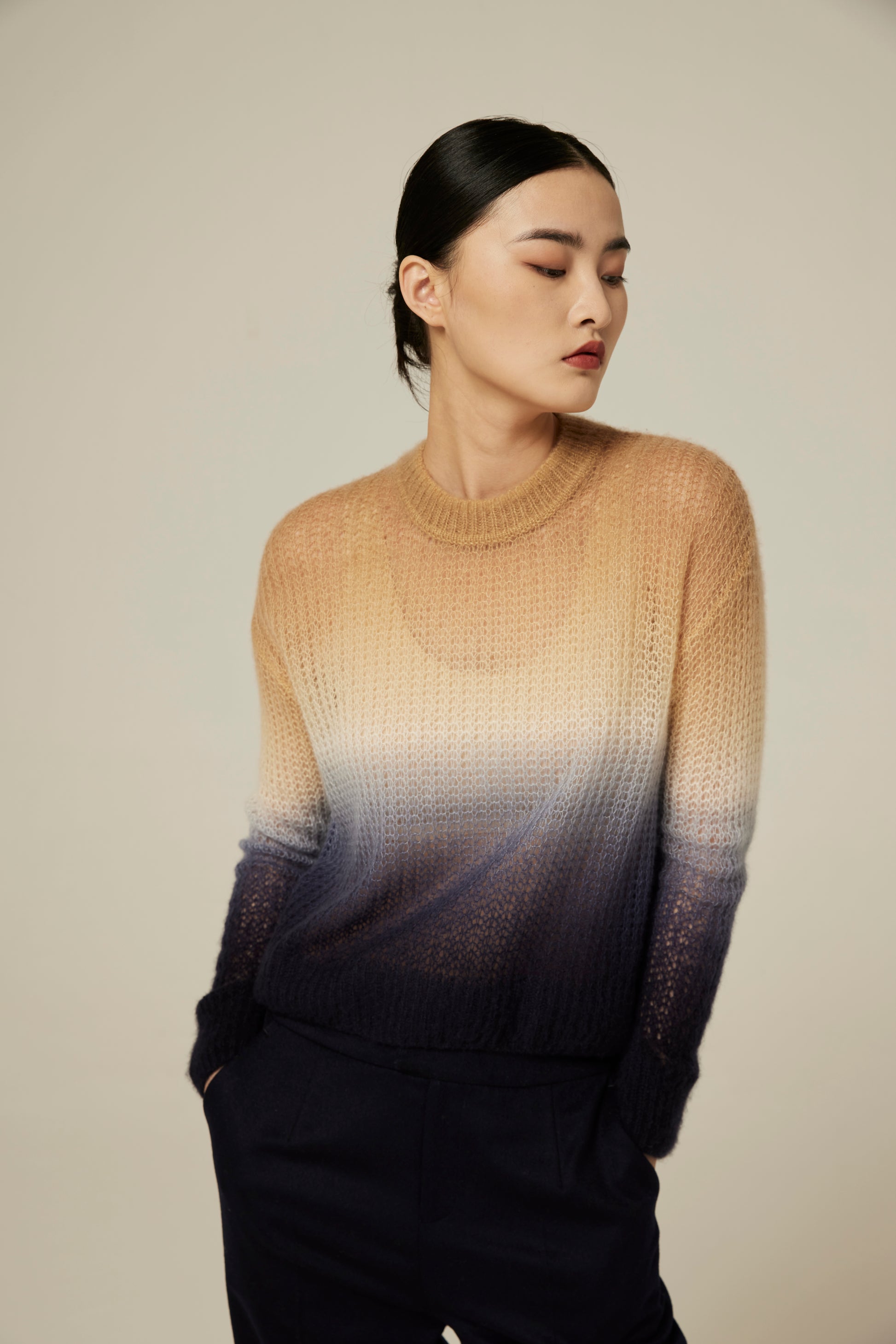 Handcrafted dip-dyed loose density top with 75% cashmere and 25% silk fabric, regular fit.