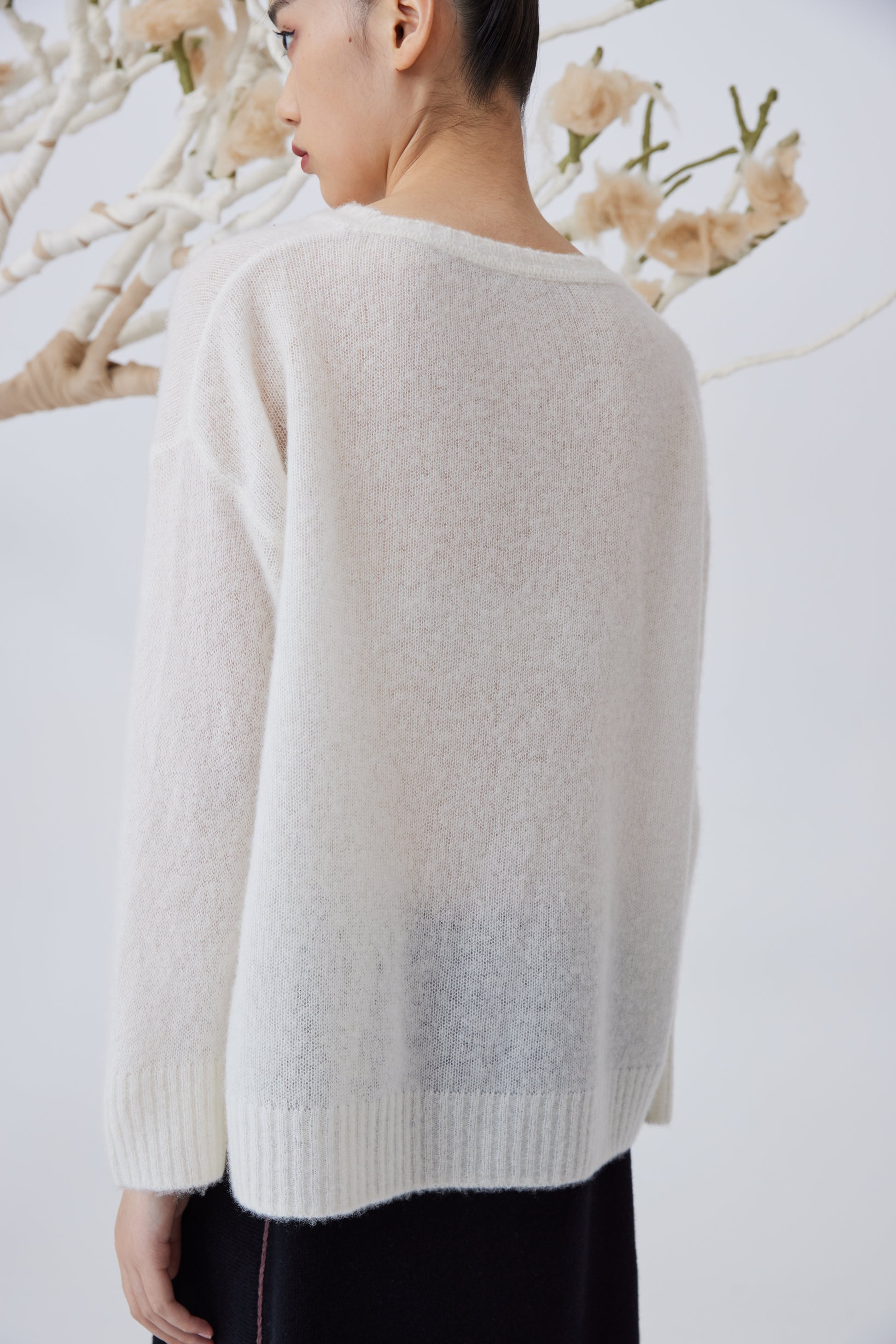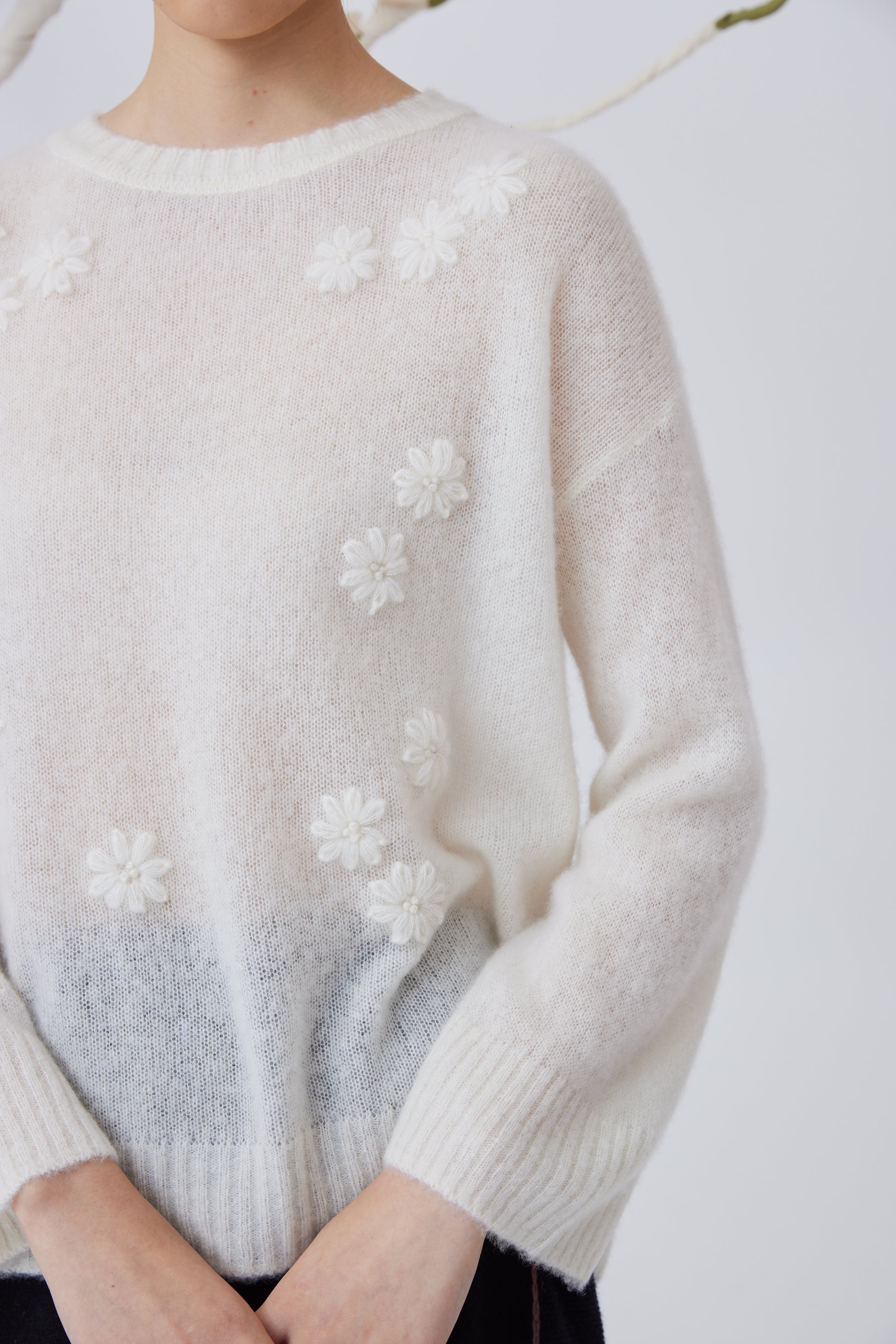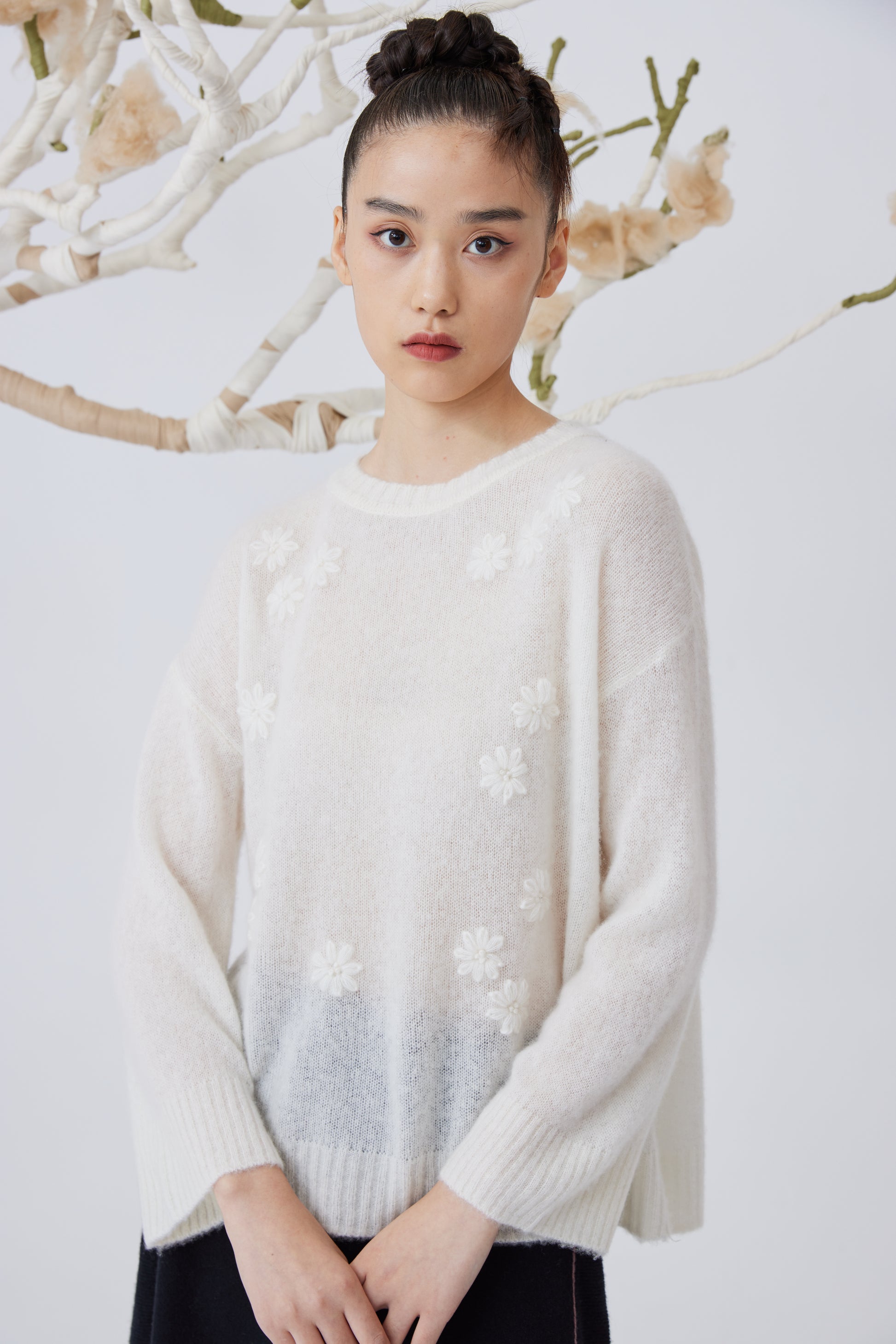 Loose density top with 75% cashmere and 25% silk fabric, handcrafted embroidered flower. Straight open Chinese-style sleeves, regular fit.