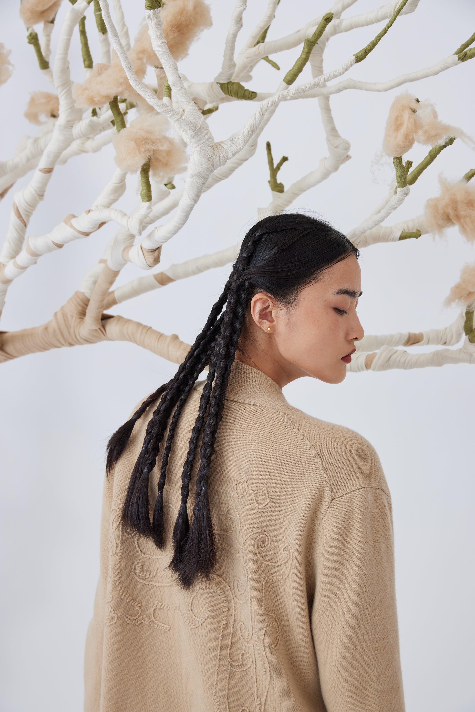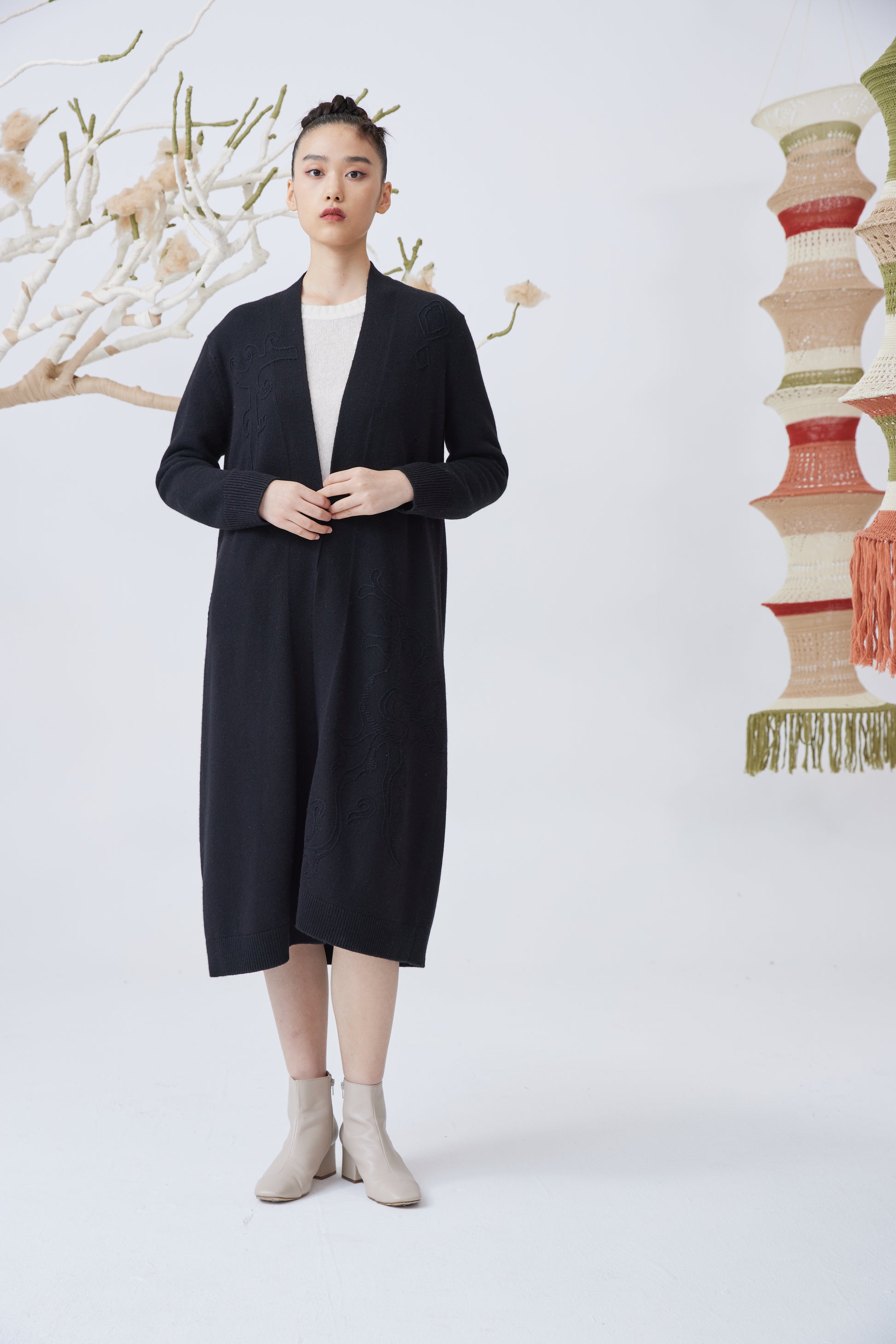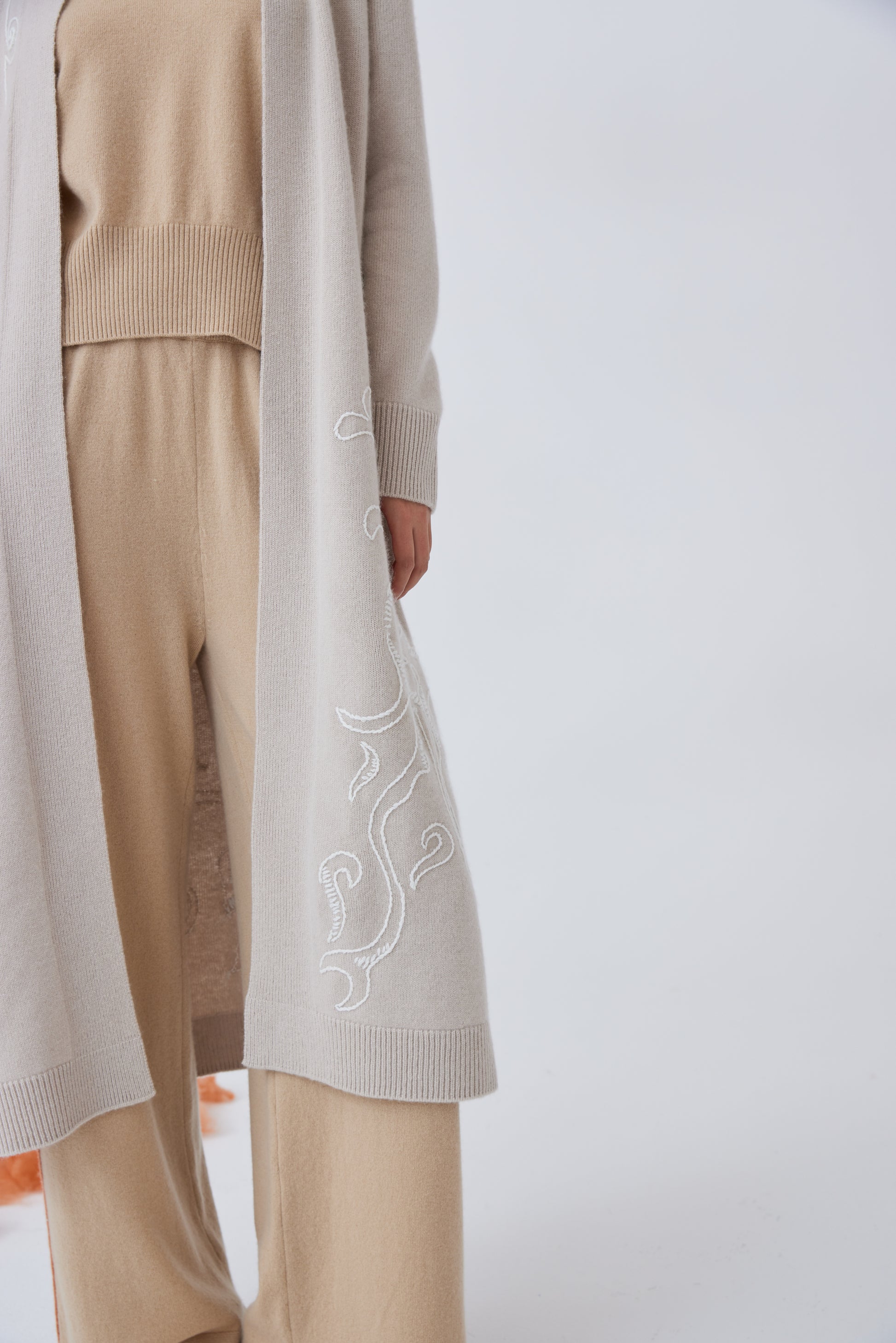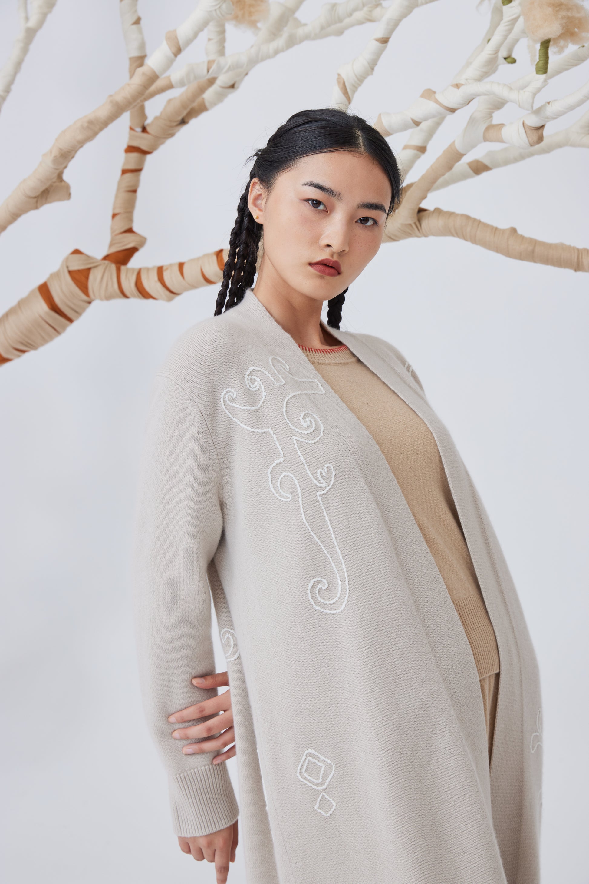 100% heavy cashmere long cardigan with handmade embroidered pattern of traditional phoenix. Part of the "Girls for Girls" women supporting project of Sandriver.