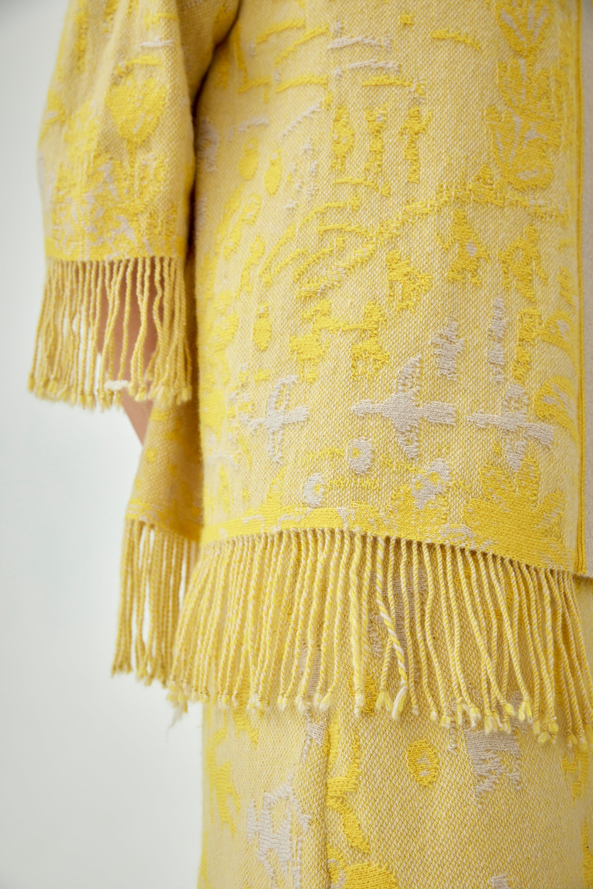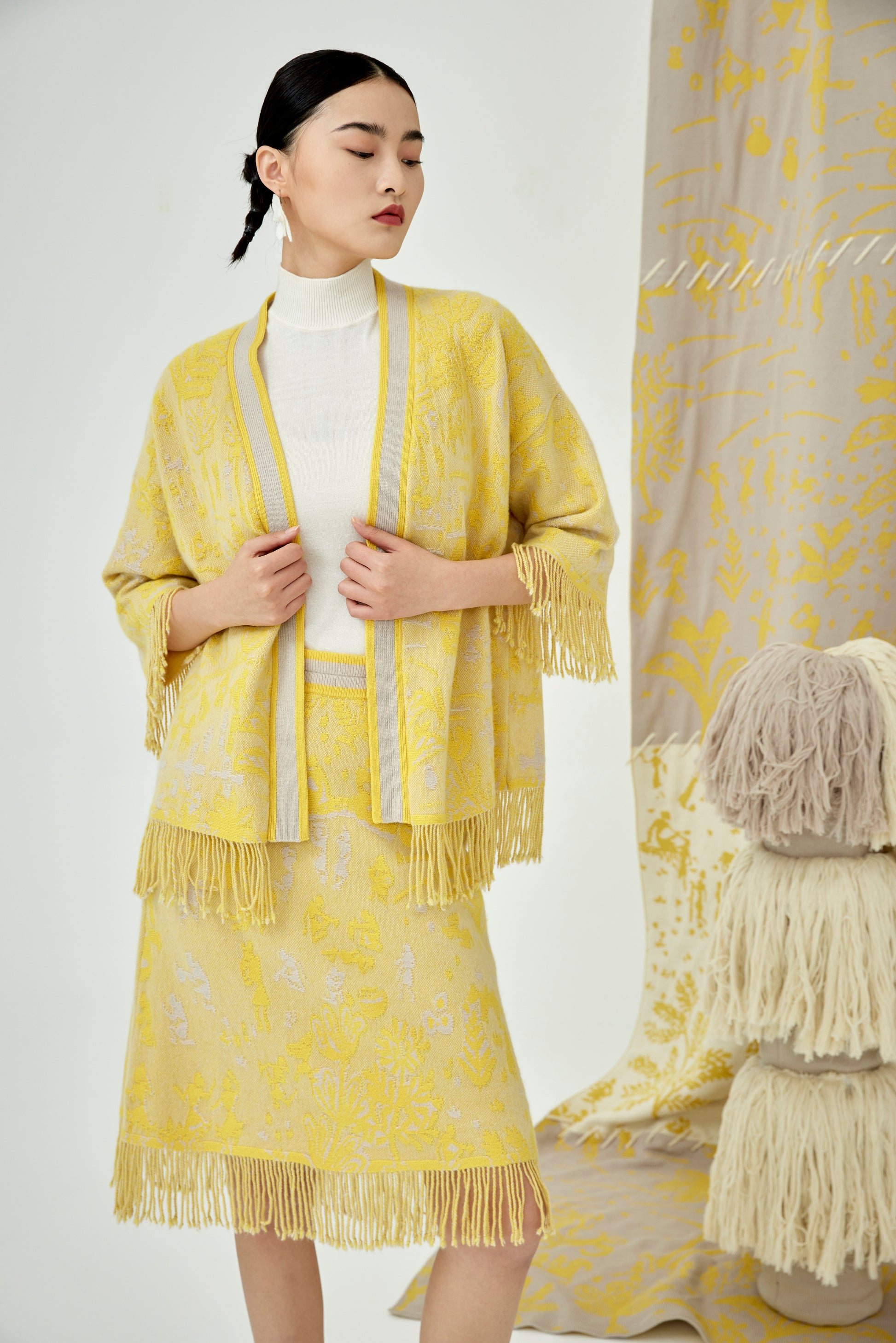 100% cashmere cardigan featuring handcrafted tasseled edge, jacquard pattern comes from traditional Chinese phoenix, mid-length sleeves.