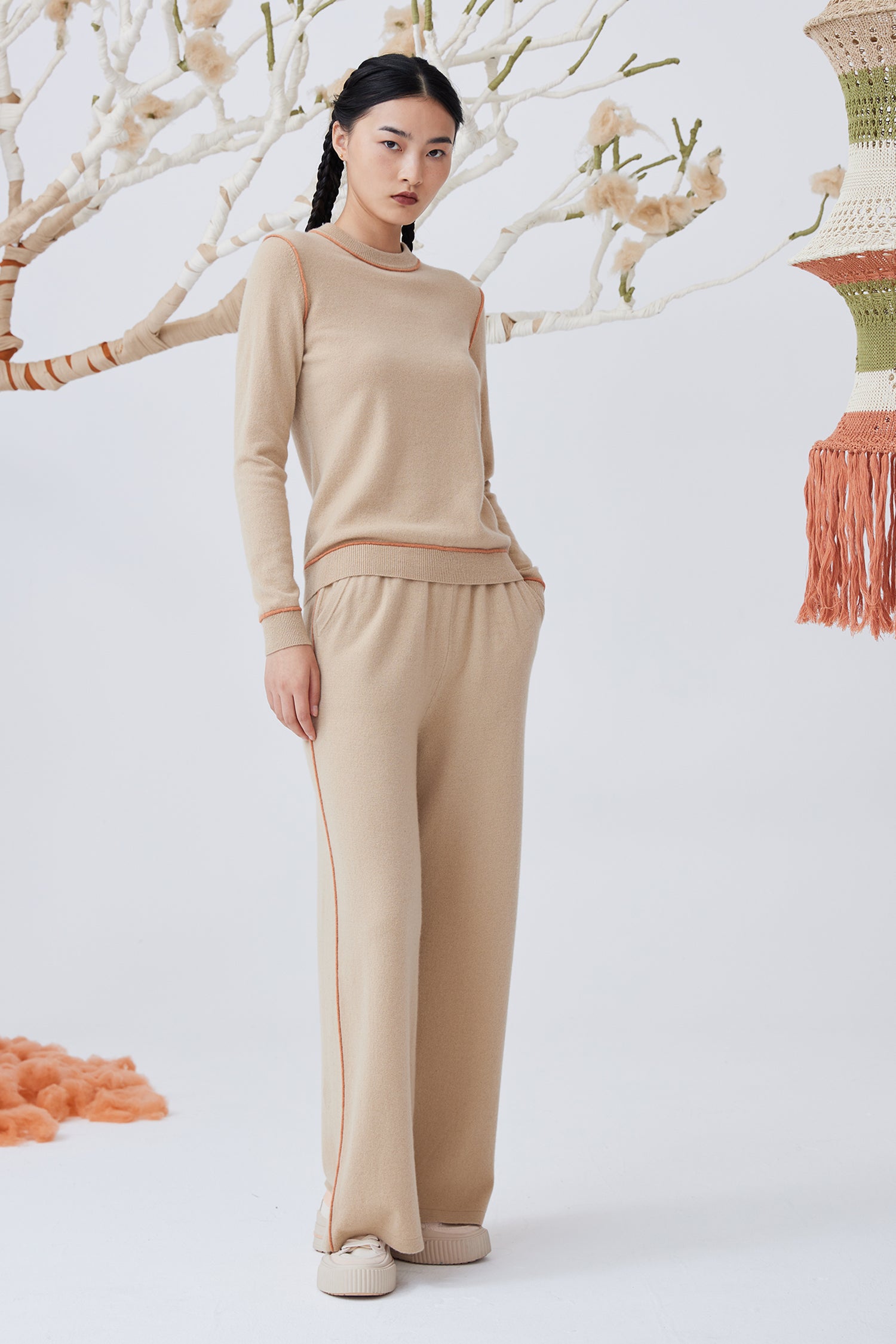 100% cashmere, stretched and knitted straight-leg trousers with slant side pockets. Colored stripes on the sides, and elastic waist.