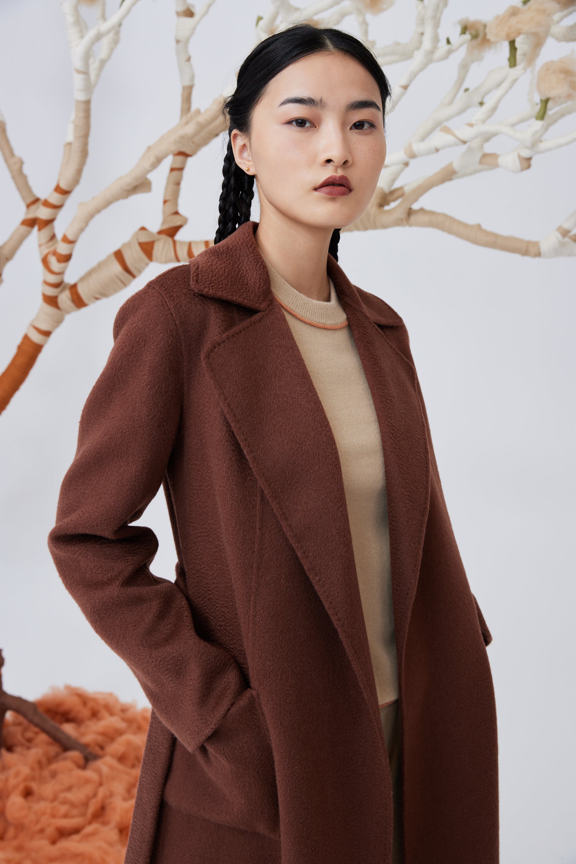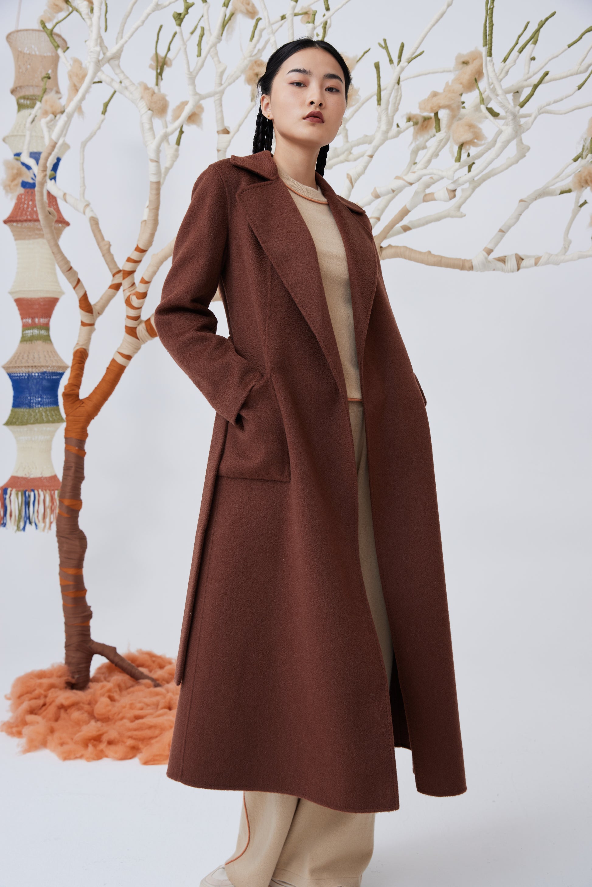 Hand-sewn double-faced long sable cashmere coat featuring a laple collar, patch pockets and a matching belt.