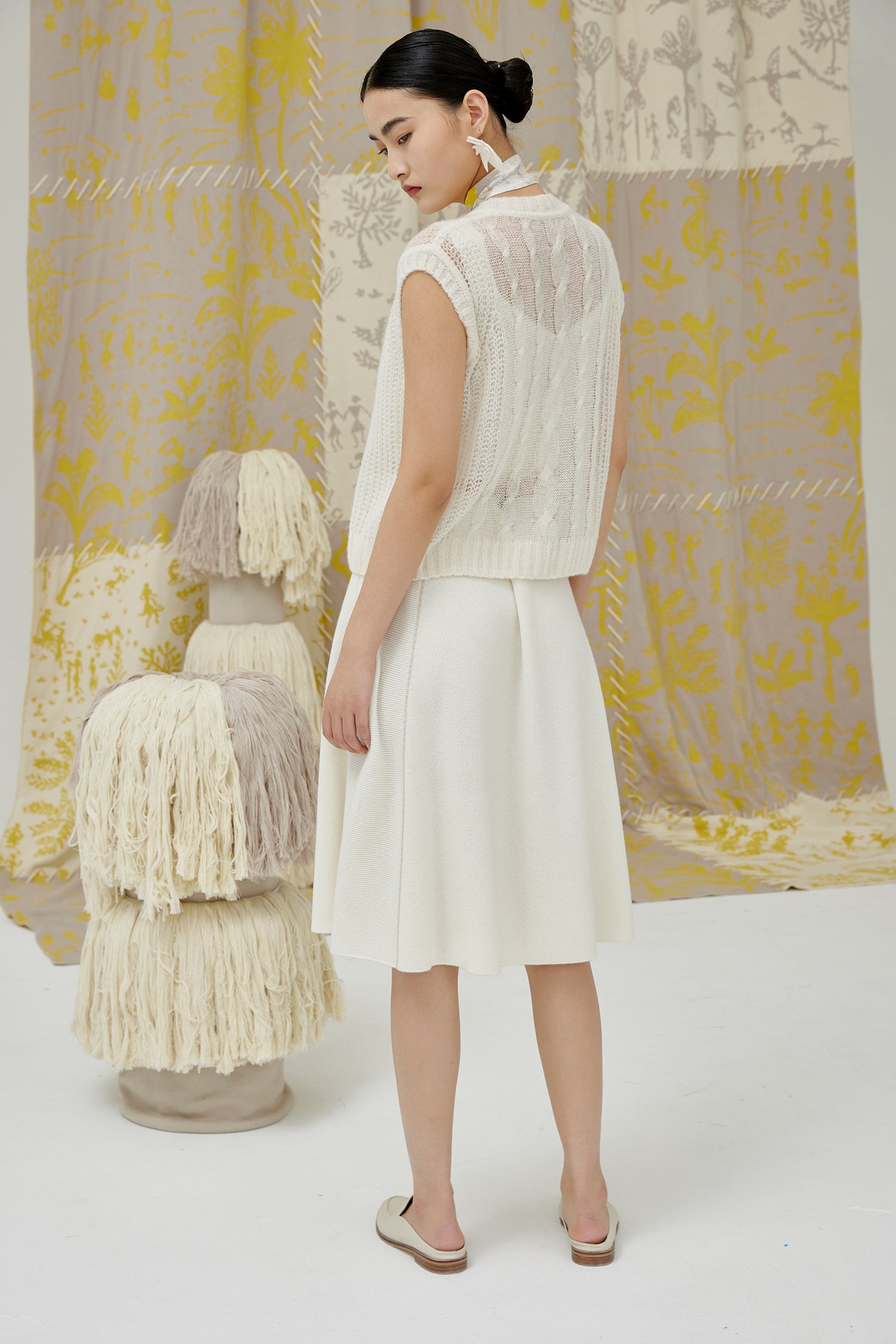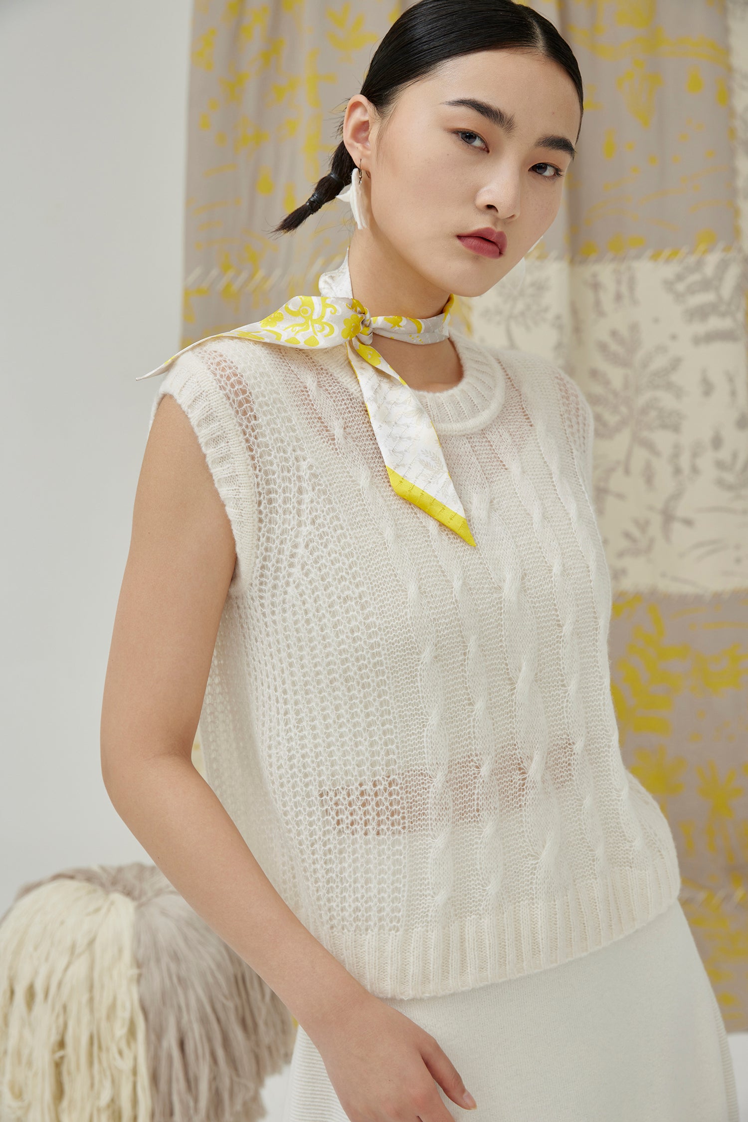 A light weight vest top featuring crewneckline, semi-sheer construction, sleeveless. Loos fit, drop-shoulder design.