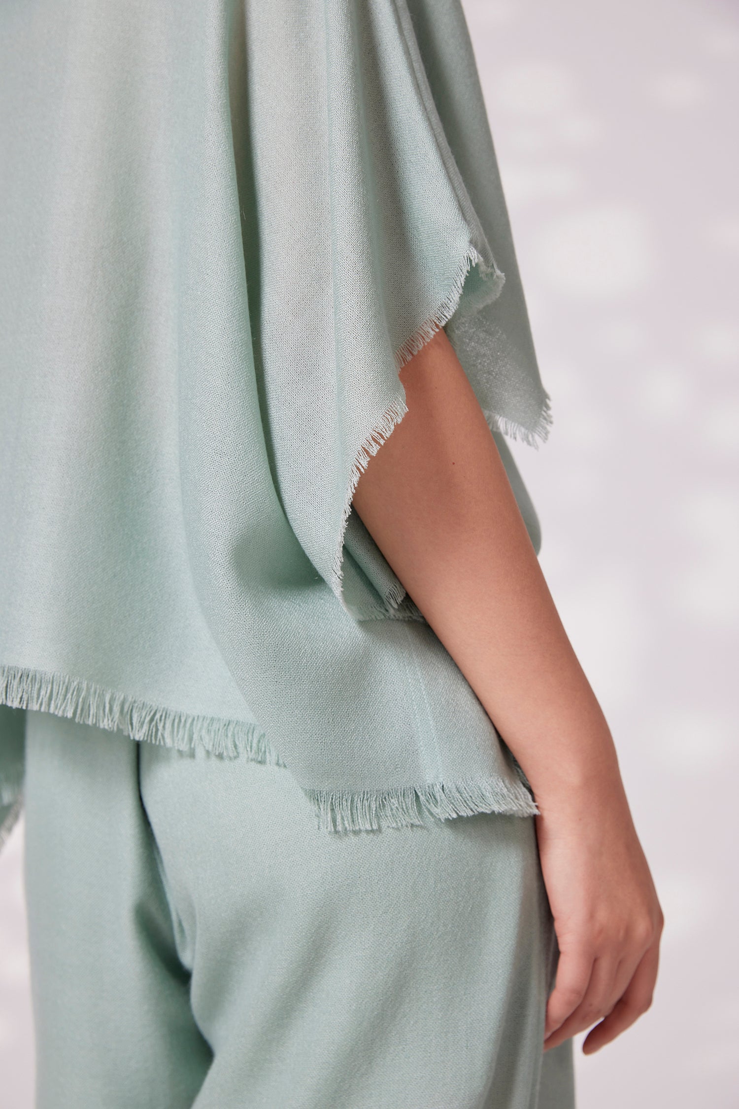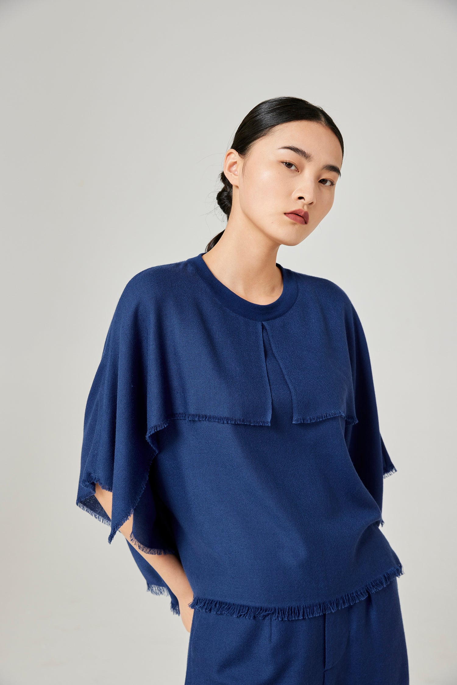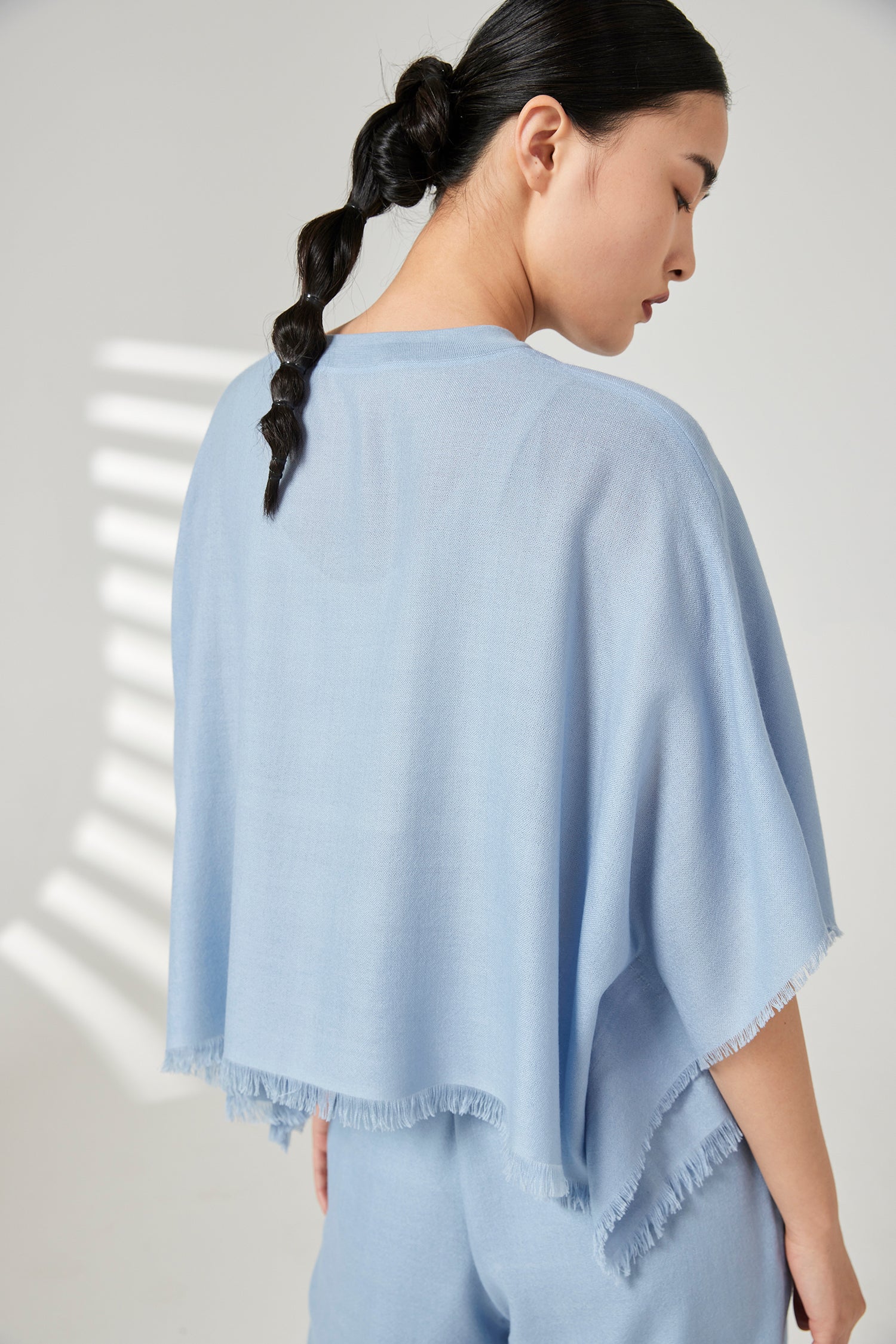 Super fine cashmere loose-fit cape-style top featuring short sleeves. A crew neckline, hand-made fringed edge.