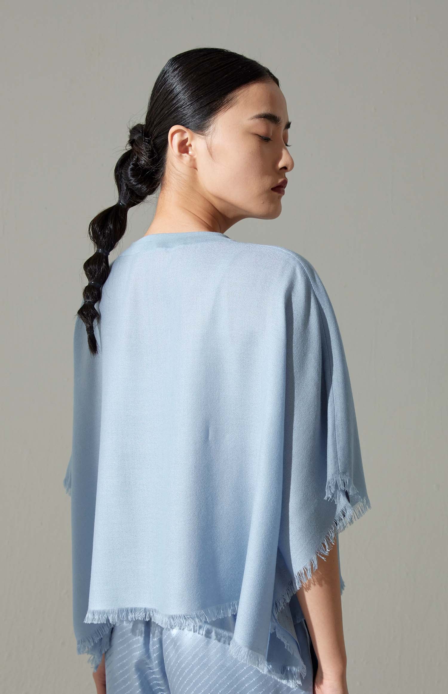 Super fine cashmere loose-fit top,  pure silk front panel, which jacquard by Mongolian character "zero" that stands for the idea of "Zero Waste" of Sandriver, joined with pure cashmere front flyer and back panel. A crew neckline, hand-made fringed edge.