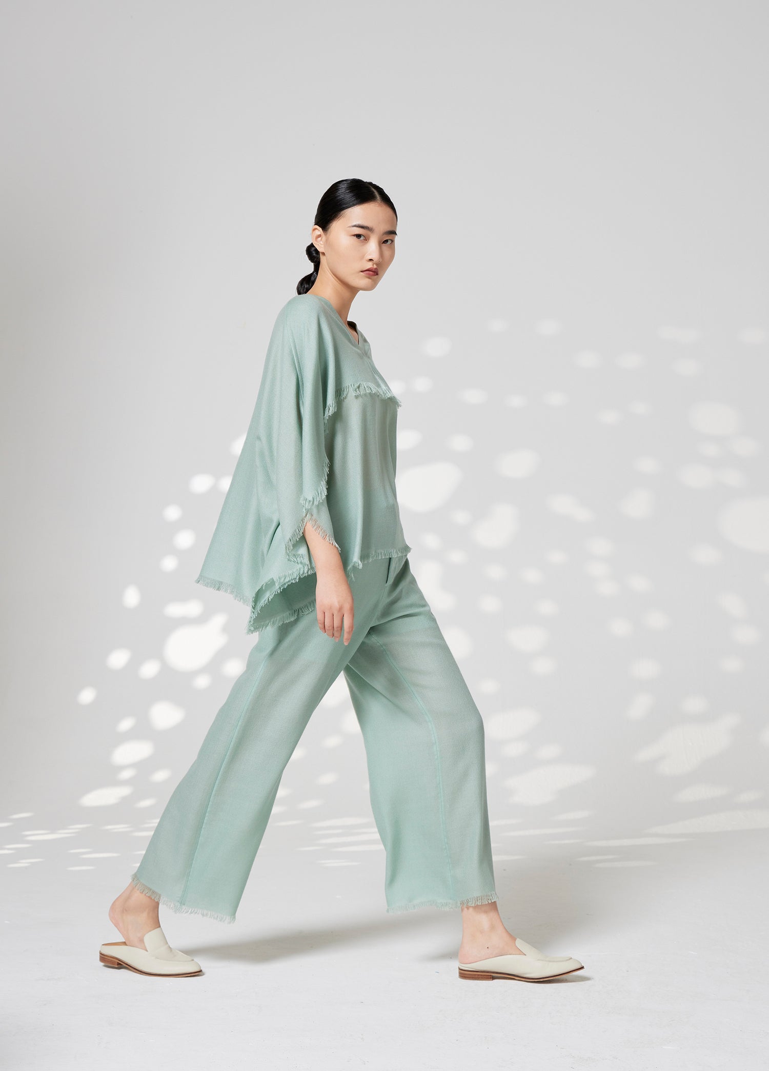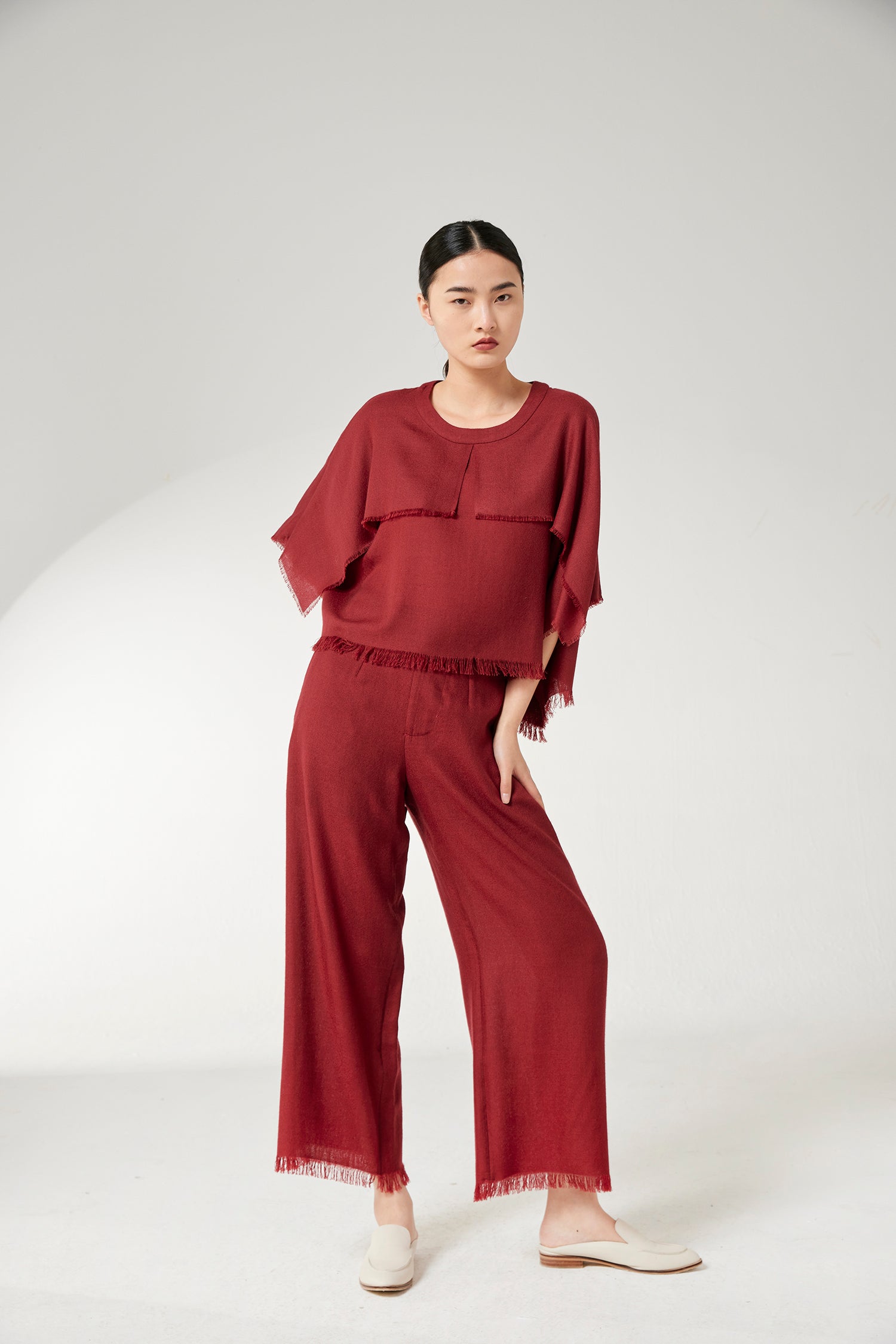 Super fine cashmere wide-leg trousers, fringed edge detailing. High waist, two side slit pocktes.