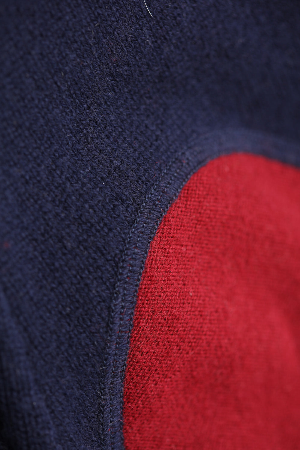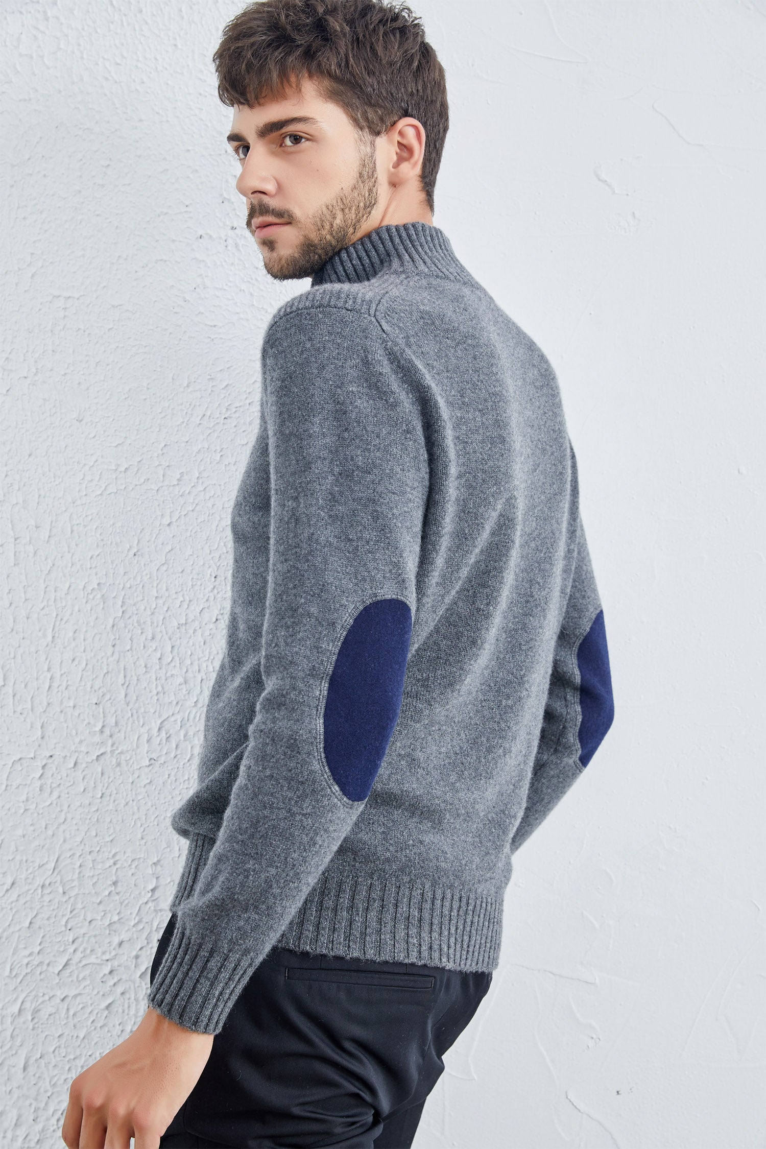 This is a stylish men's cashmere sweater in a deep navy blue. It features a stand-up collar with a partial zip closure. The sweater has long sleeves with ribbed cuffs and a ribbed hem. A contrasting burgundy or dark red elbow patch adds a touch of visual interest to each sleeve. The overall look is sophisticated and comfortable.