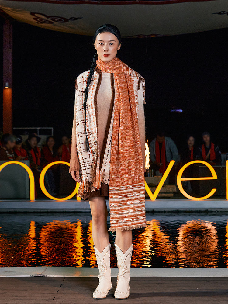 Traditional hand-twisted cashmere yarn is presented on Pulu (Tibetan woolen fabric) using brocade weaving techniques,...