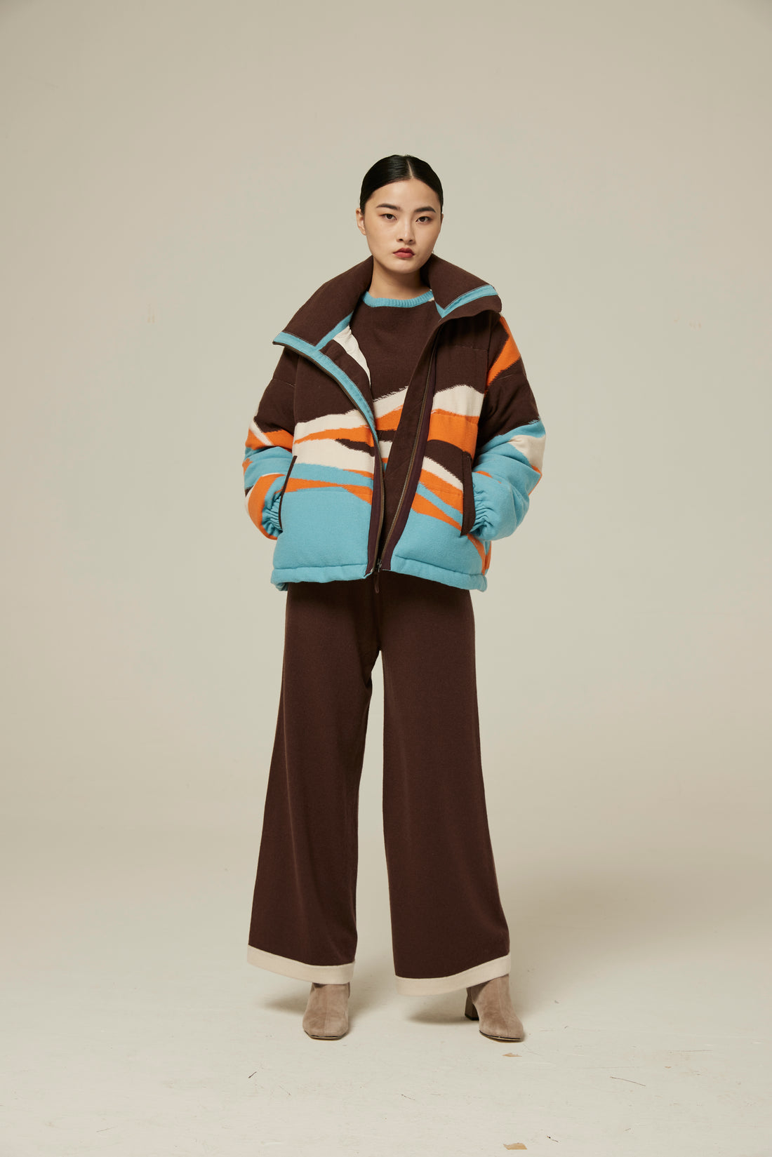 Pure cashmere covered puffer jacket, concealed front zip fastening, featuring elasticated hem. Logo knitted on...