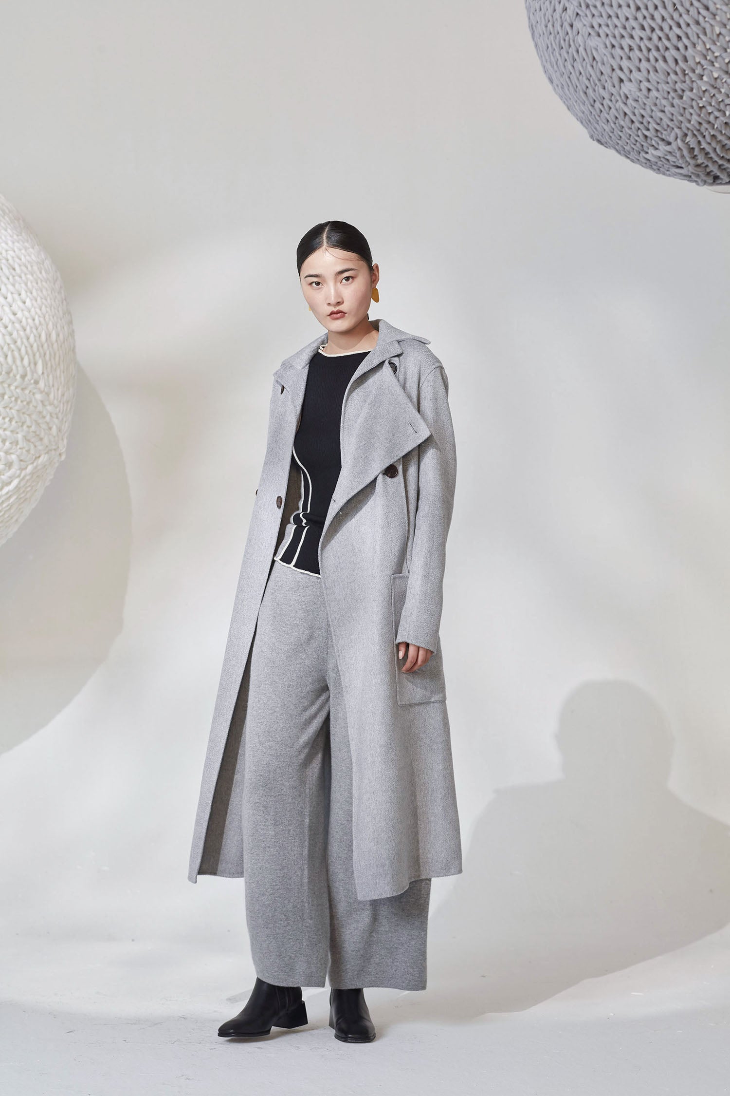 Double-breasted trench coat crafted from pure cashmere. Styled with lapels and collar with high splits at the back, it features a reversible fabric and hand sewn details.