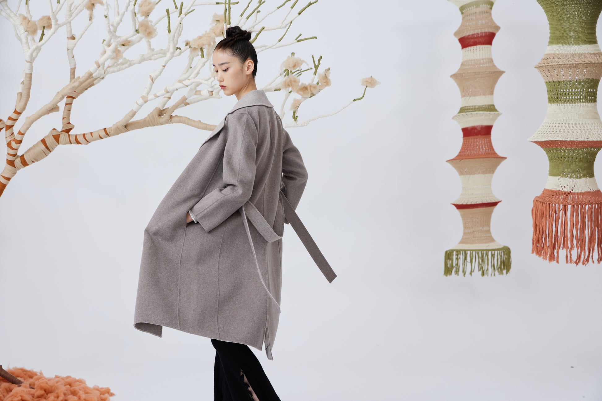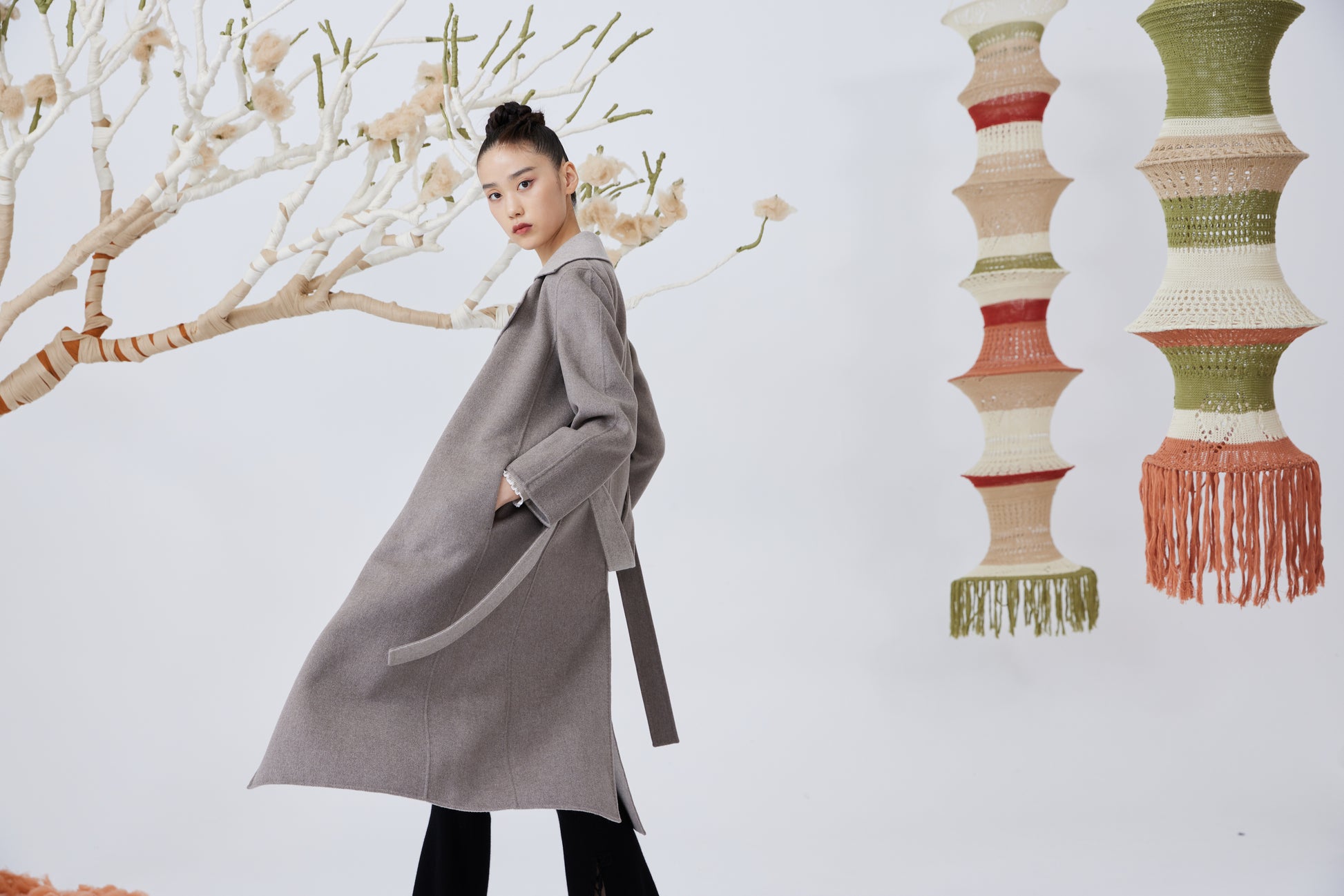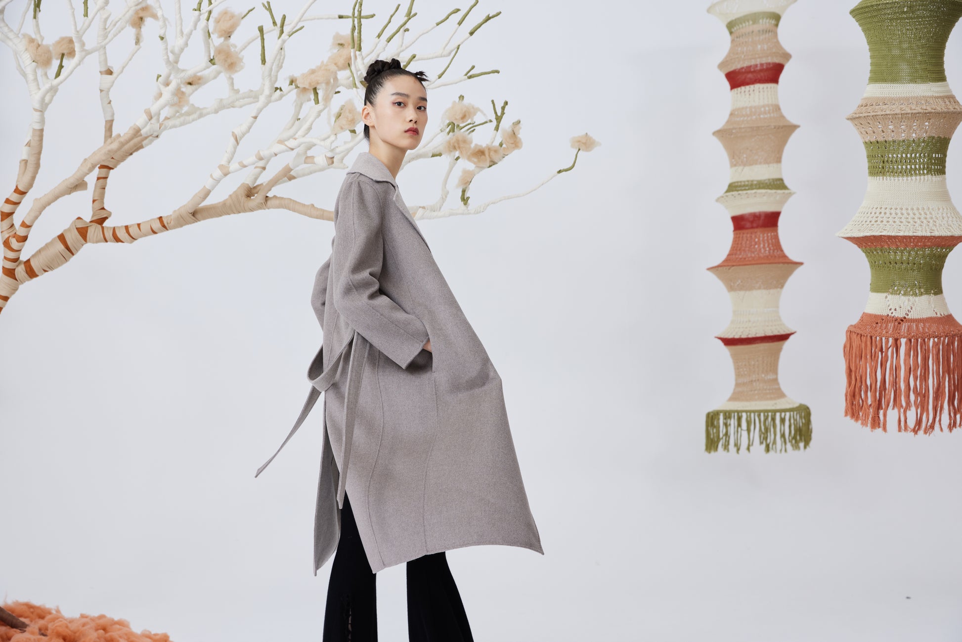 Indulge in the luxury of our double-sided cashmere coat. Its elongated silhouette with high back splits create a striking, modern look. The off-the-shoulder necklines and meticulous hand-sewn details add a touch of refined elegance.