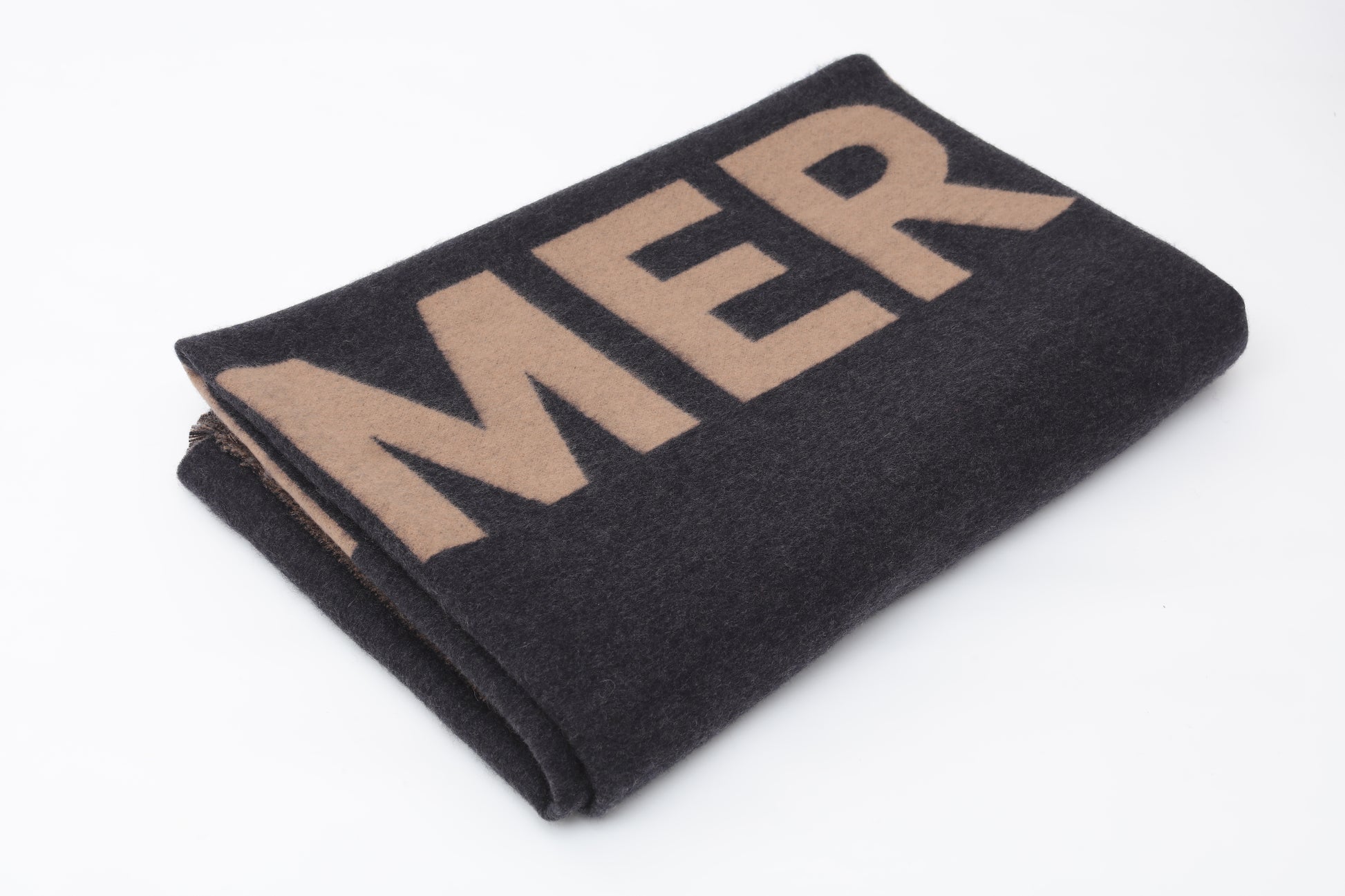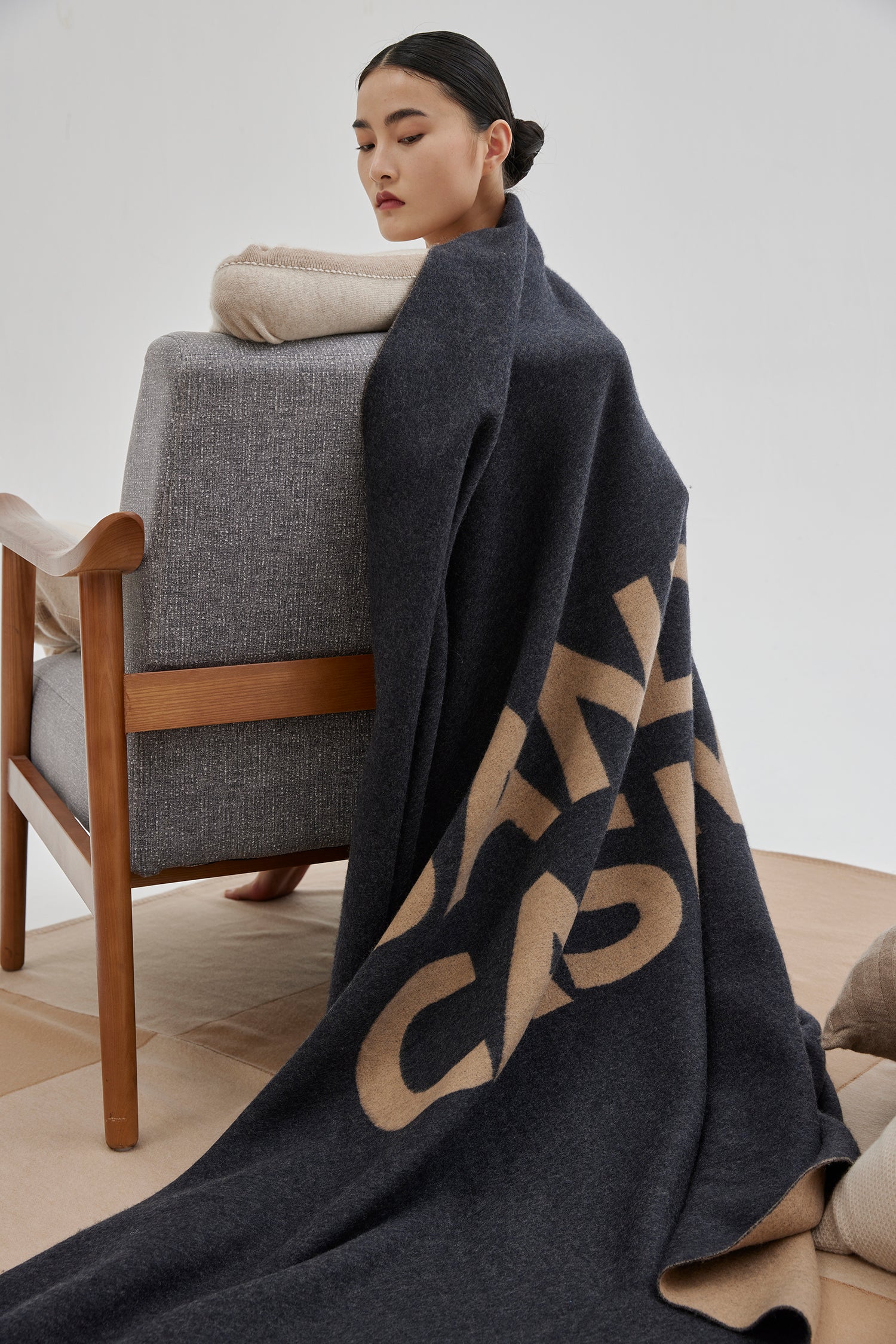 Double-sided cashmere blanket jacquard with logo, featuring fringed edge. Relatively light weight, natural and warm color, a perfect fit for domestic life and travel.