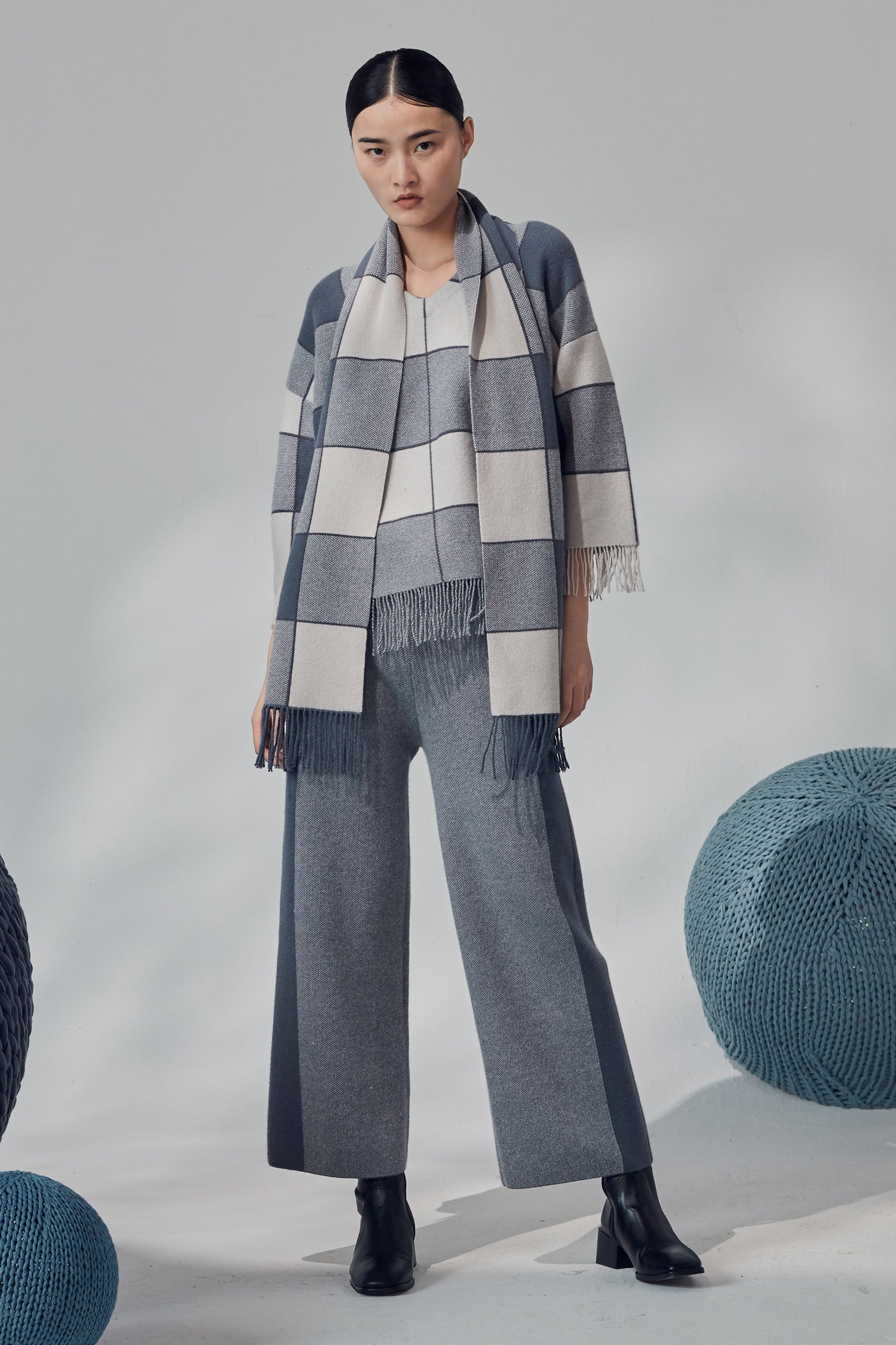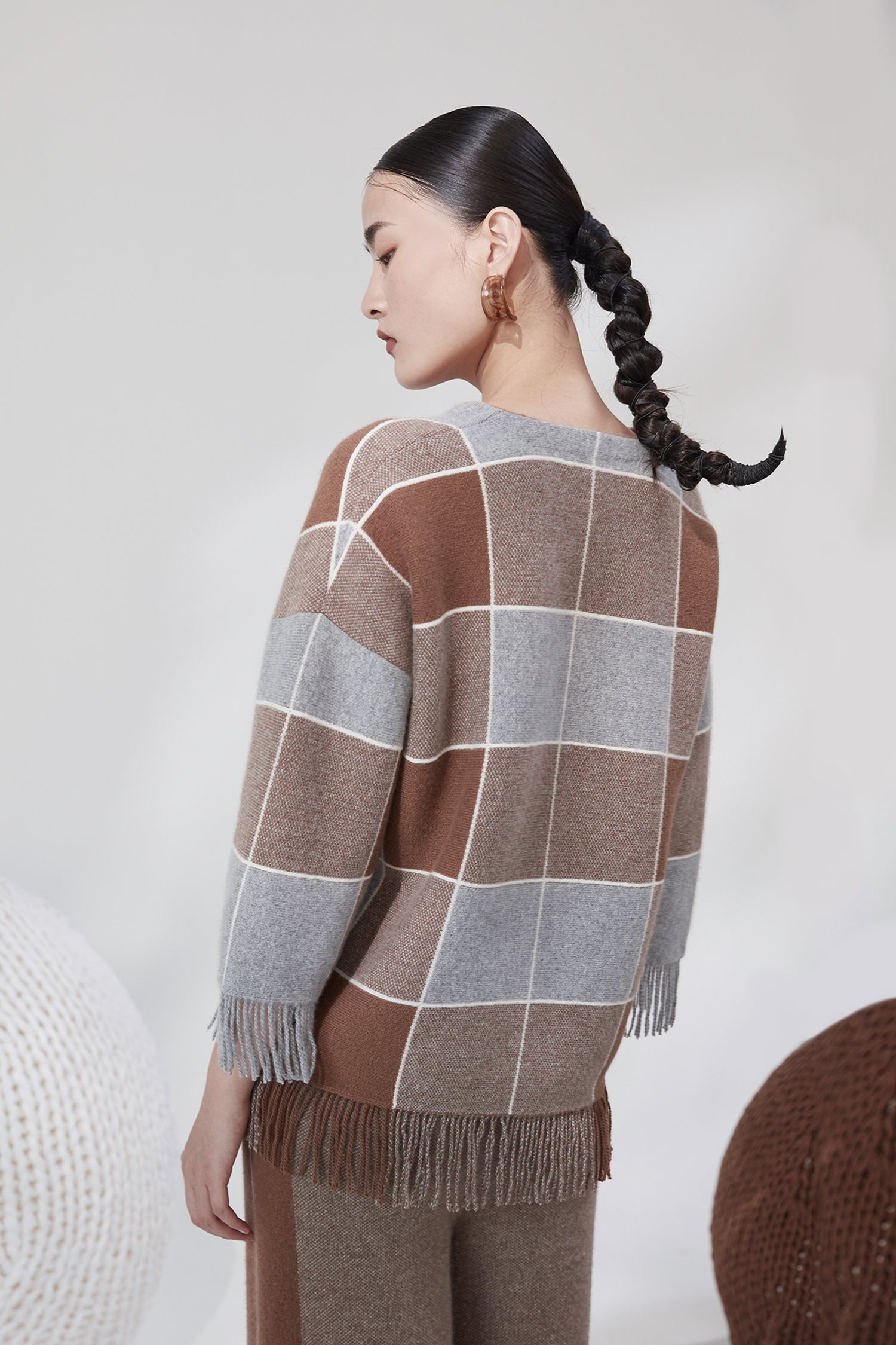 Boxy cut extra thick sweater knitted with jacquard. Styled with check pattern and a v-neckline. The tassels along the hem are hand-twisted.