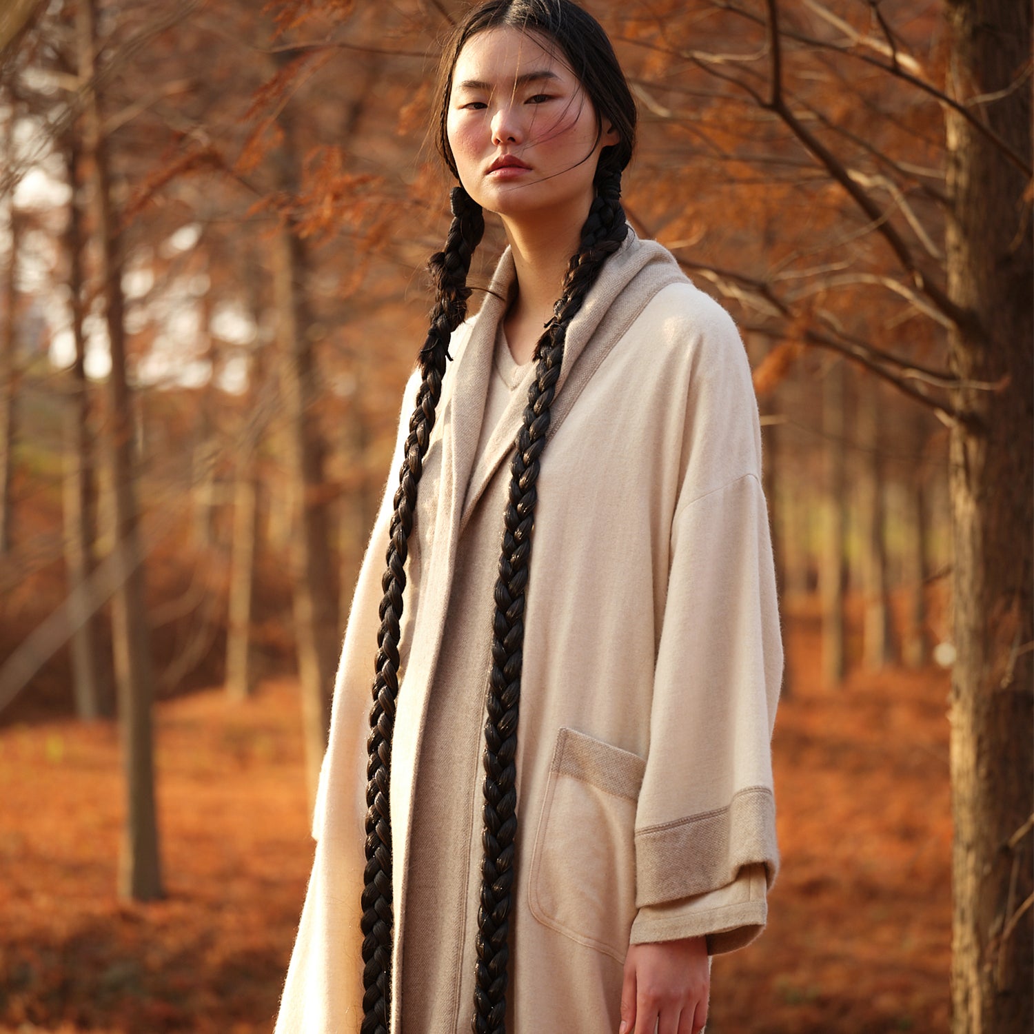 Natural un-dyed woven cashmere robe with knitted trim and patch pockets. Unlined. Fastens with matching belt.