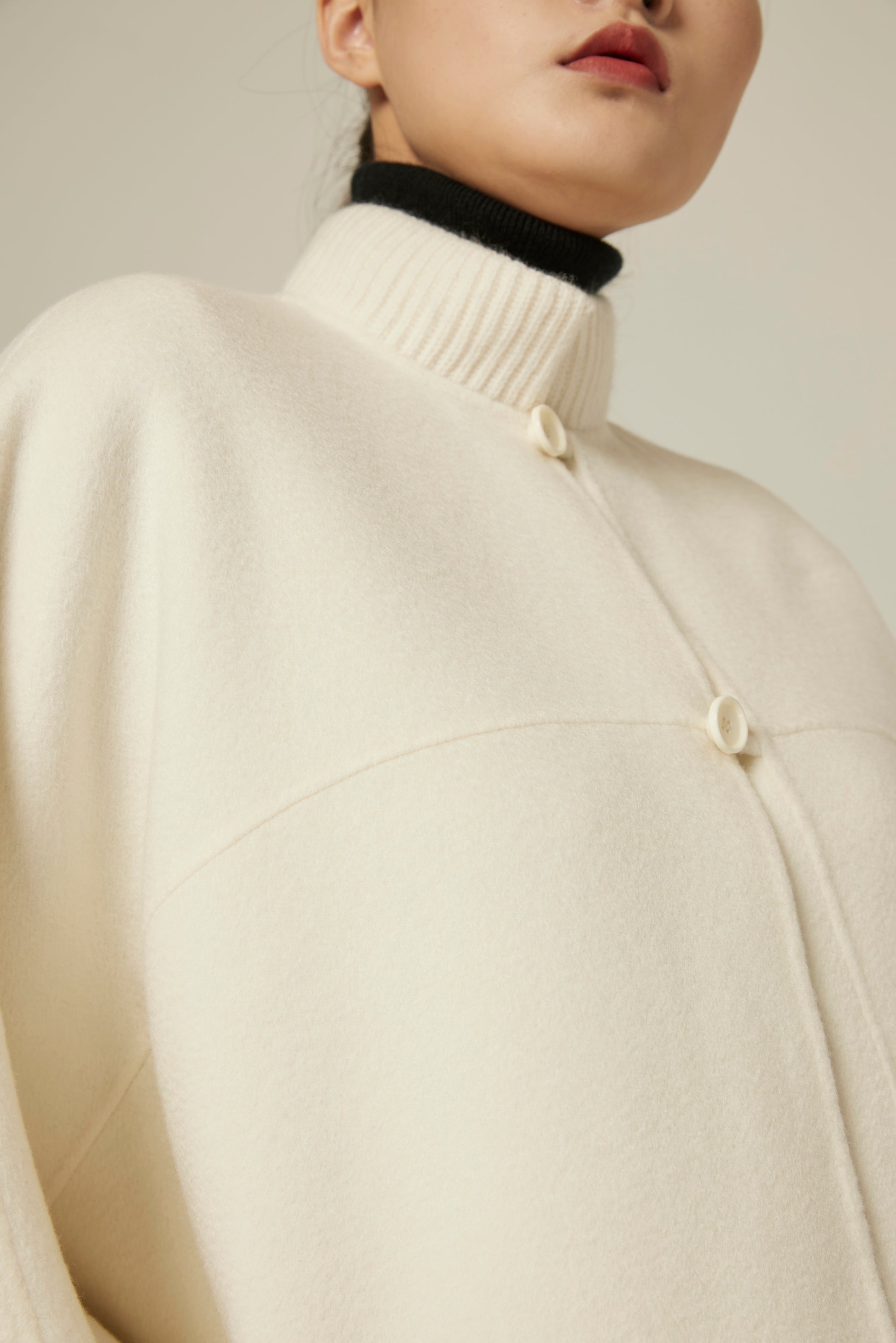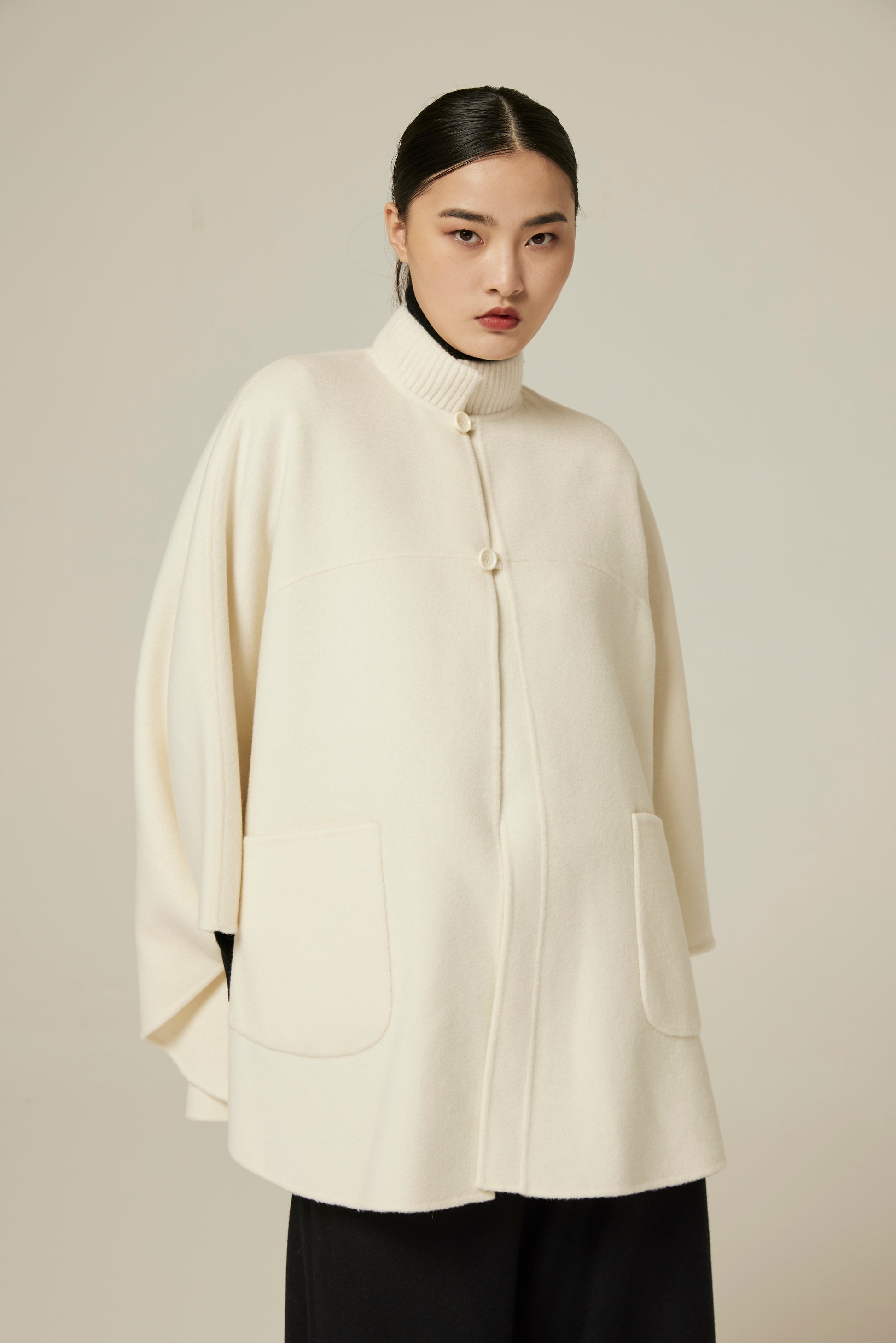 Double-faced sable cashmere, hand-sewn short cloak-type cut featuring a special mandarin collar, welt pockets.
