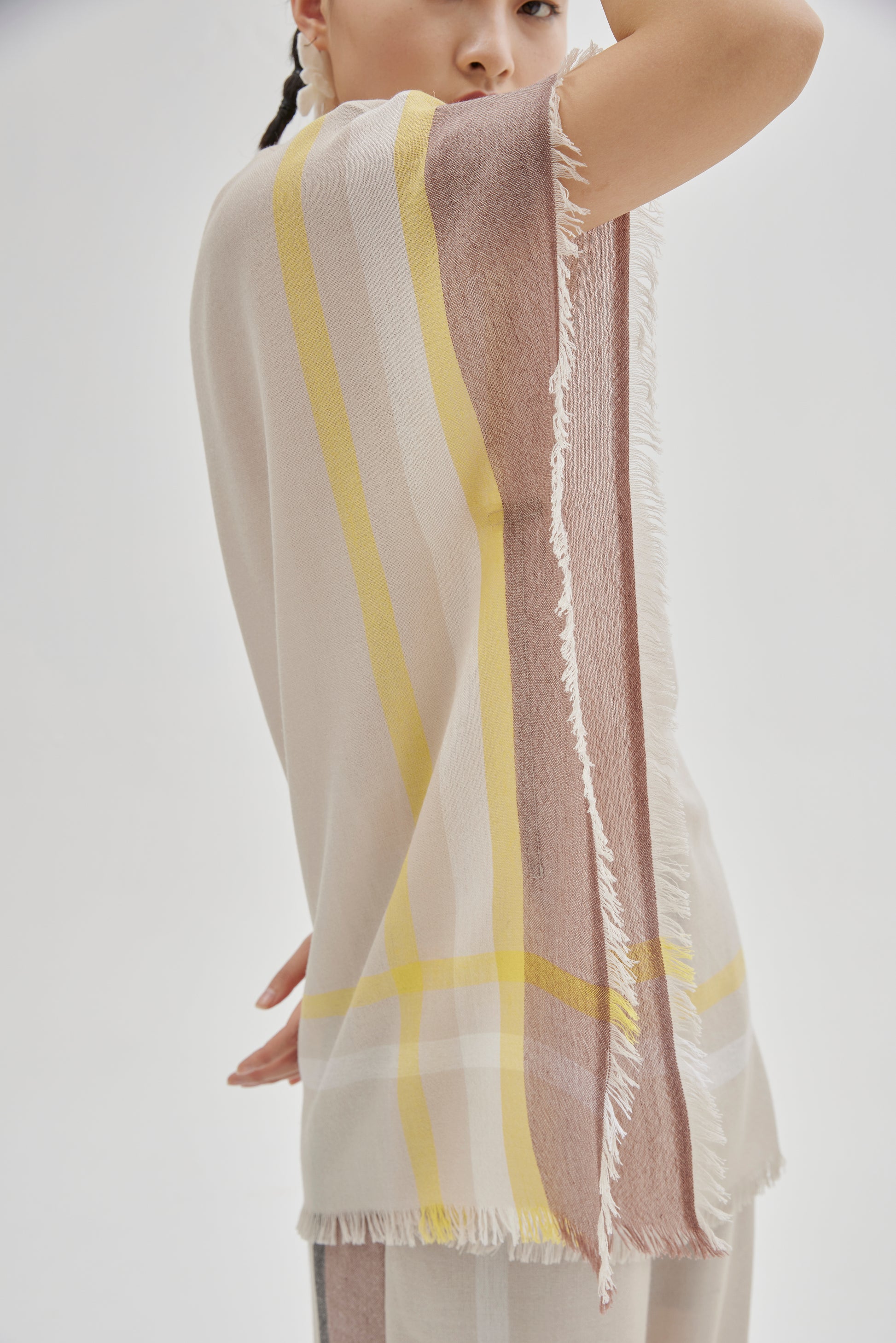 Super fine cashmere loose-fit cape-style top featuring short sleeves. A crew neckline, hand-made fringed edge, colored-stripes design.