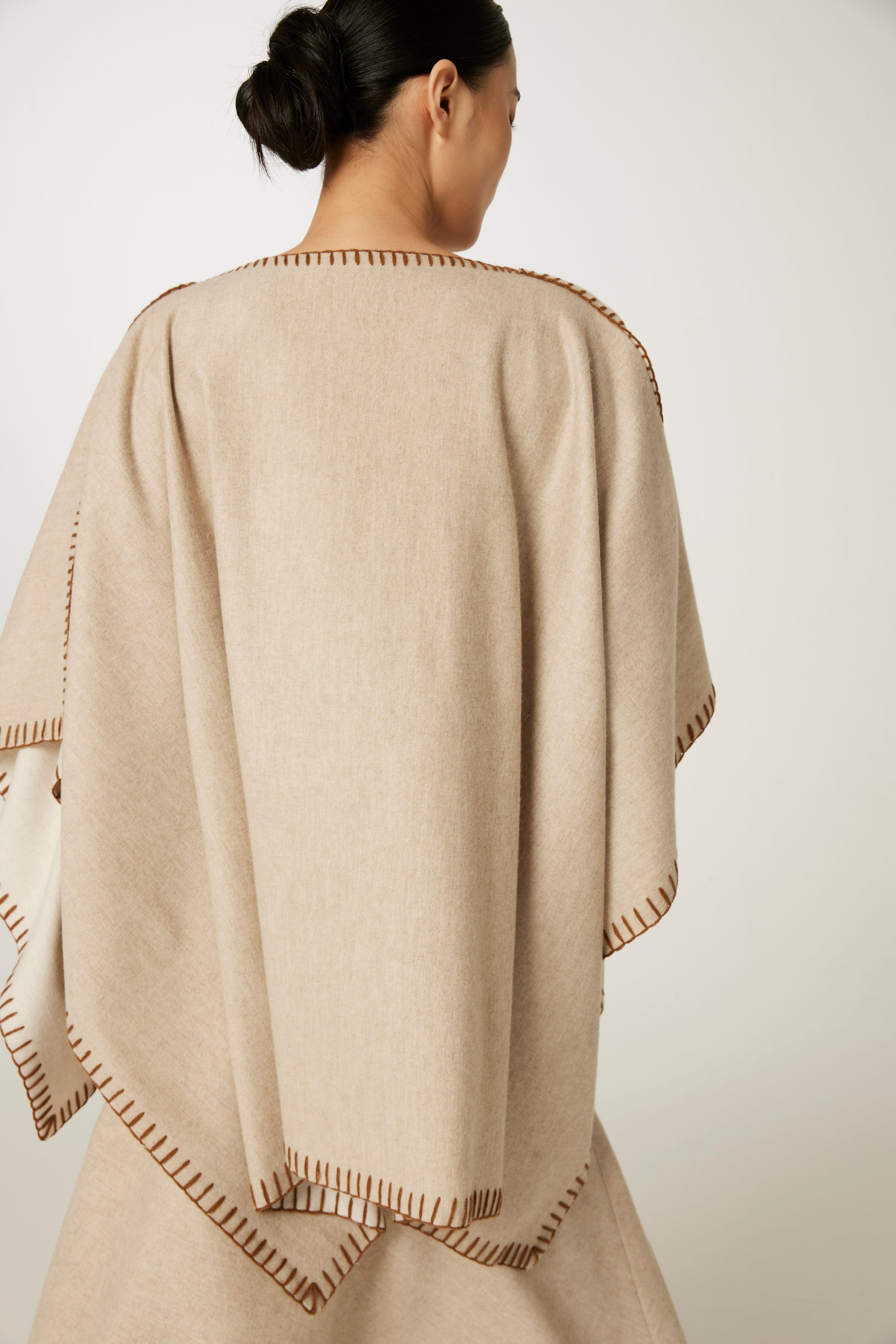 100% cashmere crewneck cloak top, delicate two-sided fabric, featuring hand-sewed hem.